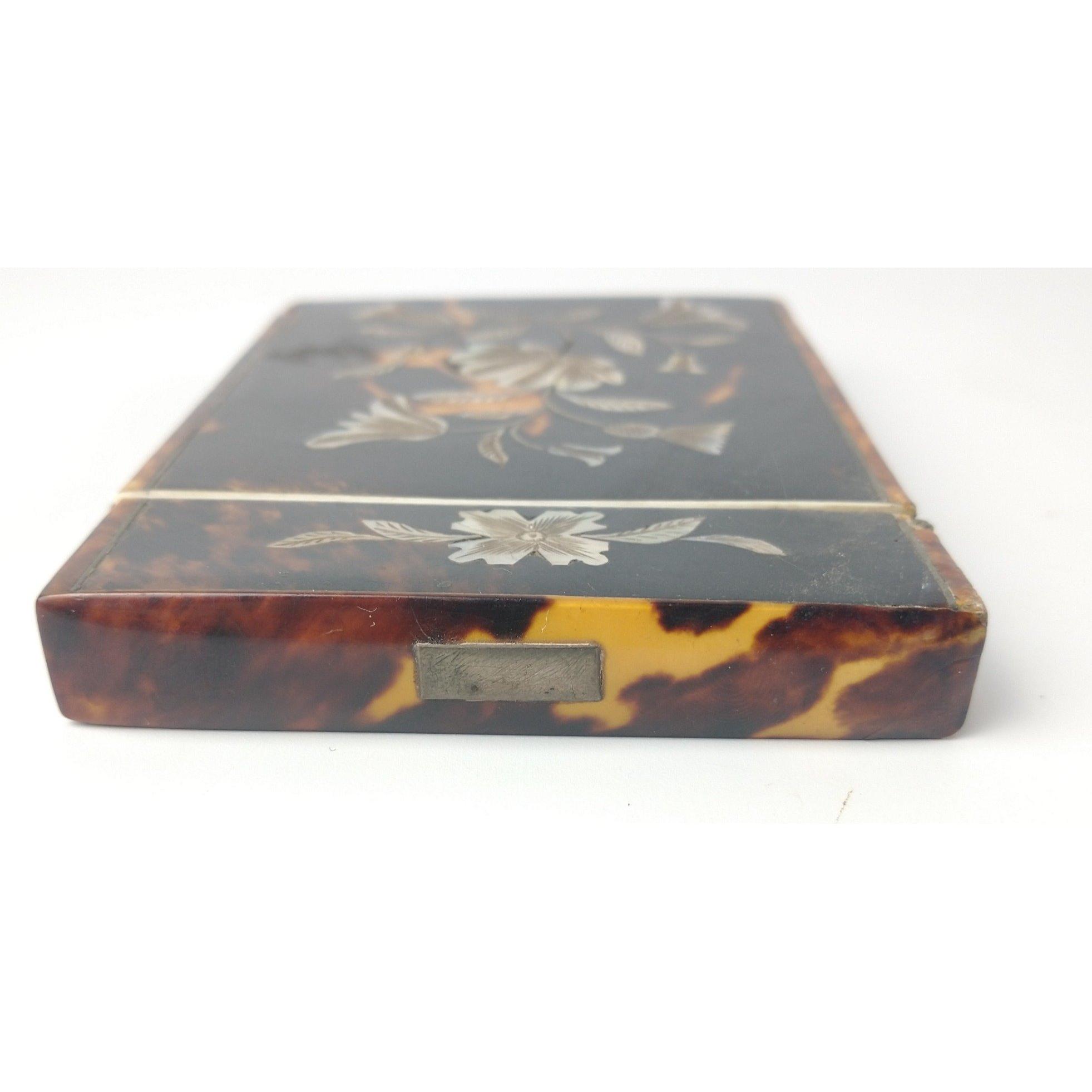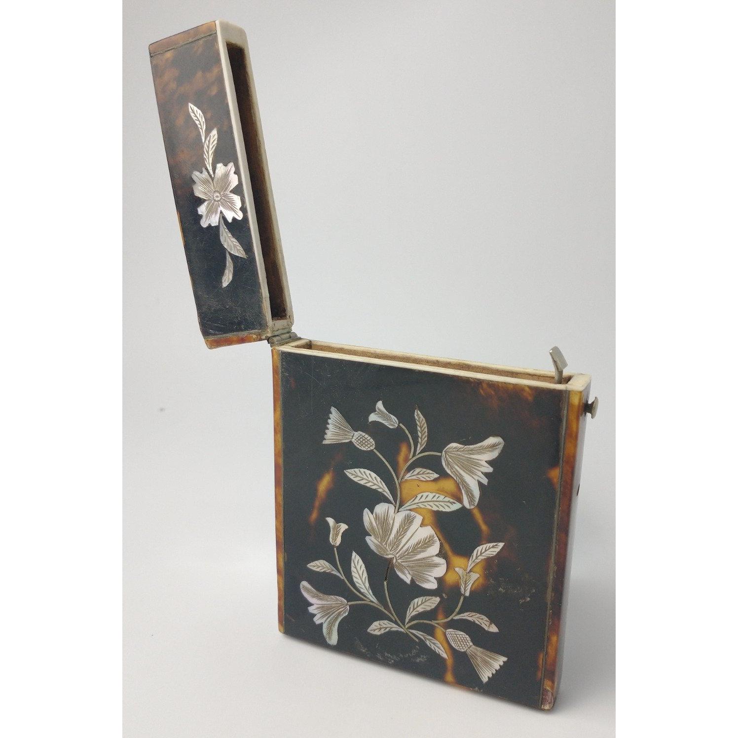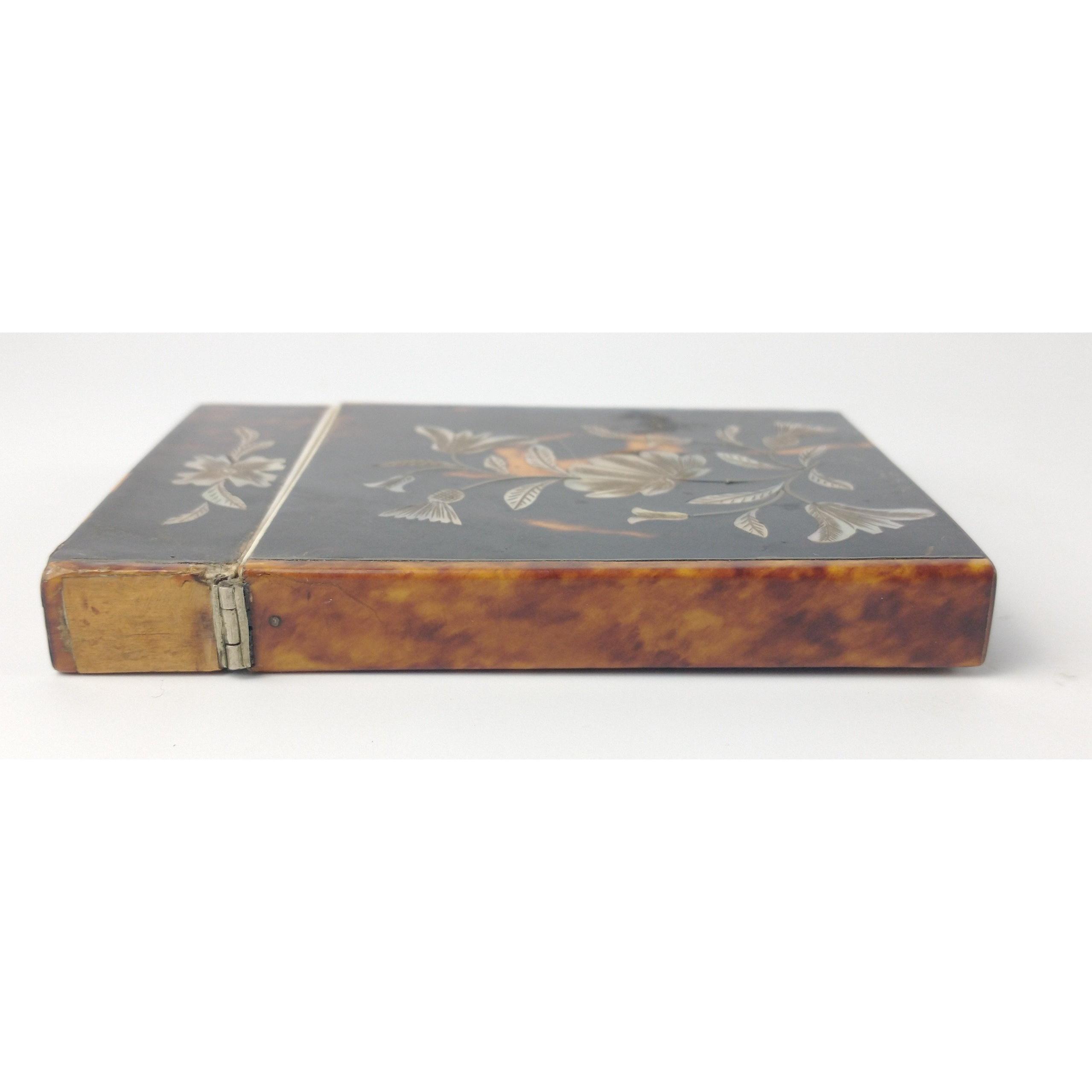A vintage tortoiseshell style CARD CASE with mother-of-pearl floral decoration (10 x 8cm approx)