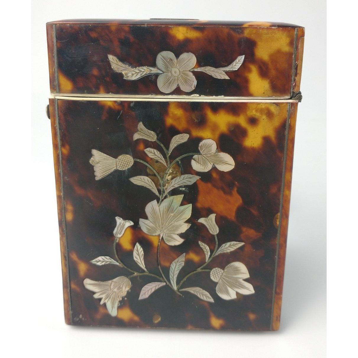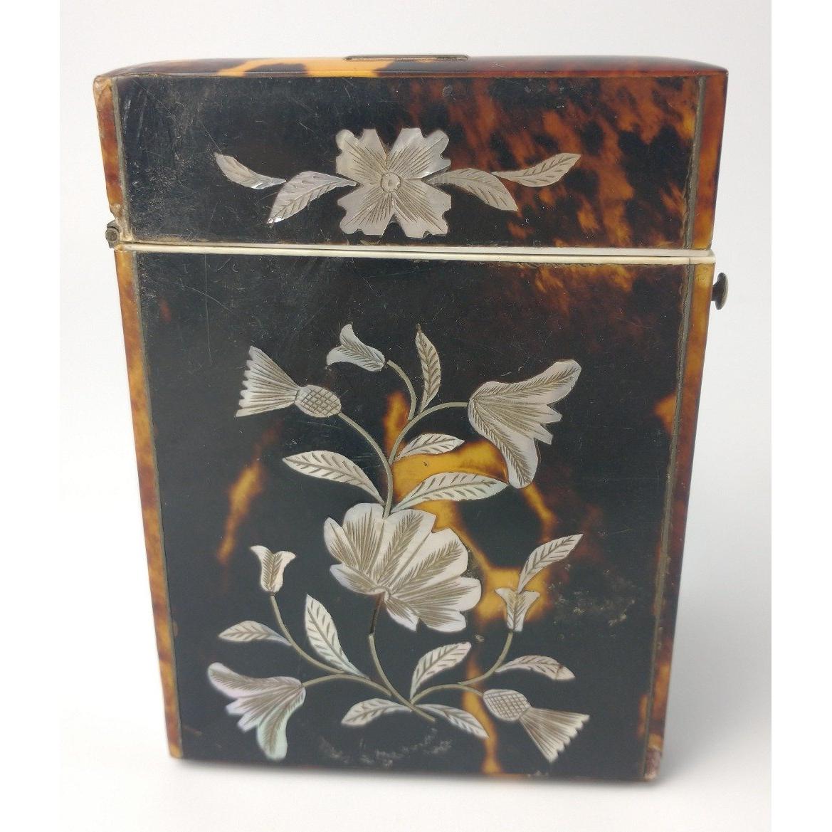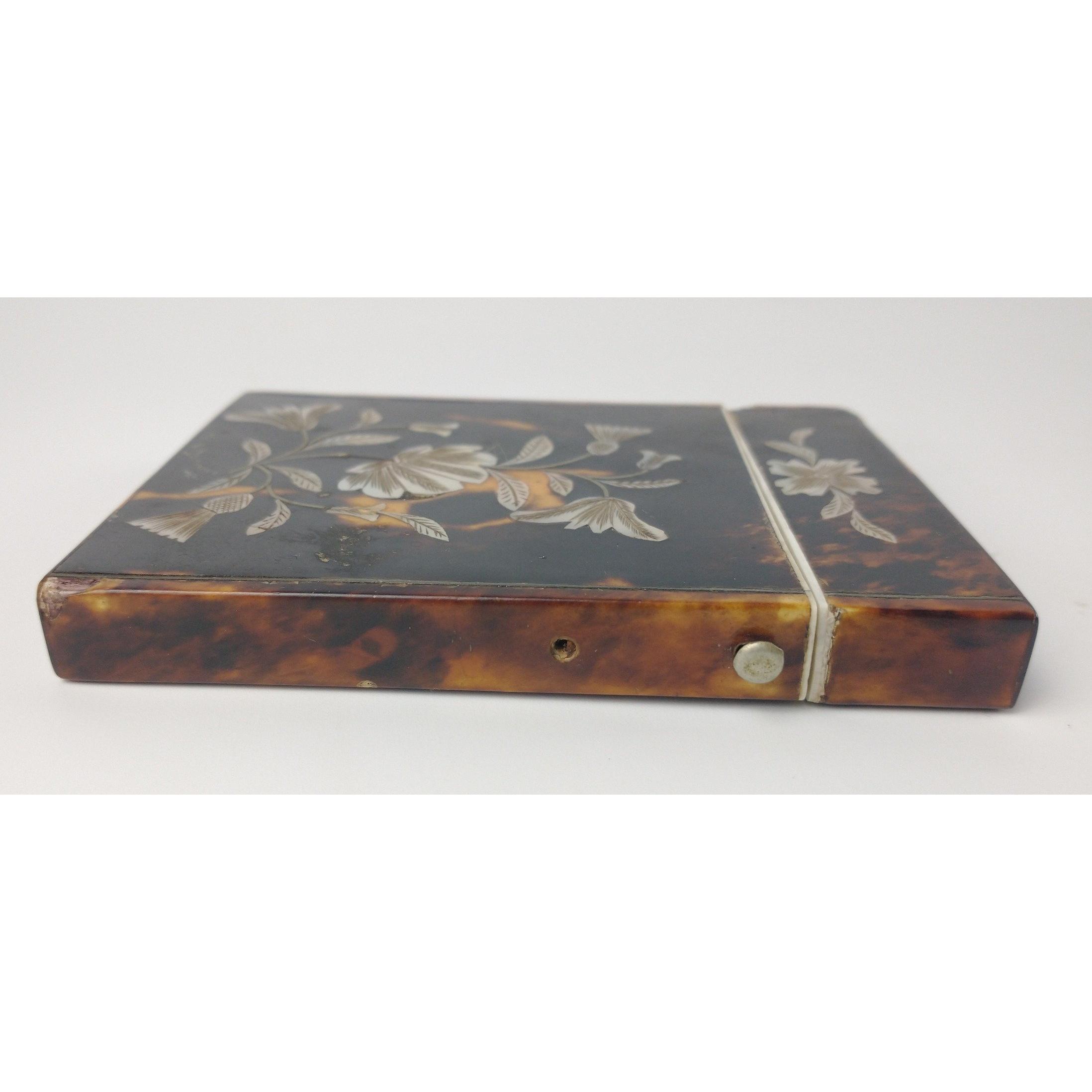 A vintage tortoiseshell style CARD CASE with mother-of-pearl floral decoration (10 x 8cm approx)