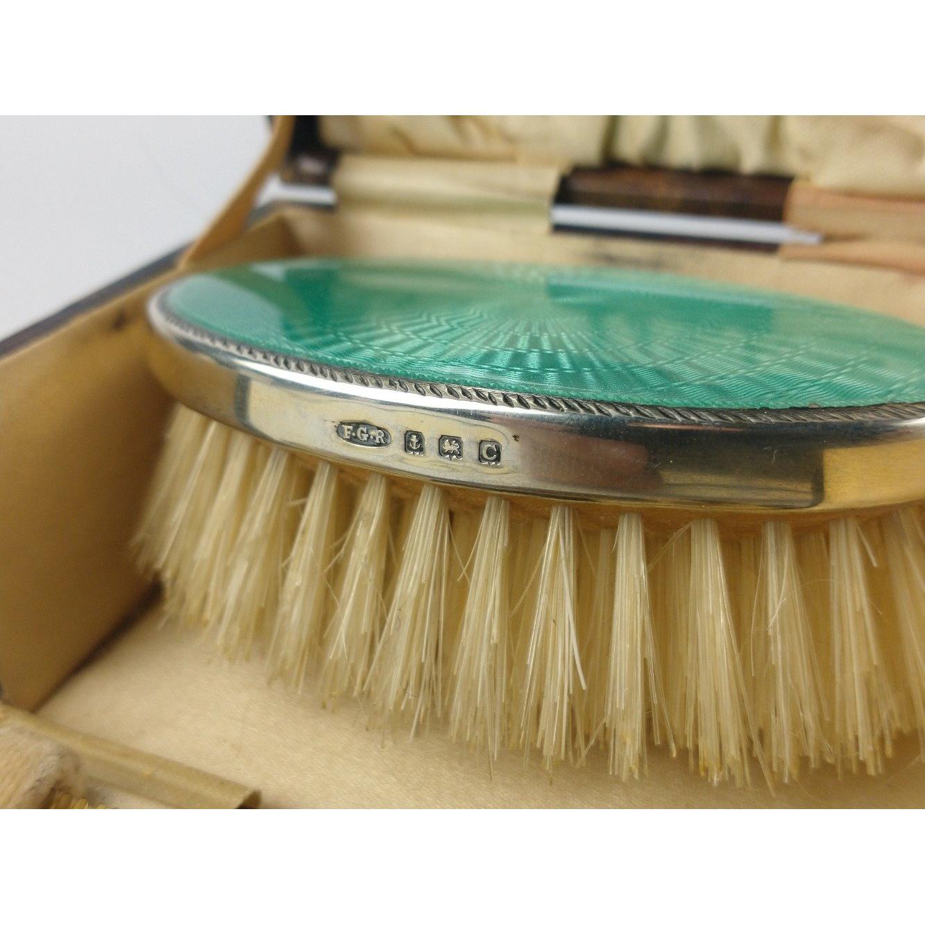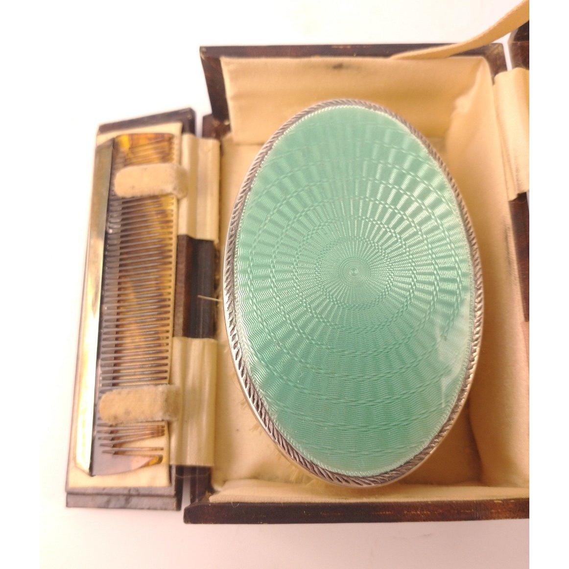 A charming Birmingham silver hallmarked 1902, silversmith F.G.R. BRUSH with turquoise enamelled top with a small silver-topped COMB all enclosed in a fitted box with MIRROR set inside (10.5cm x 7.5cm x 5.5cm)