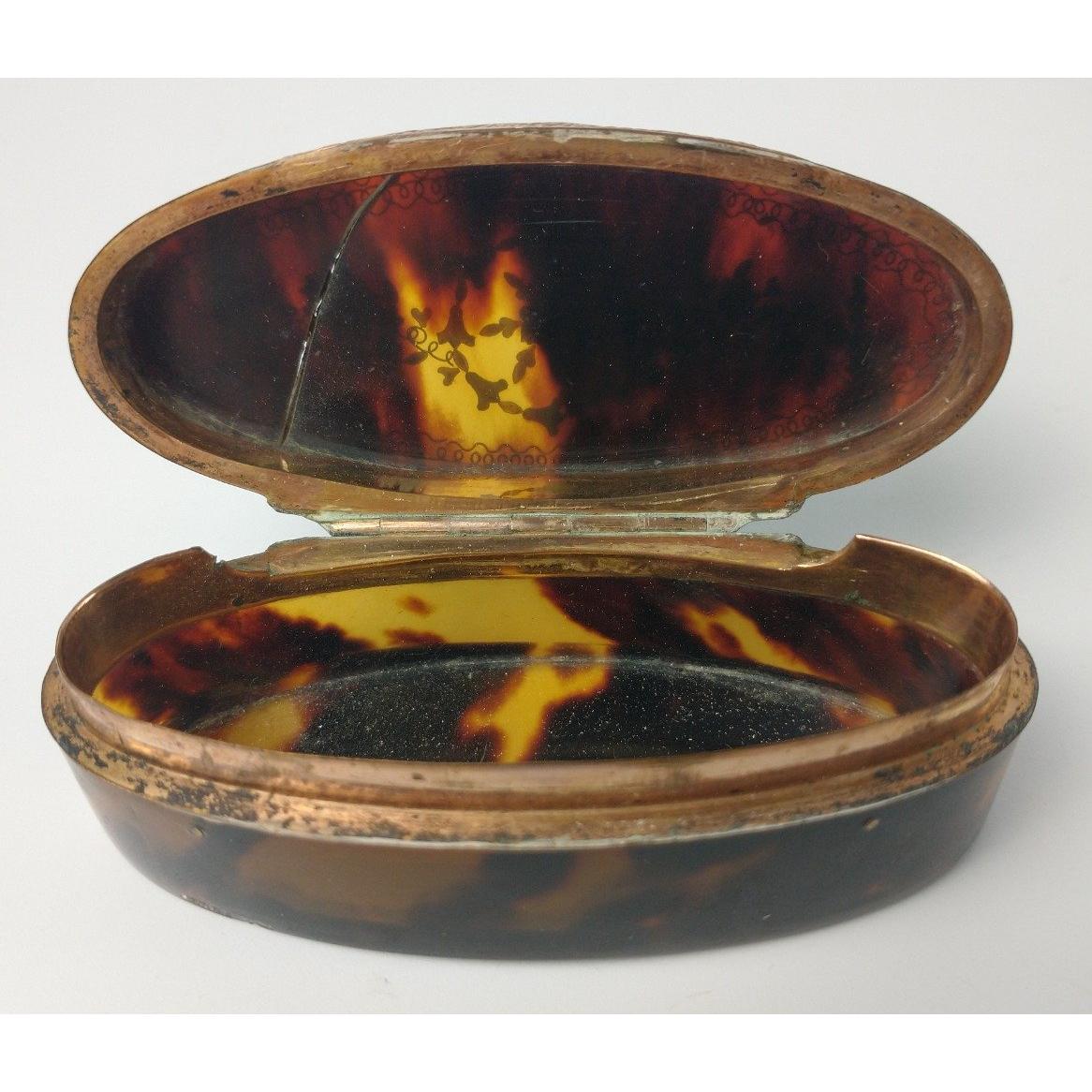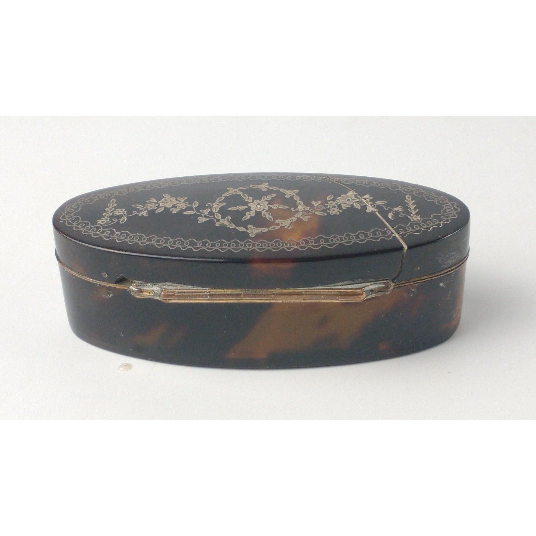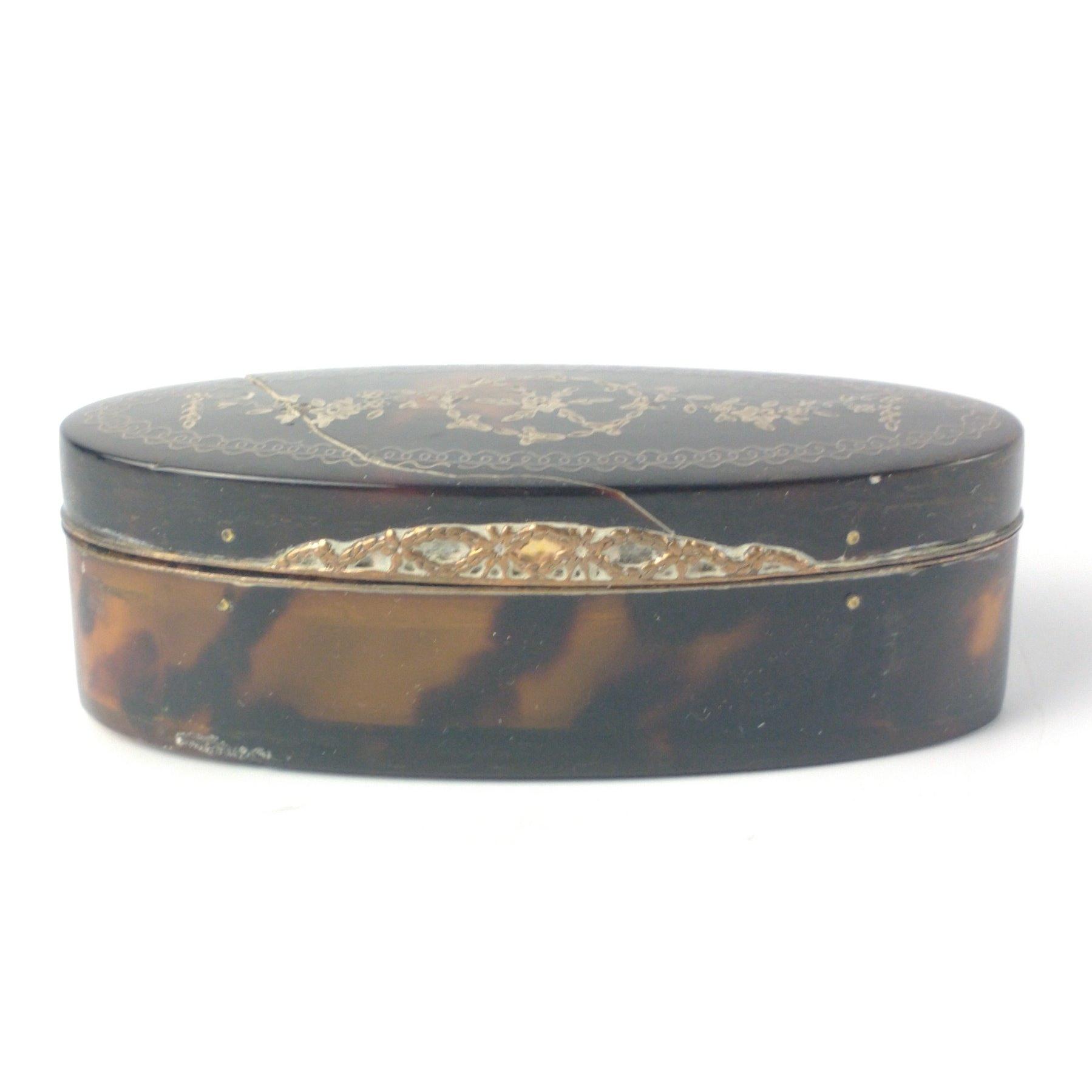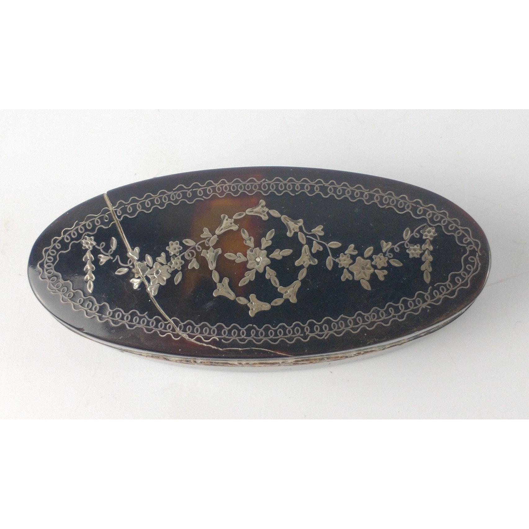 An oval tortoise-shell style and inlaid white metal BOX (8.5cm x 3.5cm x 2.75cm)