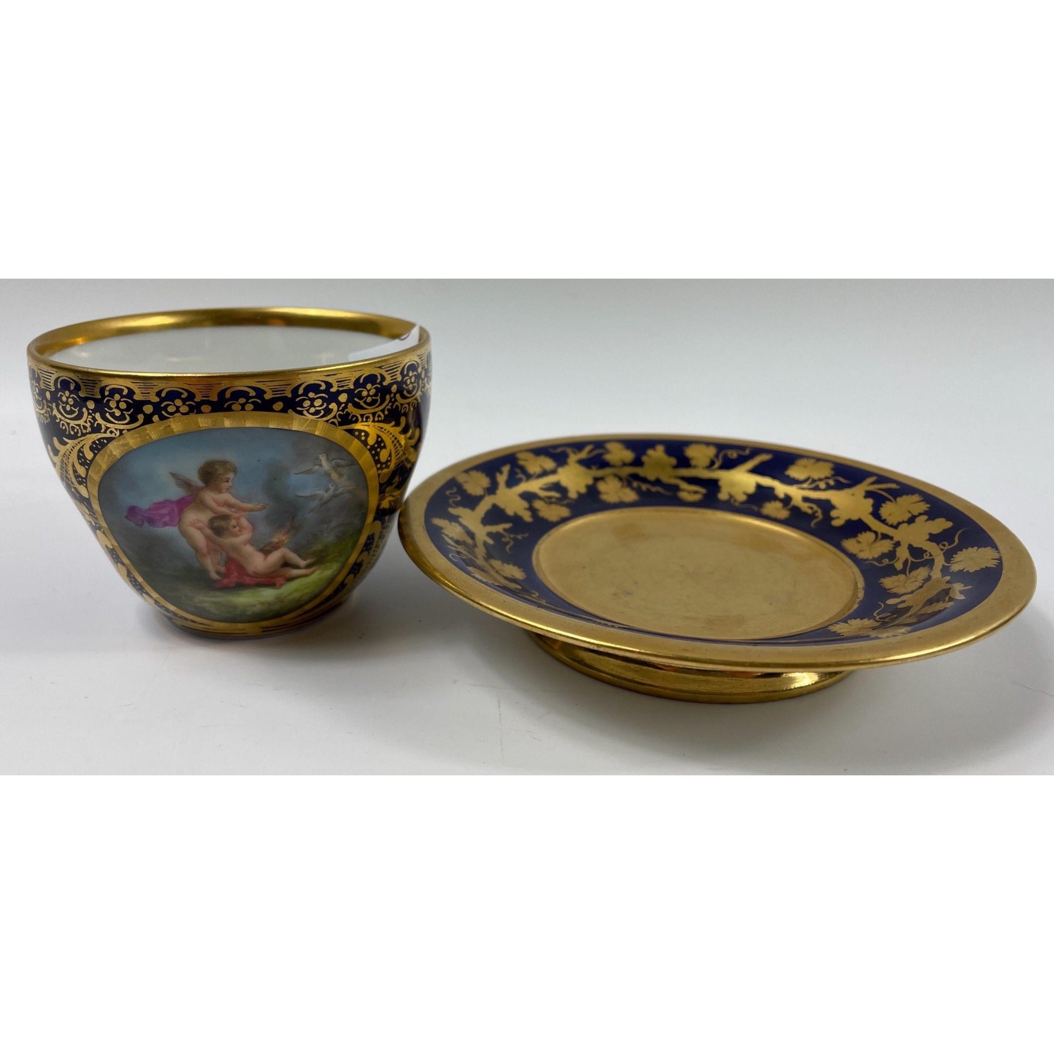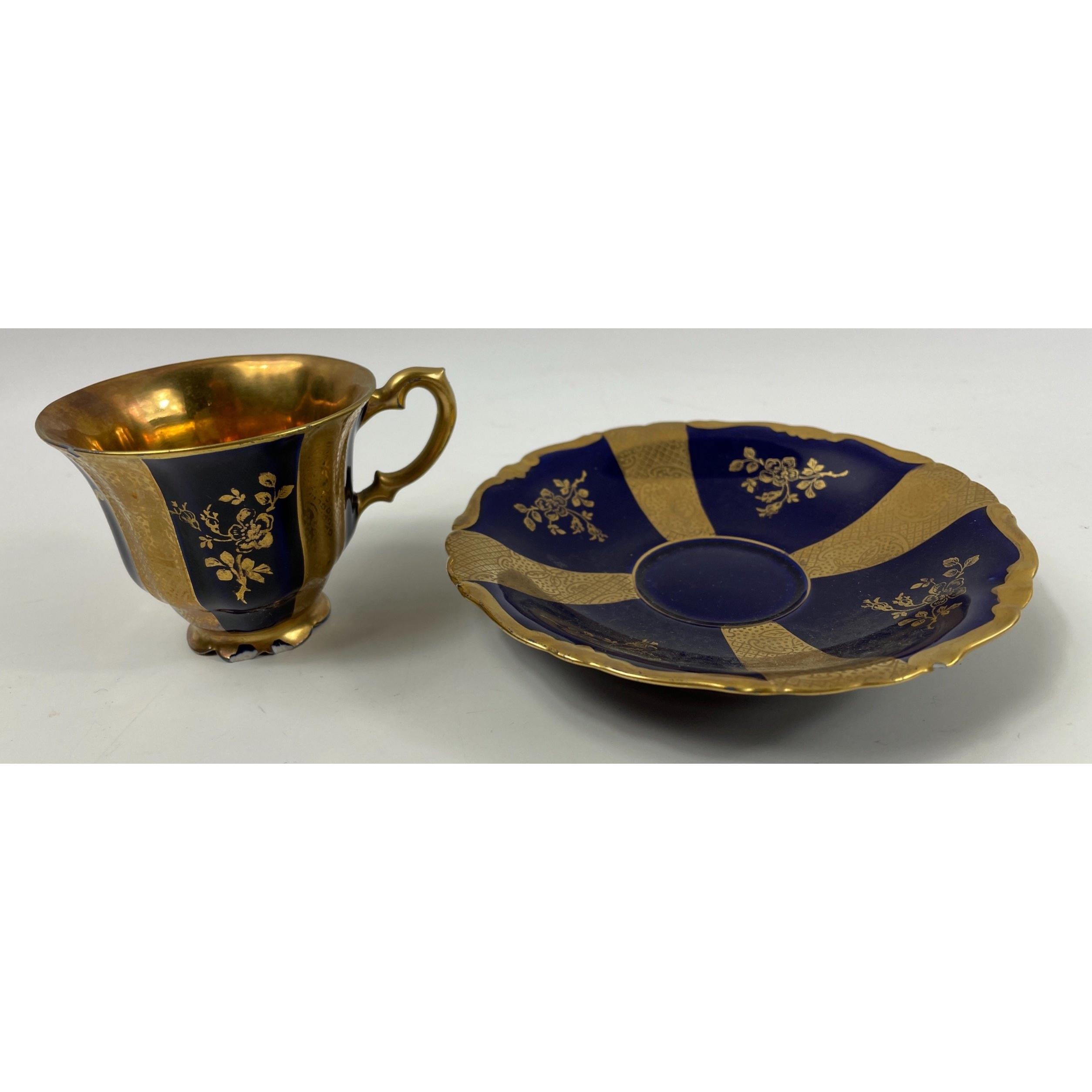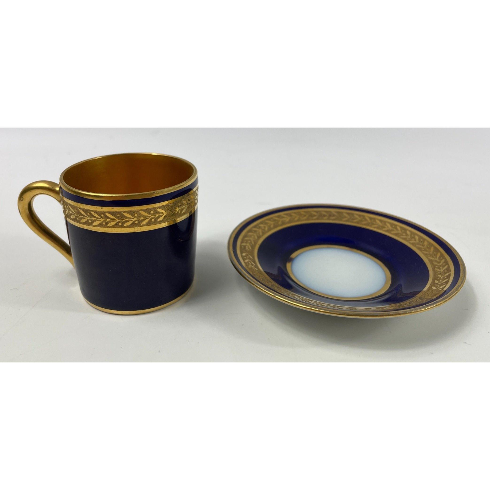 A selection of very fine collectable cabinet china to include BAVARIAN BURGGRUB gilt and navy hand painted small cup and saucer, COALPORT navy painted and gilt cup and saucer, ARABIA fine chine coffee can and saucer, a LIMOGES gilt and hand painted navy blue coffee can and saucer, a BRADFORD Fine Bone China teacup and saucer, one other Bavarian teacup and saucer, and lastly a A Museum Collections Ltd Brittania bone china coffee can