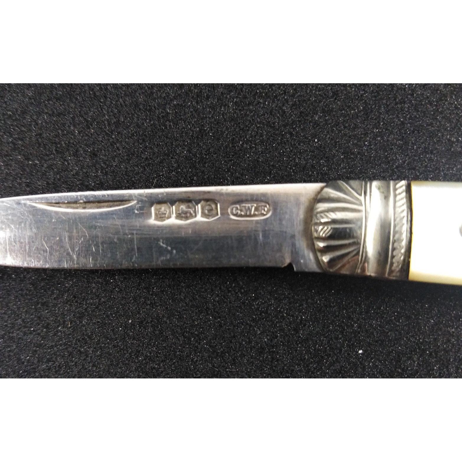 A FRUIT KNIFE with a mother-of-pearl handle and silver hallmarked blade CW Fletcher Sheffield 1922