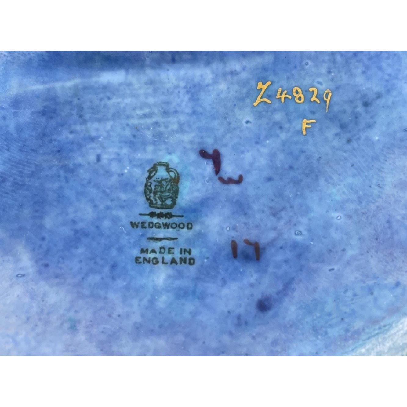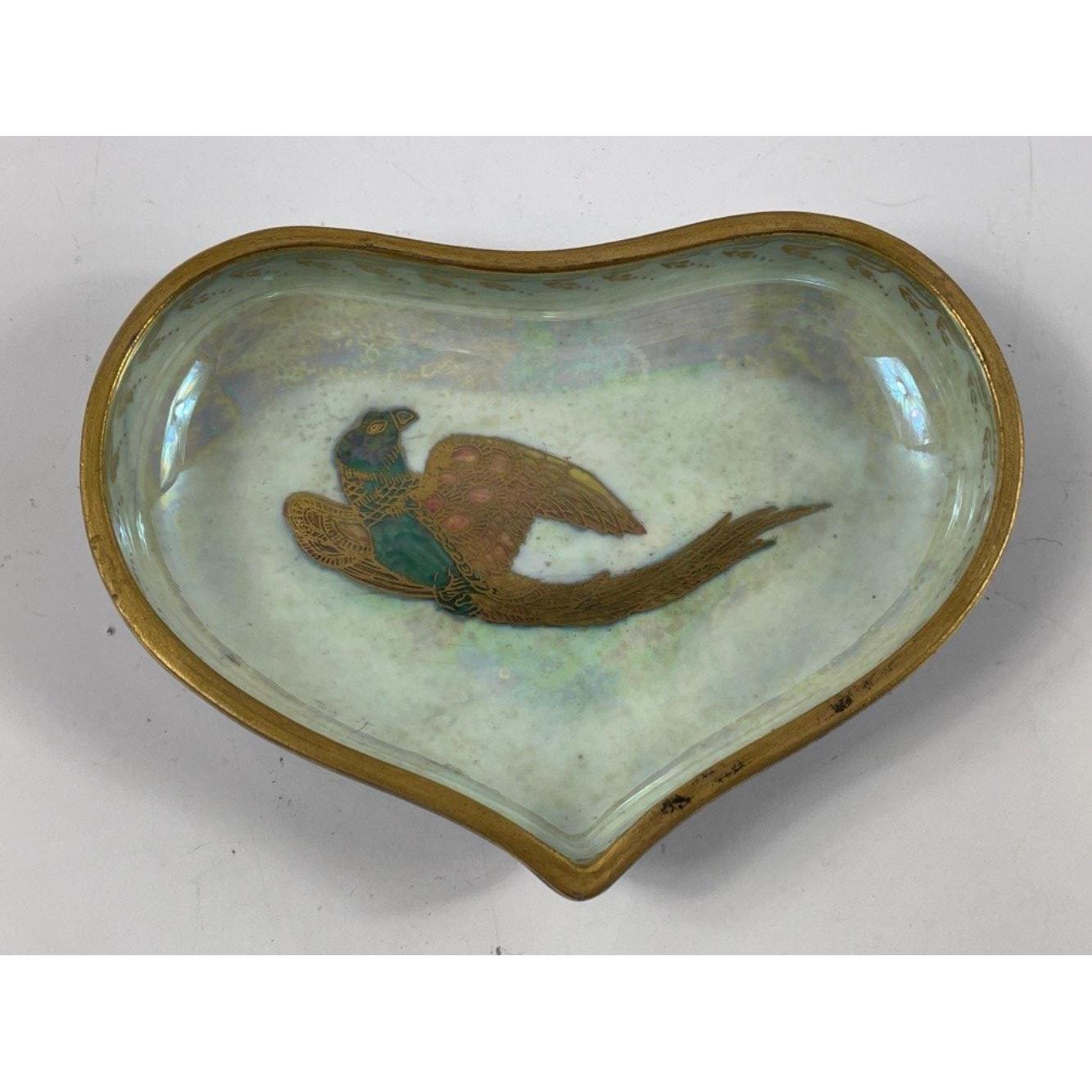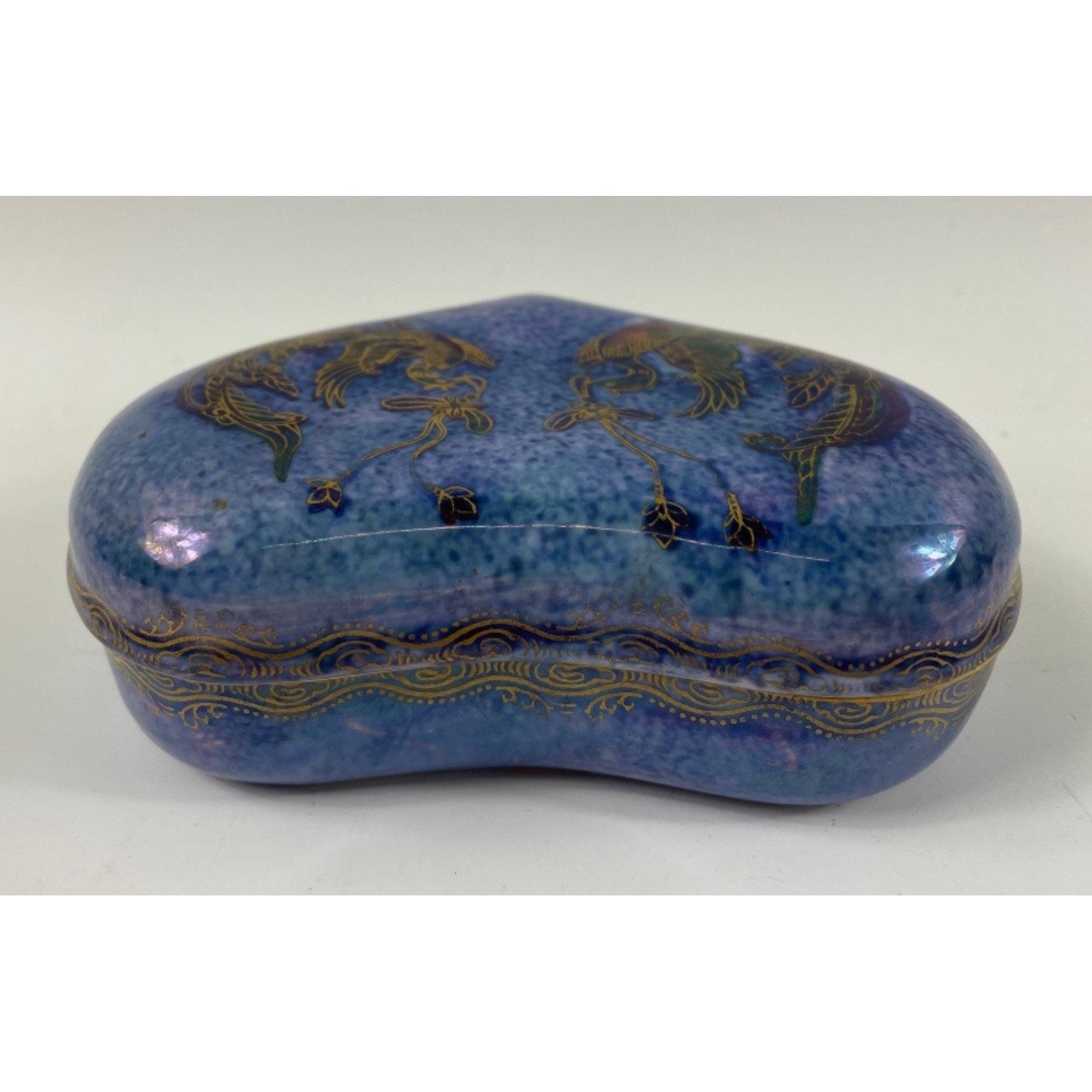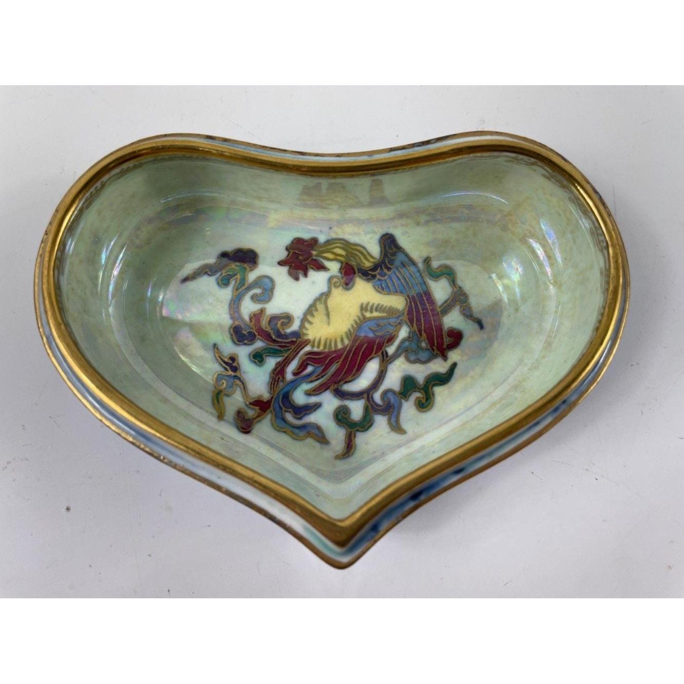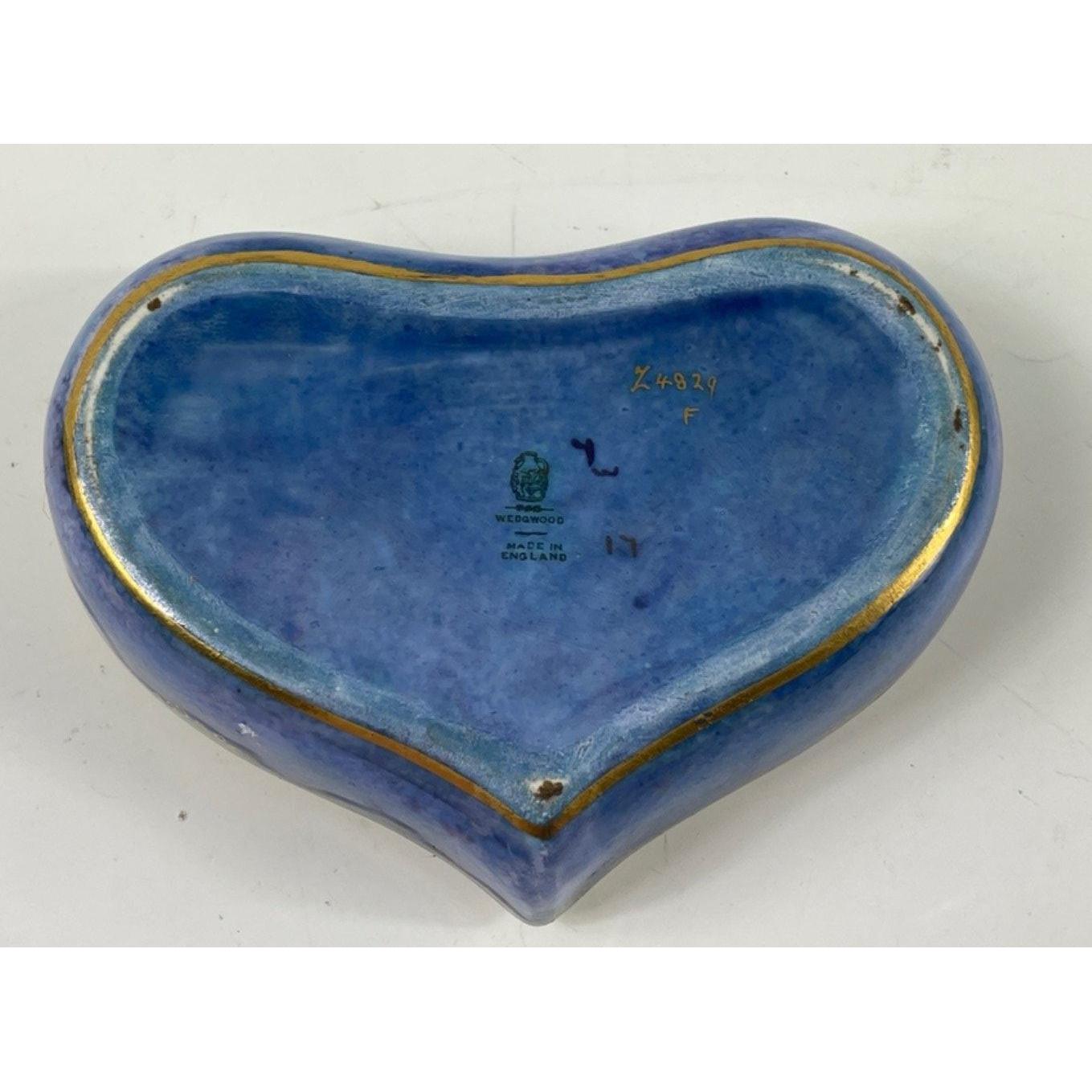 A vintage 1920s Wedgwood bird lustre heart-shaped TRINKET BOX. Mottled blue exterior, with two exotic birds on the cover. Gilt aquatic bead around the rim of both pieces. Mother of pearl interior with two birds. Wedgwood 'Portland Vase' maker's mark to underside of box along with pattern number 'Z4829'. length 13cm, height 5cm