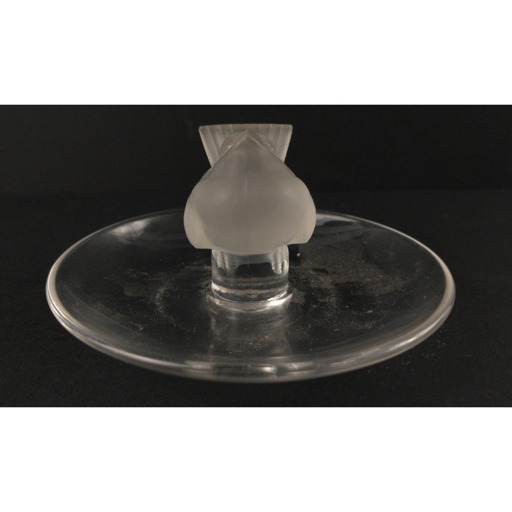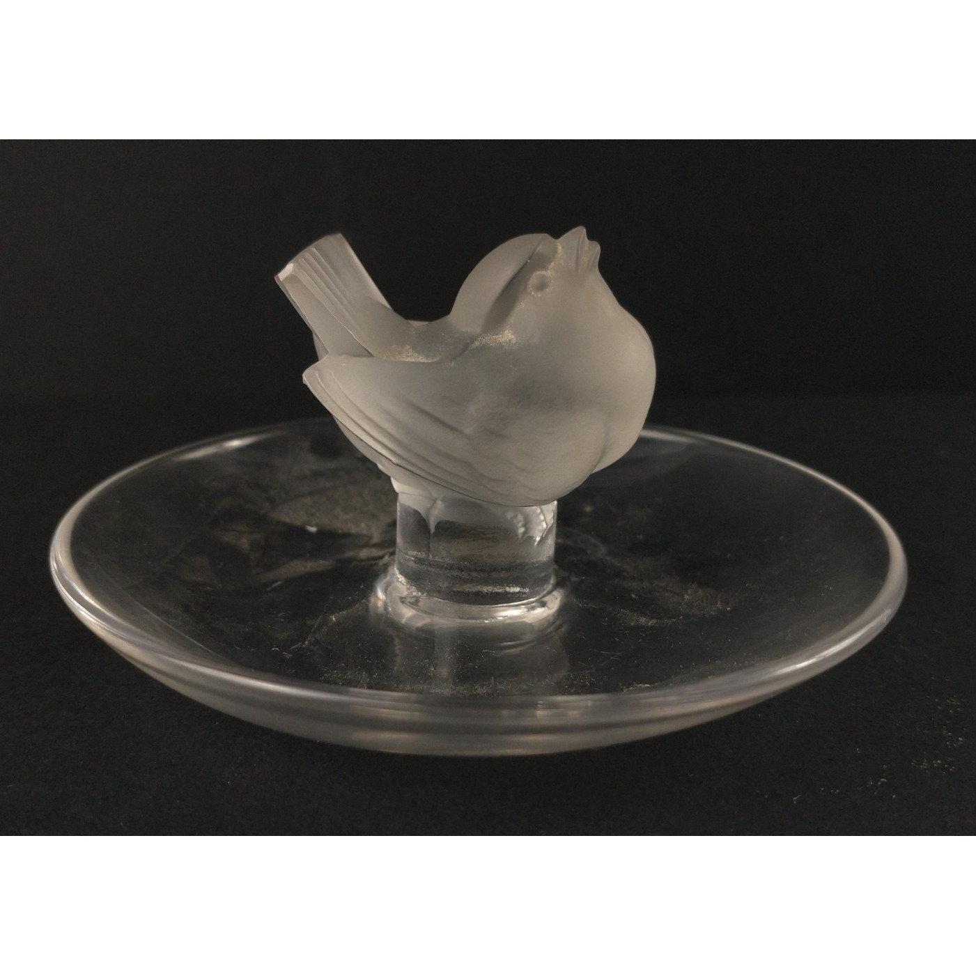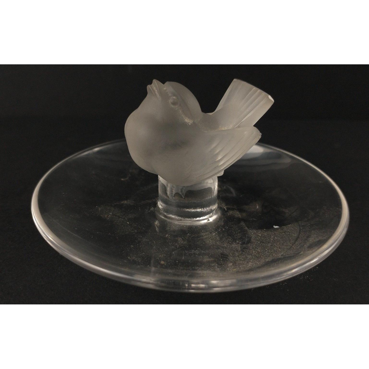 A LALIQUE ring tray with a charming Wren centre bird 10cm diameter, 5cm height, a few scratches to the base but otherwise good condition