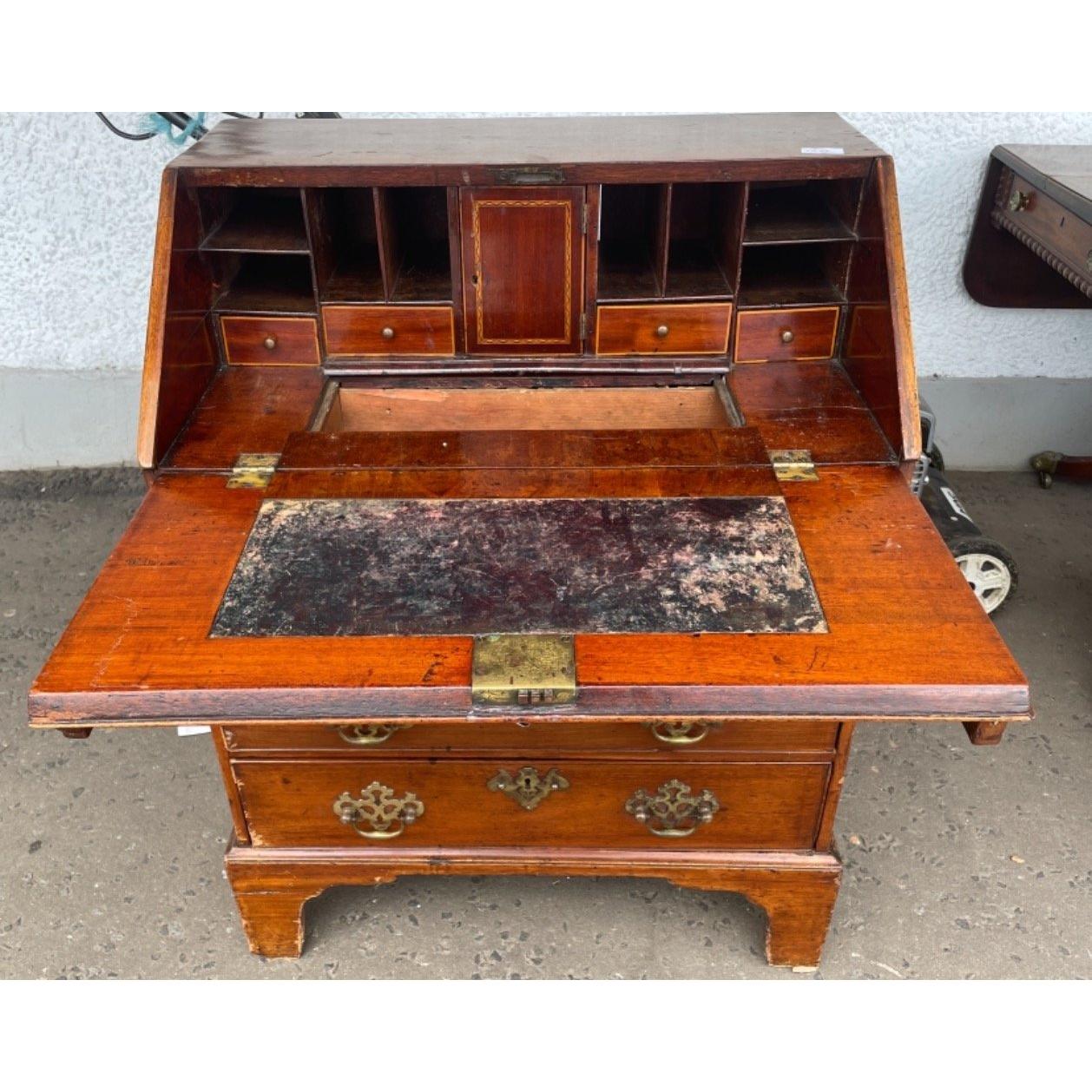 A VICTORIAN bijou mahogany bureau with original brass escutcheon handles and locks with five drawers and also a secret compartment dimensions 68cm long x 45cm depth x 90cm height