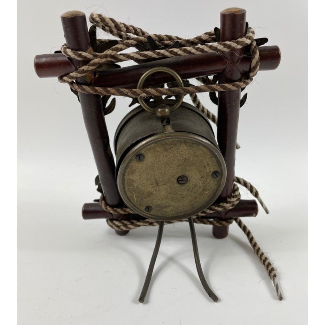 An unusual styled aneroid BAROMETER in a rustic looking wooden and string case, frame 16 x 14cm, barometer 7cm diameter