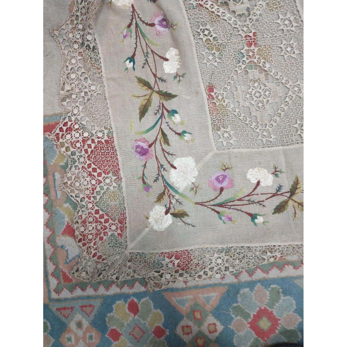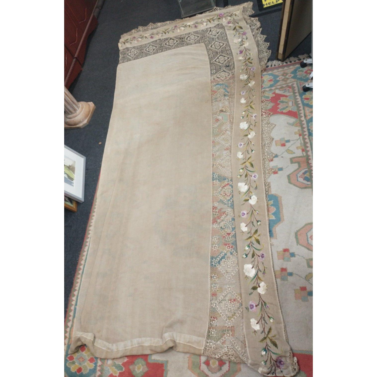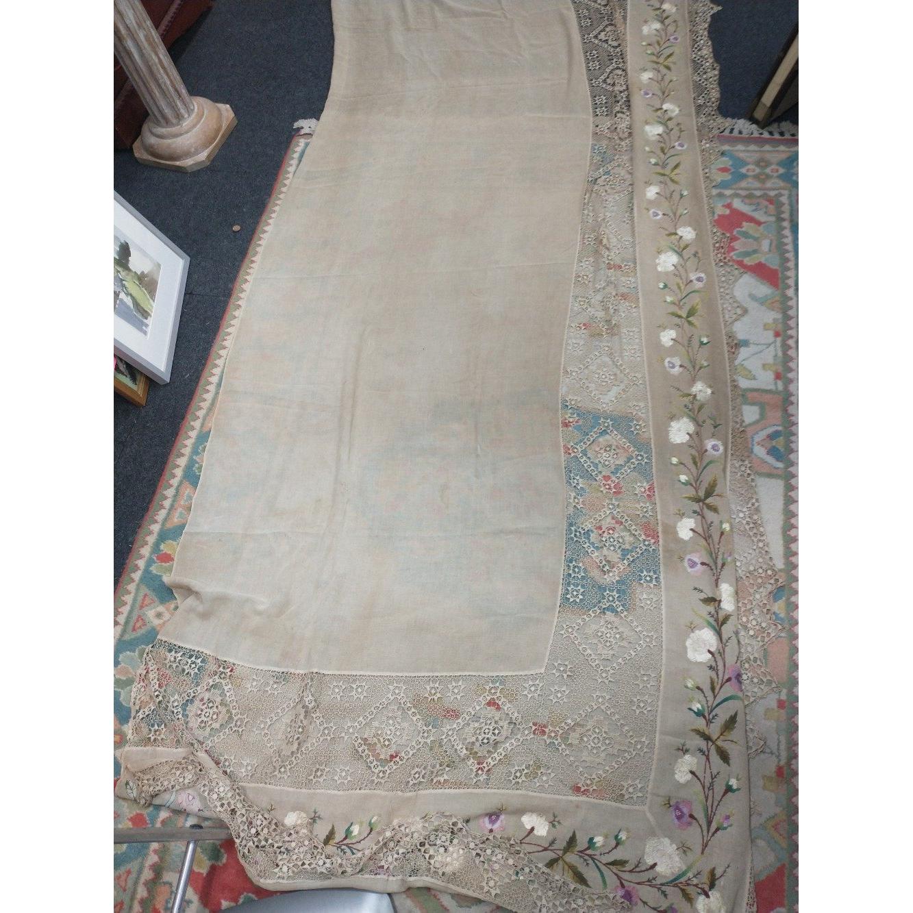 A vintage large rectangular CREWEL-WORK on linen tablecloth, floral designs worked all over 160cm x 215cm approx plus a fringe of approx 18cm, plus a HUGE linen tablecloth split in two pieces for ease of management, embroidered in mixed silks and wool with lace edging, each piece 330cm x 140cm plus 16cm approx edging