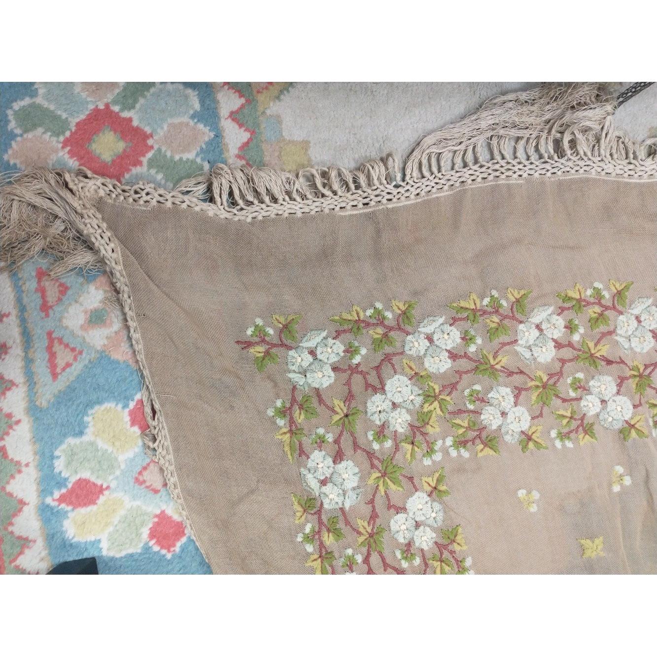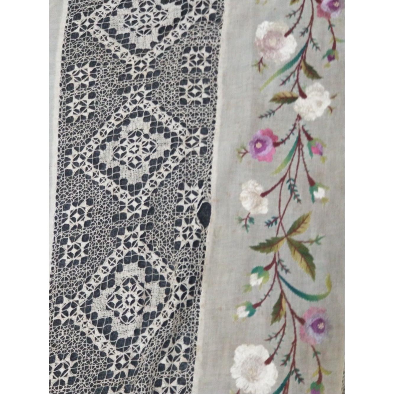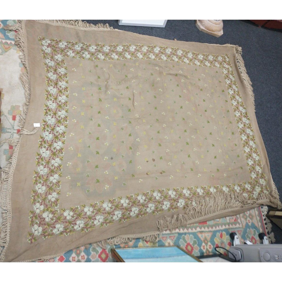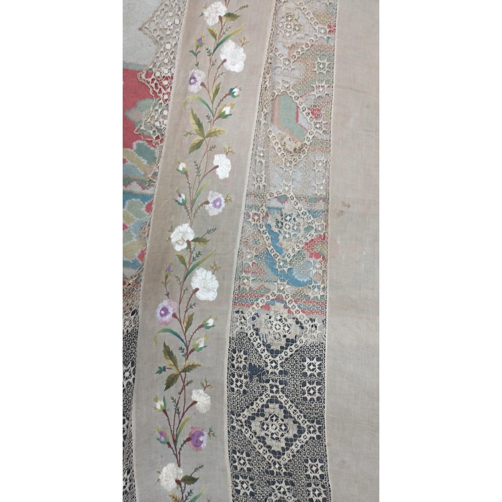 A vintage large rectangular CREWEL-WORK on linen tablecloth, floral designs worked all over 160cm x 215cm approx plus a fringe of approx 18cm, plus a HUGE linen tablecloth split in two pieces for ease of management, embroidered in mixed silks and wool with lace edging, each piece 330cm x 140cm plus 16cm approx edging