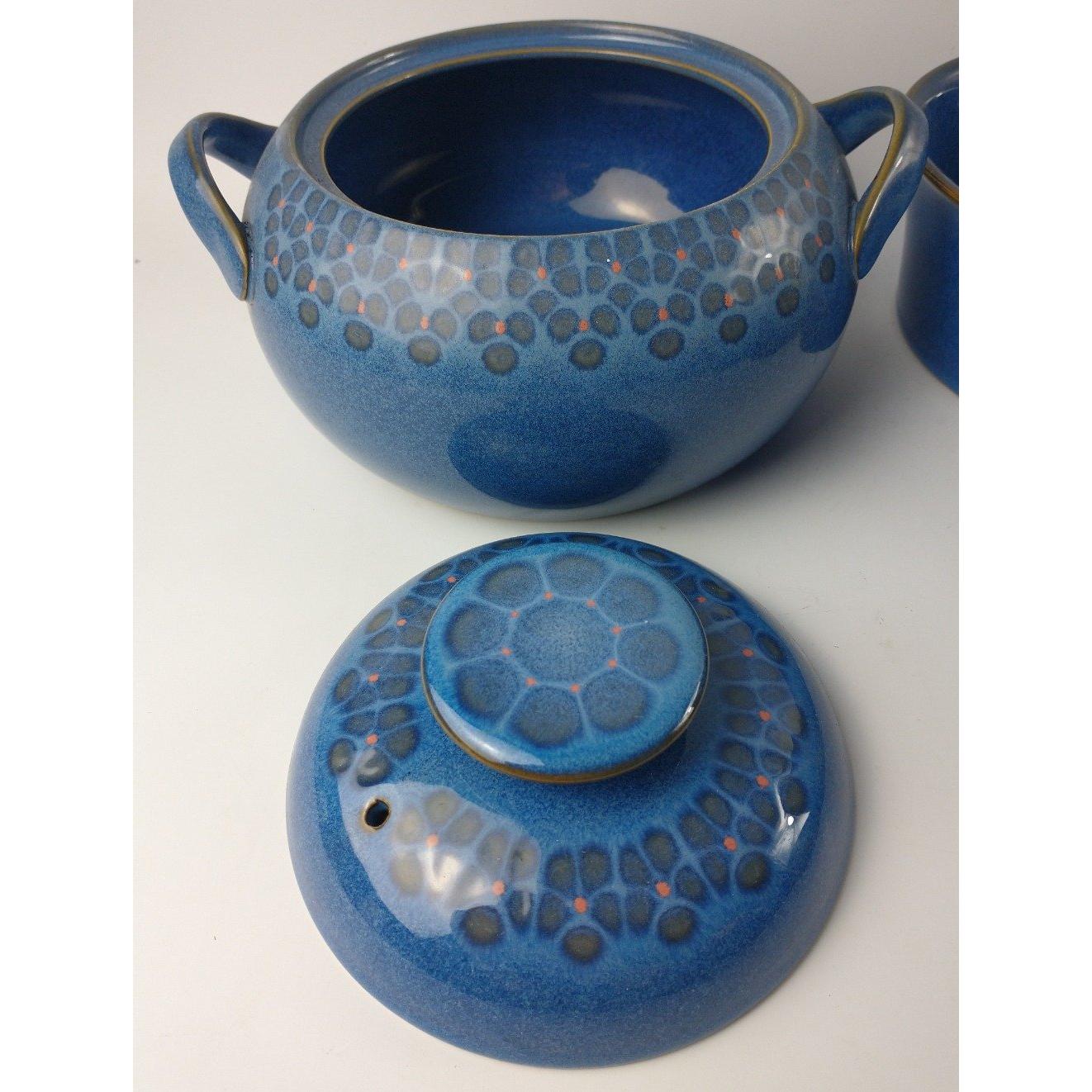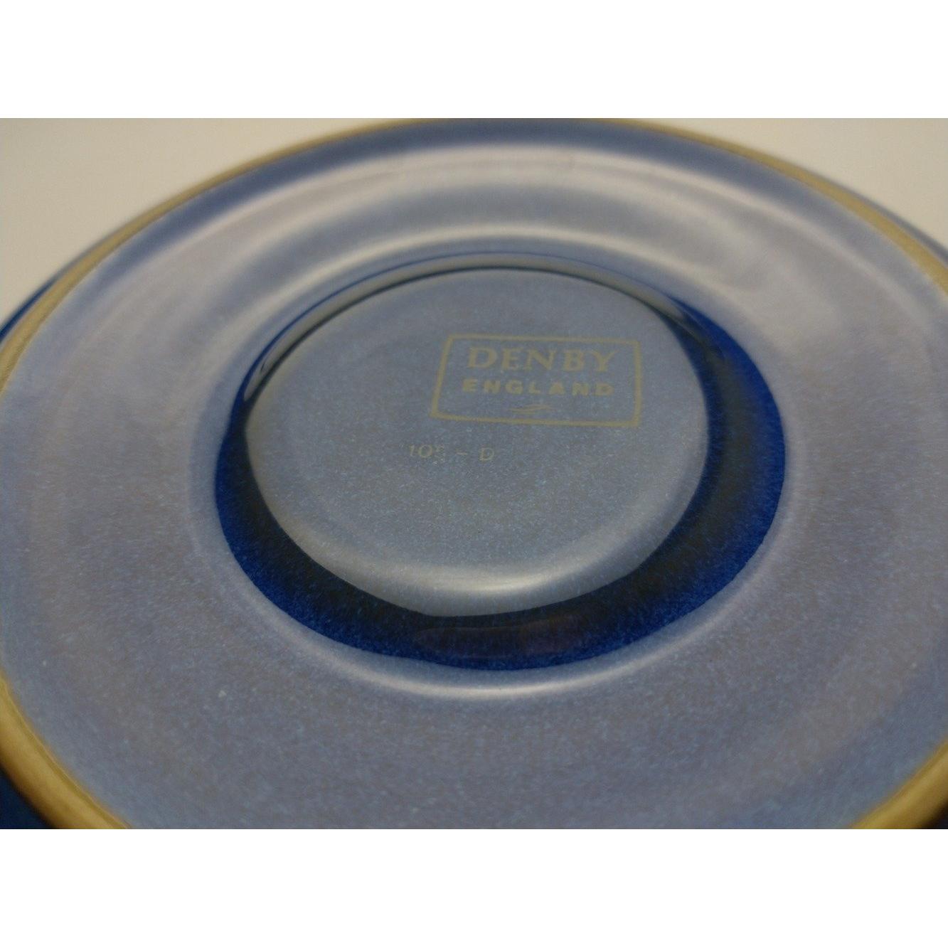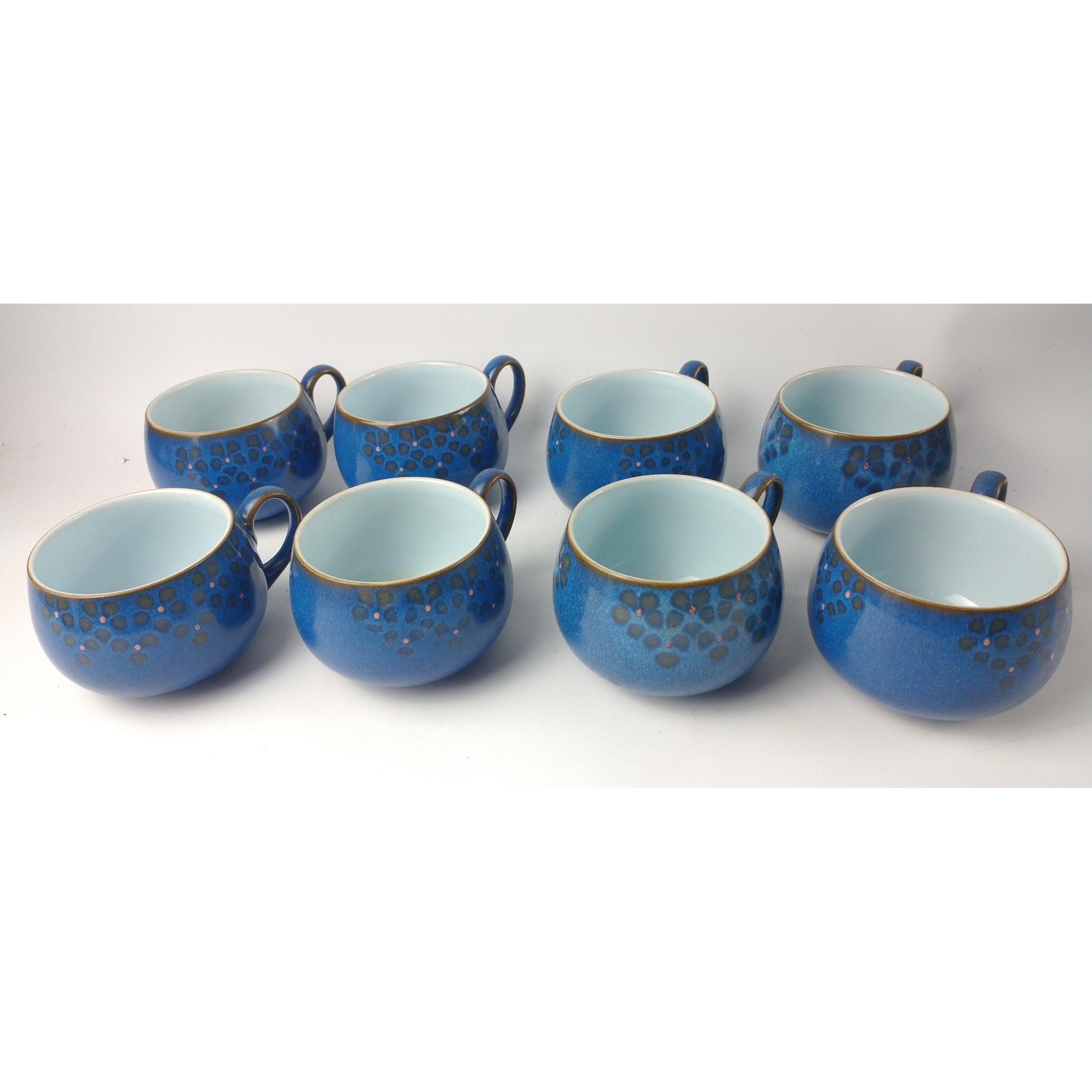 A part DENBY MIDNIGHT dinner service to include 7 x 25.5cm plates, 4 x 17cm plates, 10 x 15cm saucers, 7 x 17cm bowls, 8 cups, 2 mugs, 1 jug 13.5cm tall, 1 jug 7cm high, 1 sugar bowl, 1 scallop-edged flan dish 21cm dia, 1 straight-sided dish 18cm dia, 1 lidded serving dish 13cm at rim