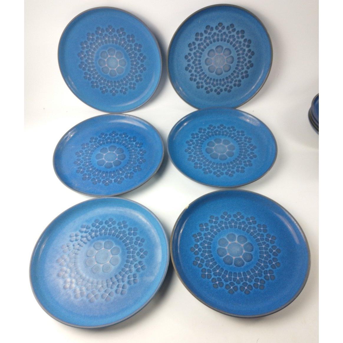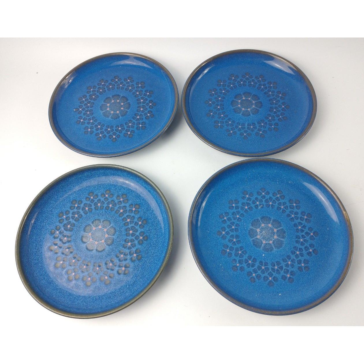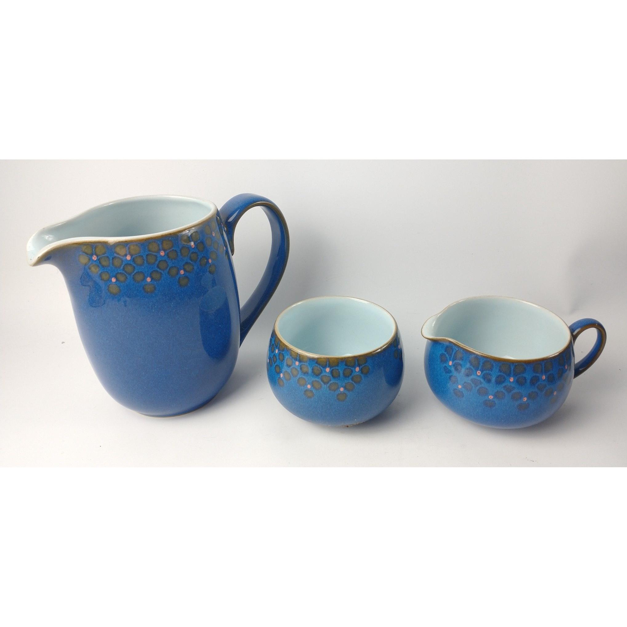 A part DENBY MIDNIGHT dinner service to include 7 x 25.5cm plates, 4 x 17cm plates, 10 x 15cm saucers, 7 x 17cm bowls, 8 cups, 2 mugs, 1 jug 13.5cm tall, 1 jug 7cm high, 1 sugar bowl, 1 scallop-edged flan dish 21cm dia, 1 straight-sided dish 18cm dia, 1 lidded serving dish 13cm at rim