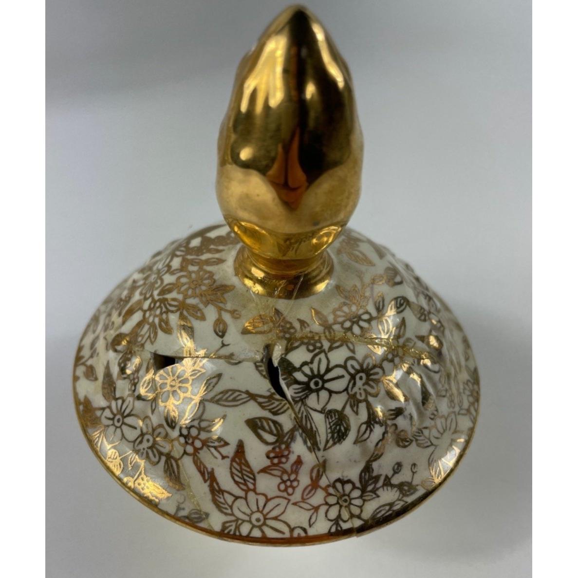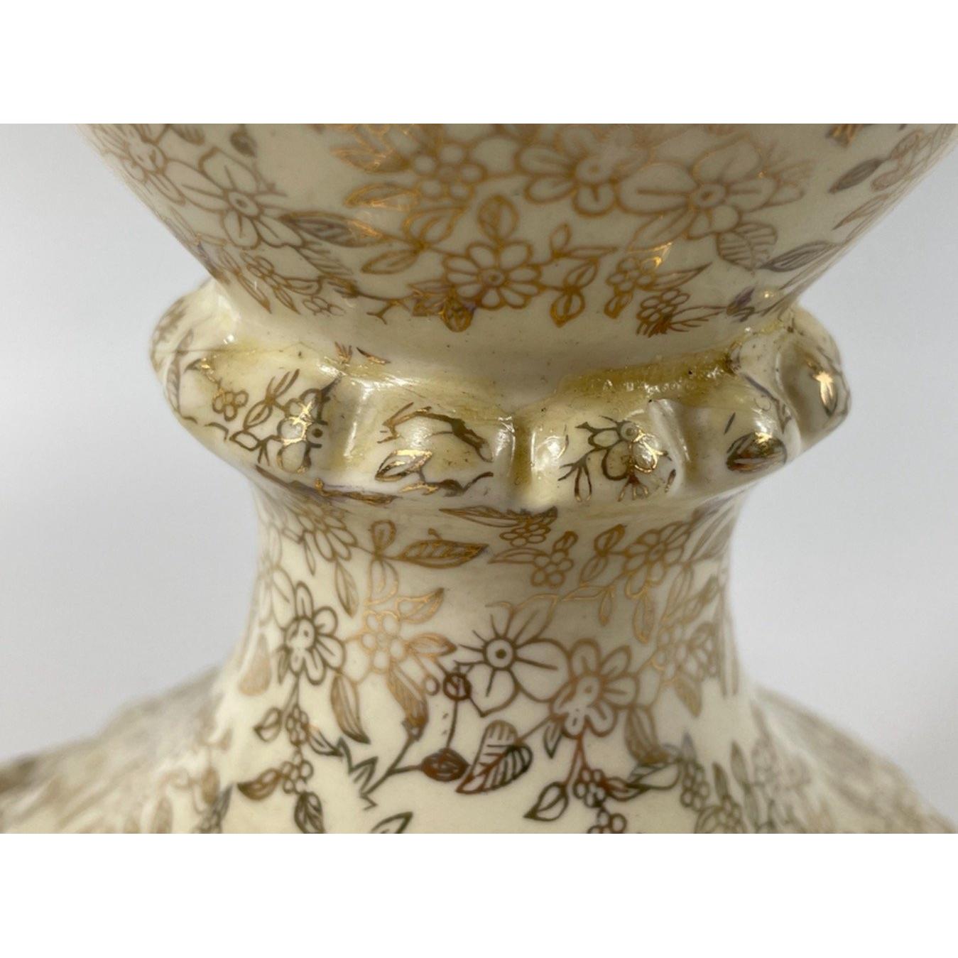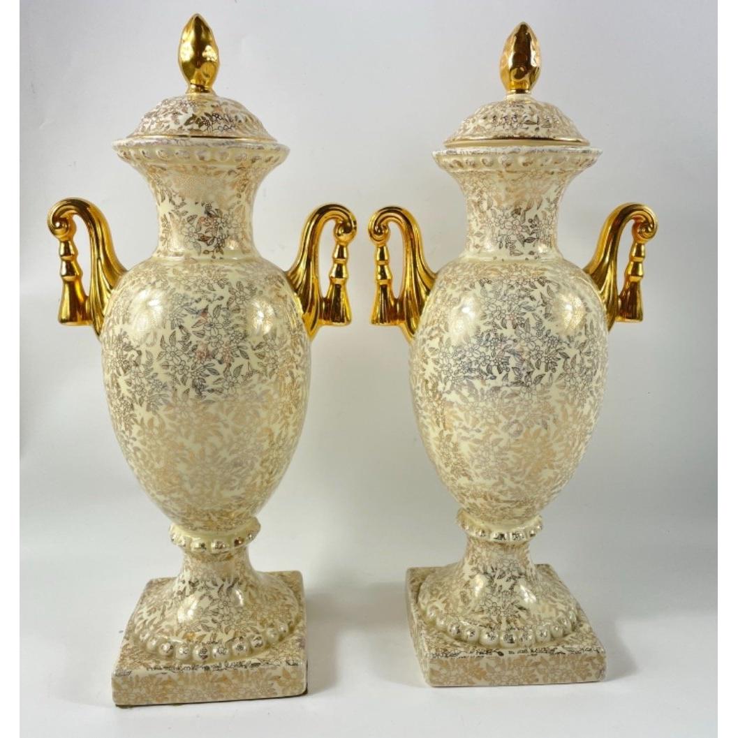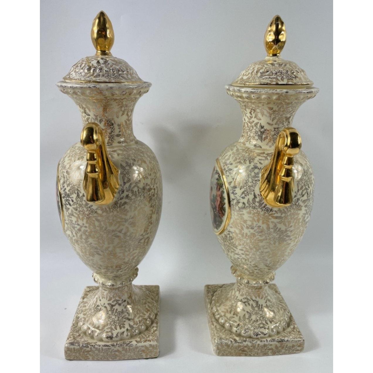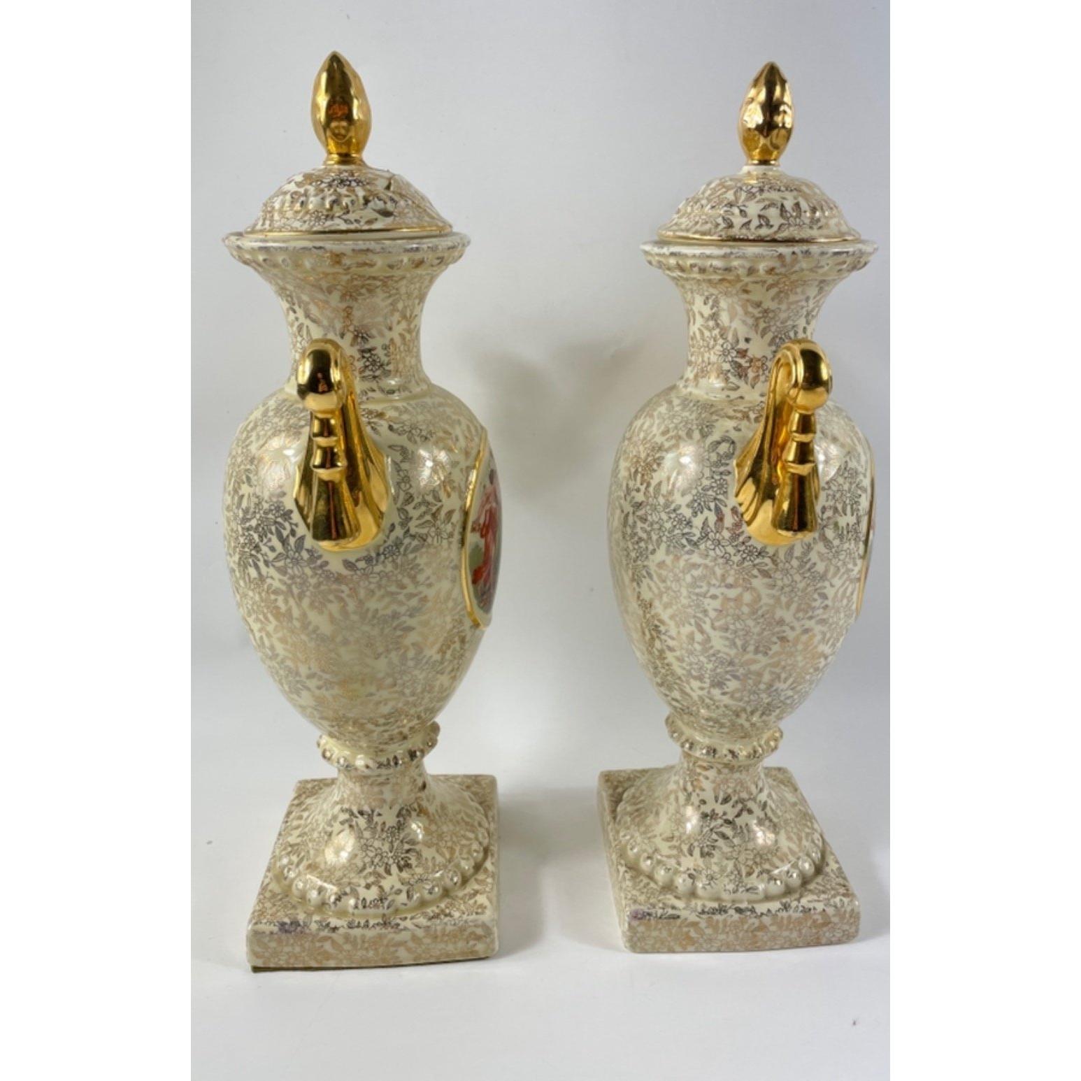 A pair of EMPIRE WARE urns with gilt and Grecian-style decoration standing approx 37cm tall, (one lid has been damaged and repaired)Approx 2 pieces