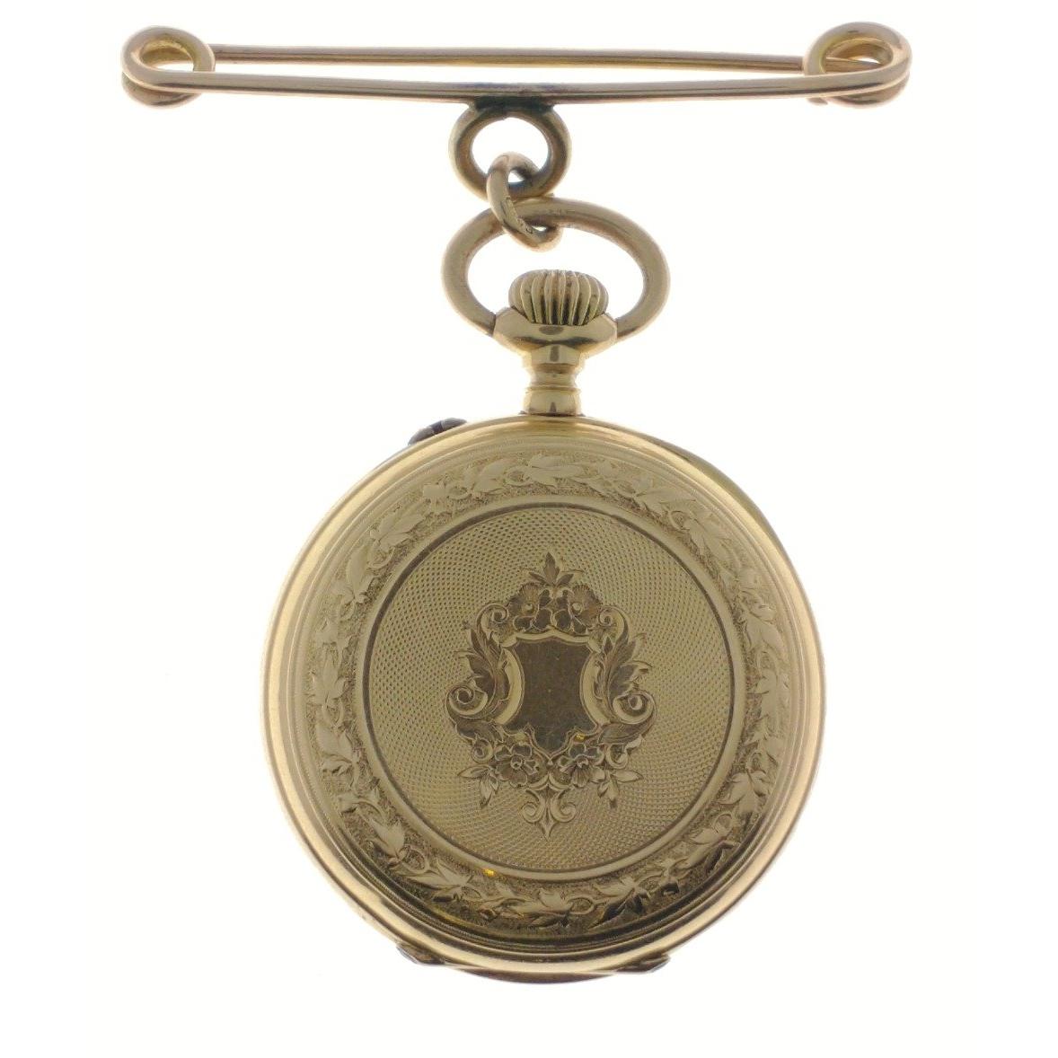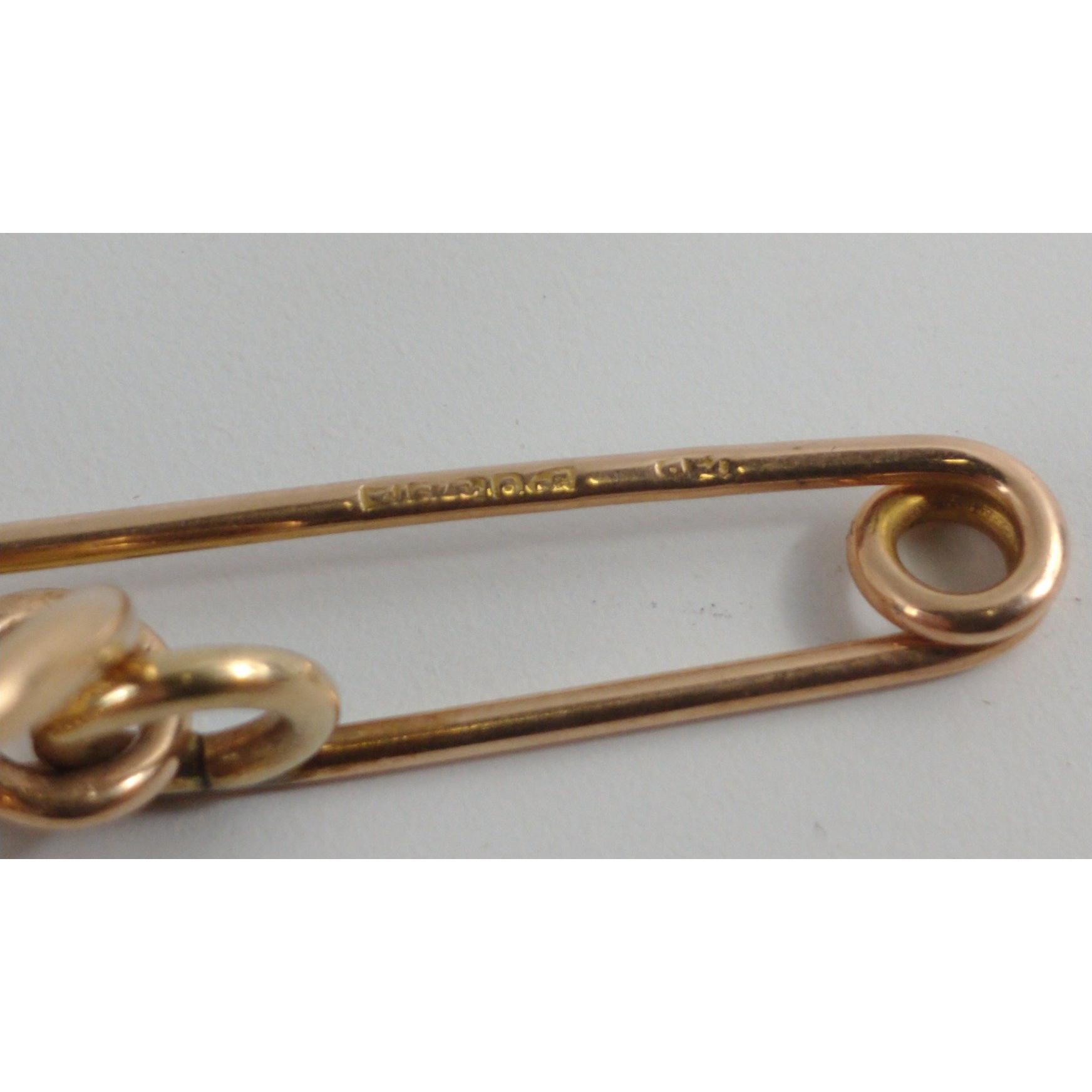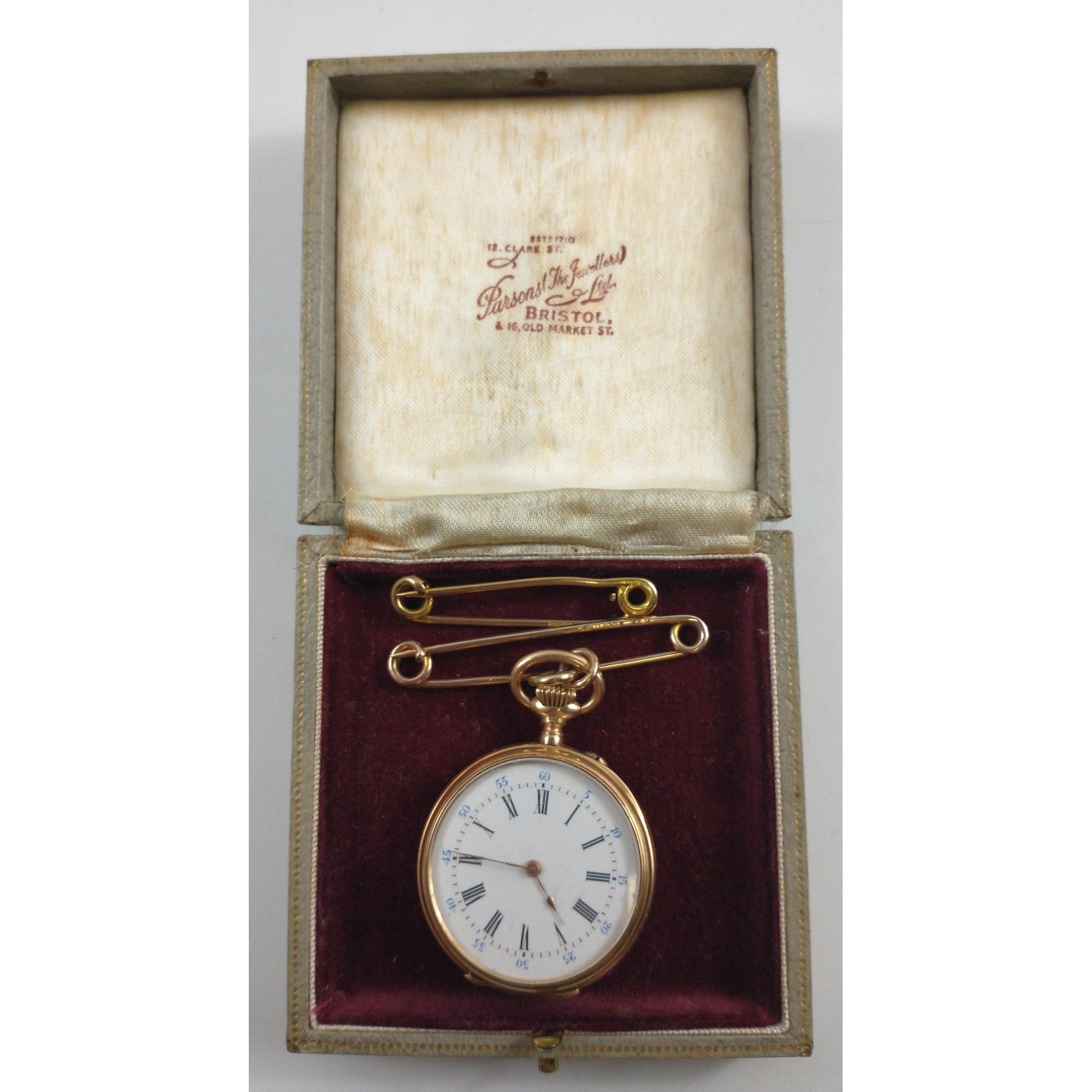 AN EXQUISITE QUALITY ladies VINTAGE 18k stamped case stamped yellow gold watch, beautifully decorated on the back plate with two 375 stamped supporting both 'safety-pins' 41g gross weight approx - in working order ticking away nicely when wound on inspection