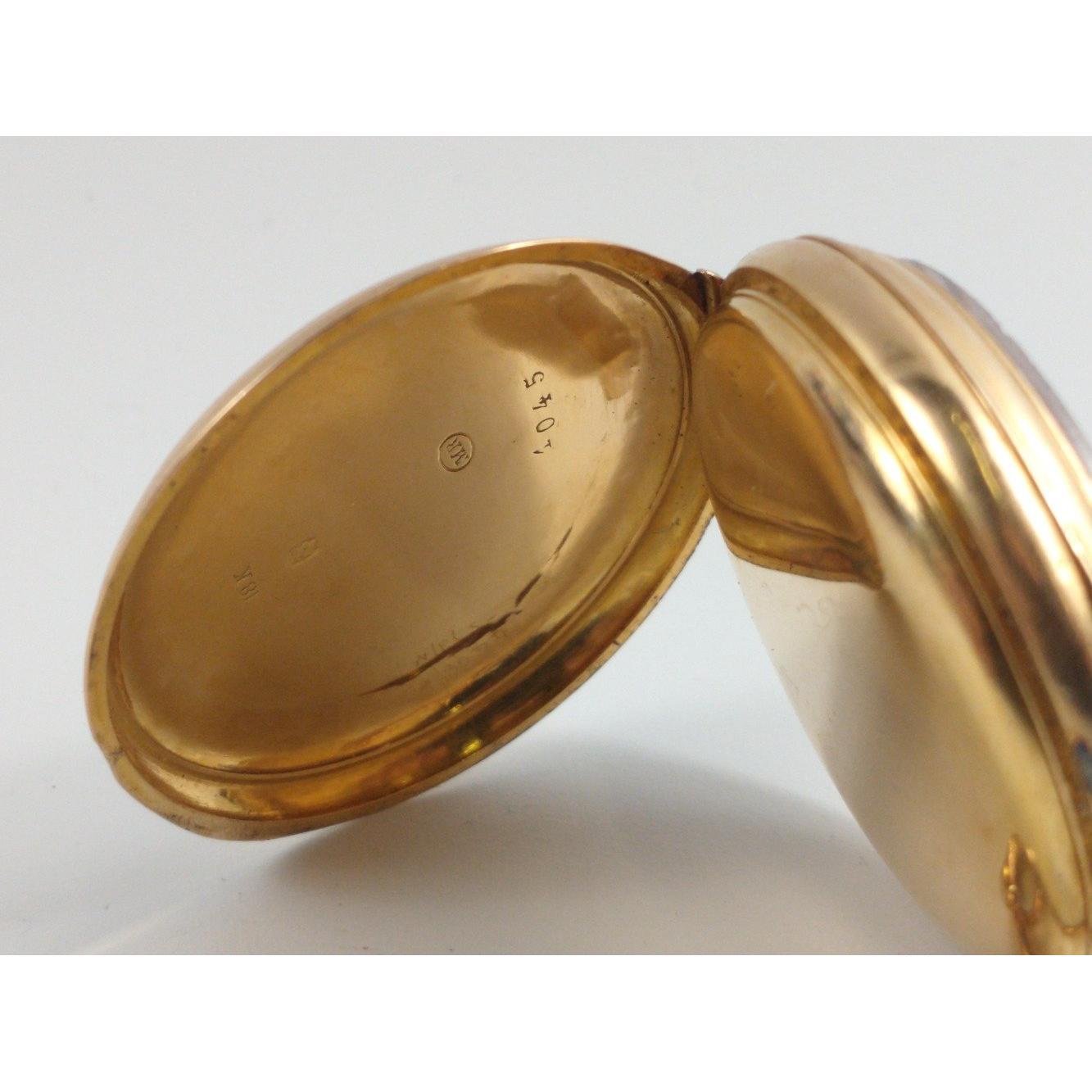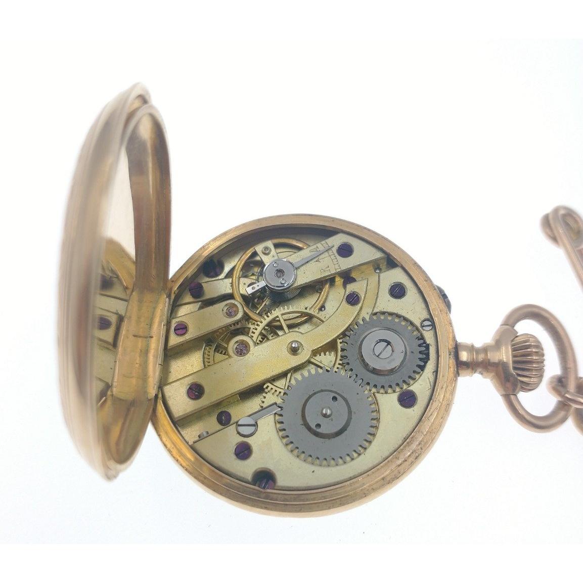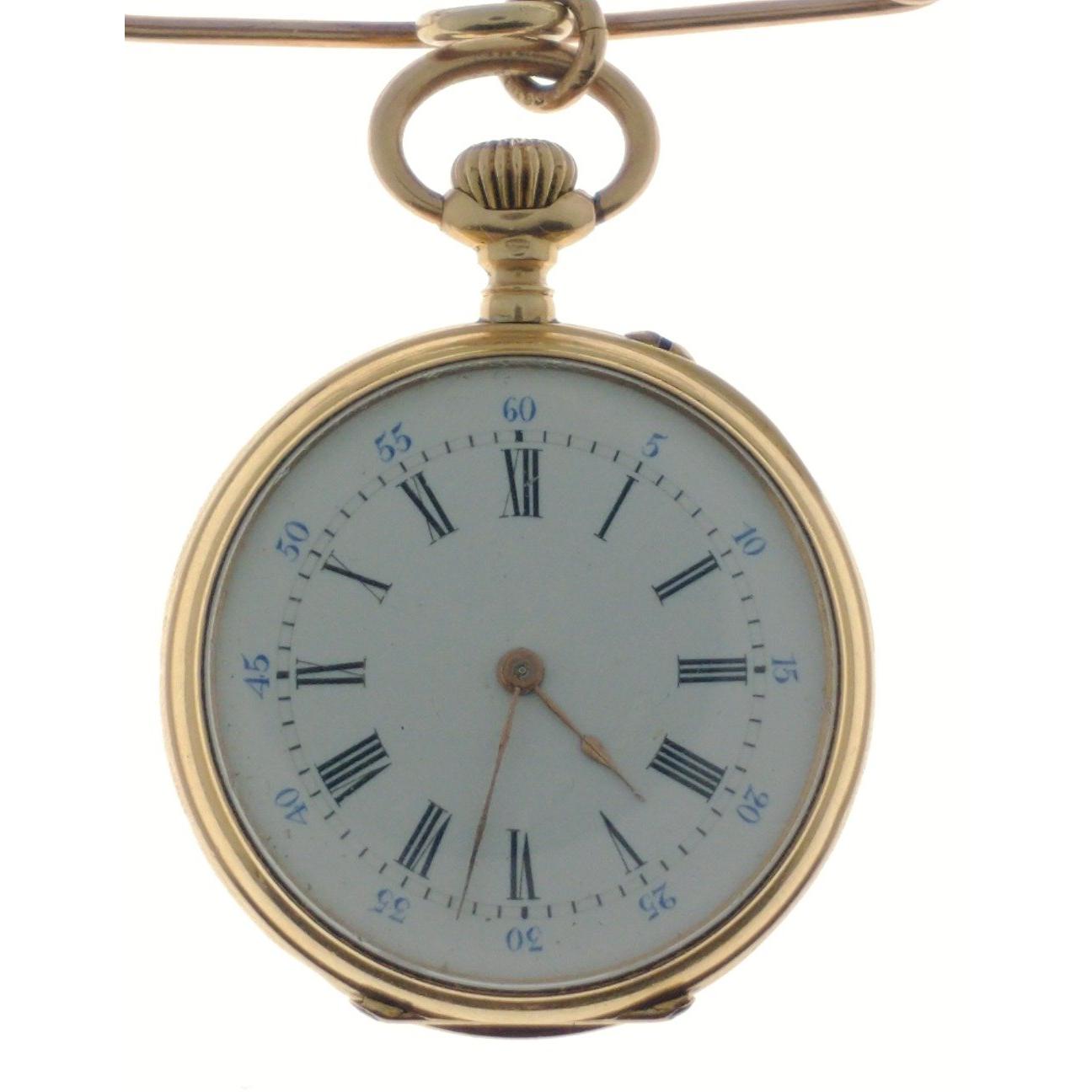 AN EXQUISITE QUALITY ladies VINTAGE 18k stamped case stamped yellow gold watch, beautifully decorated on the back plate with two 375 stamped supporting both 'safety-pins' 41g gross weight approx - in working order ticking away nicely when wound on inspection