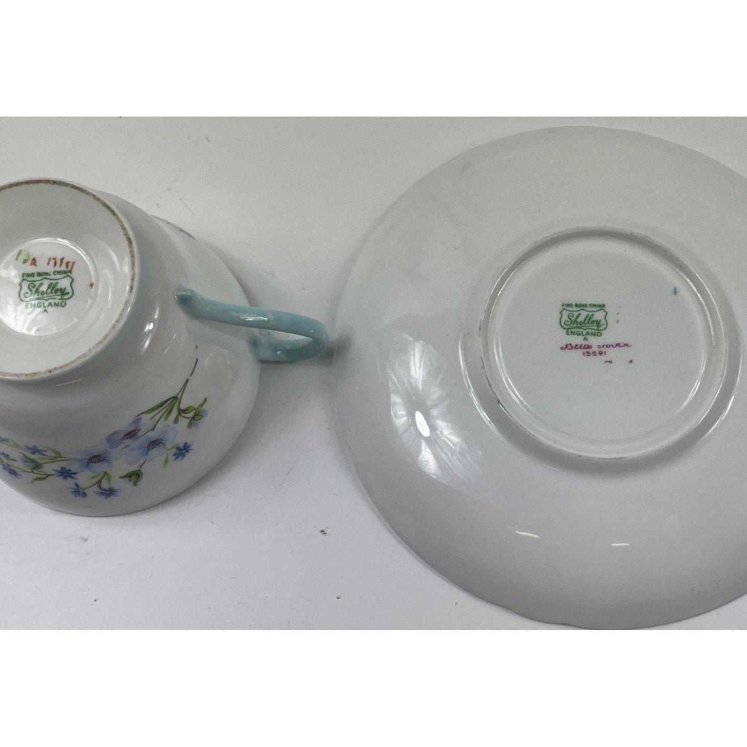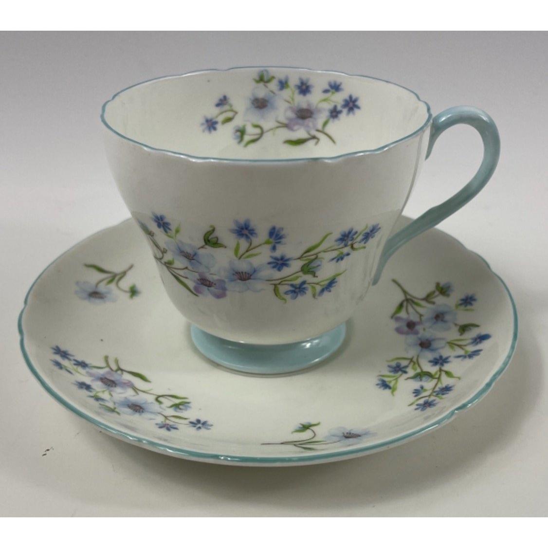 A vintage SHELLEY 'Blue Rock' tea set to include 6 each of cups, saucers, side plates, plus milk jug, sugar bowl and cake plate - no chips, or signs of damage repair noted.Approx 21 pieces