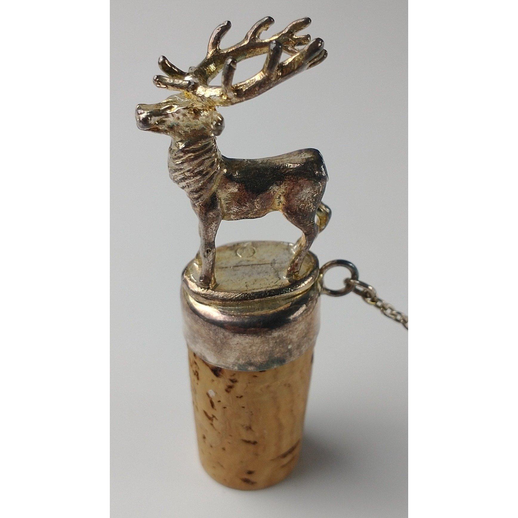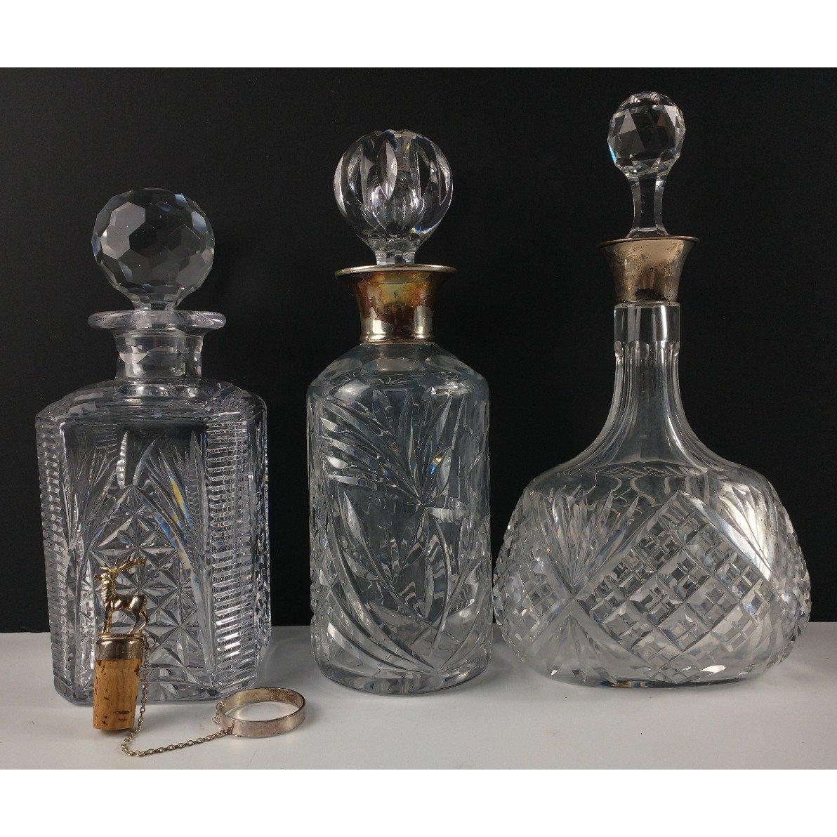 Three decanters including 2 with white metal collars plus a cork bottle top surmounted by a stag, attached to a bottle ringApprox 4 pieces