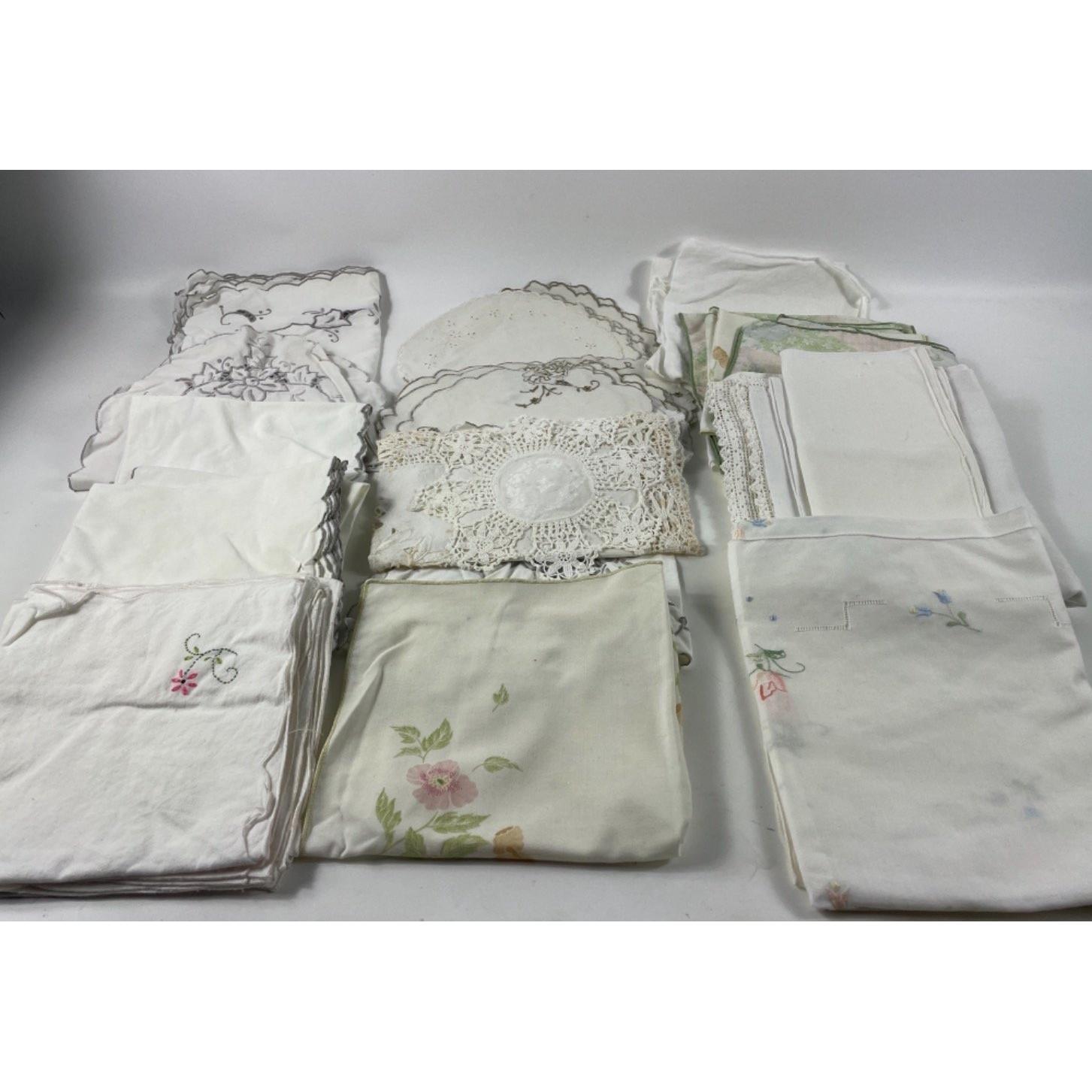A mixed lot of table linens, place mats, napkins with a hand-embroidered tea cosy and lace trimmed Christmas stocking etc