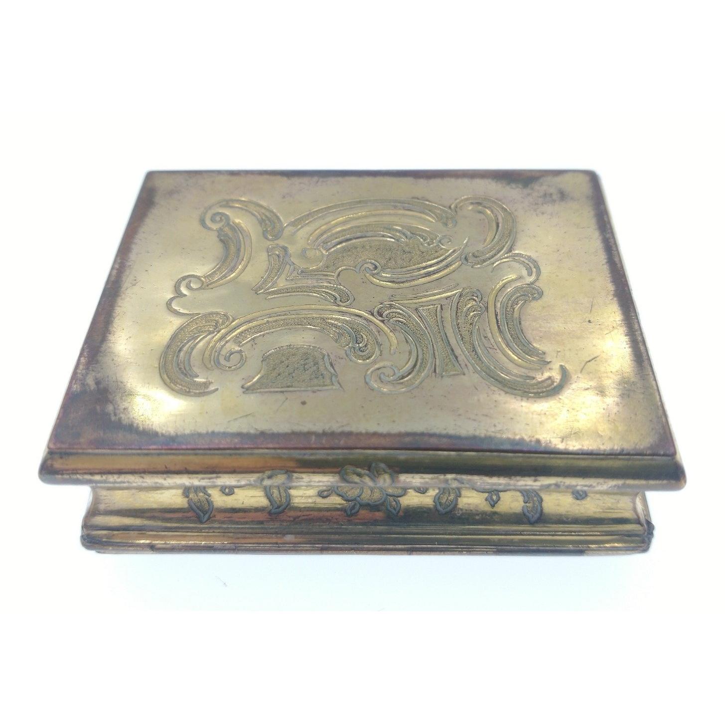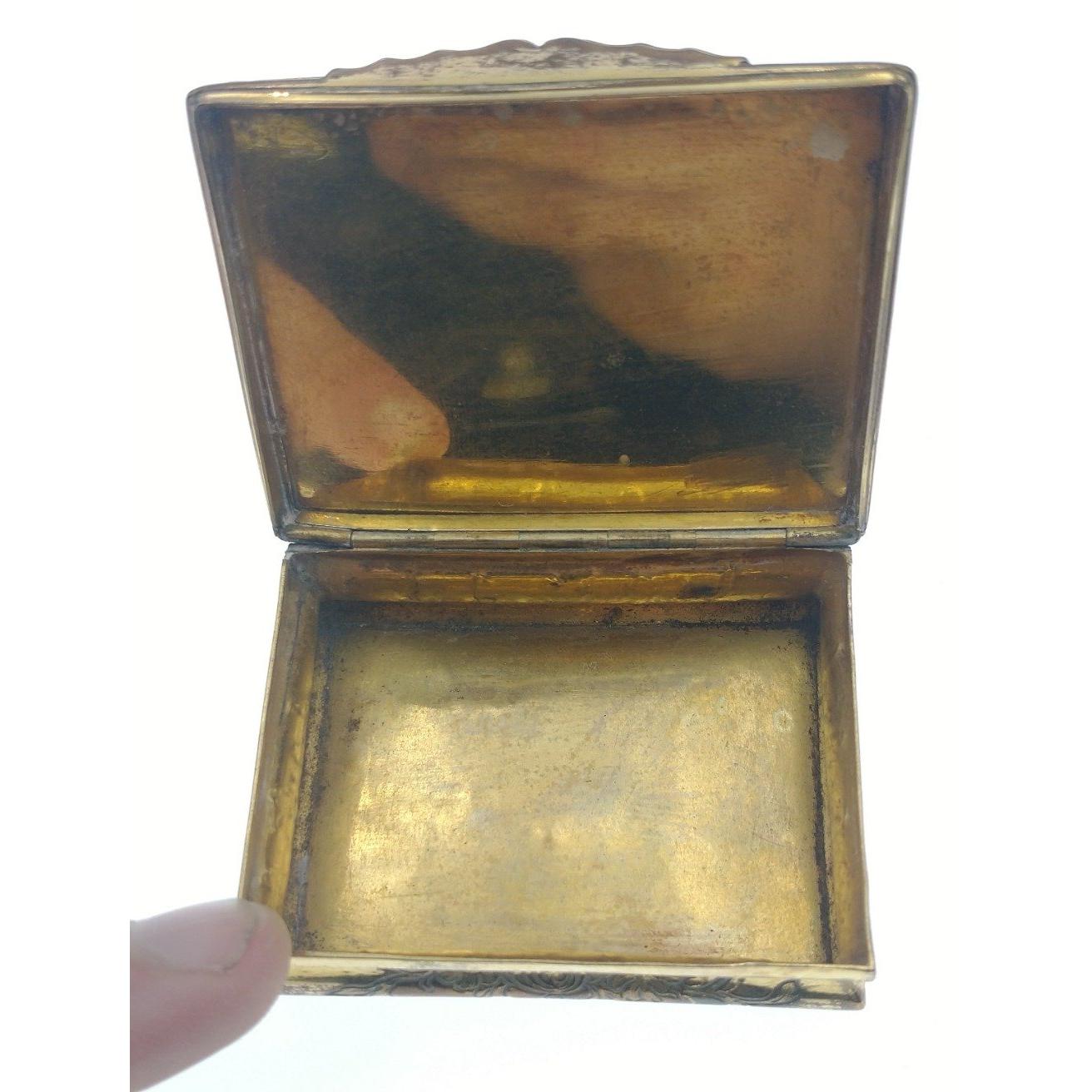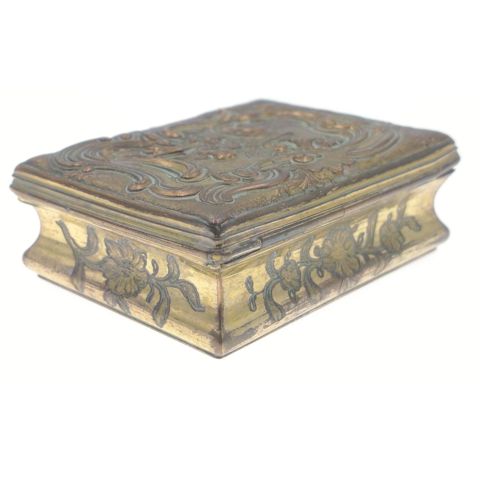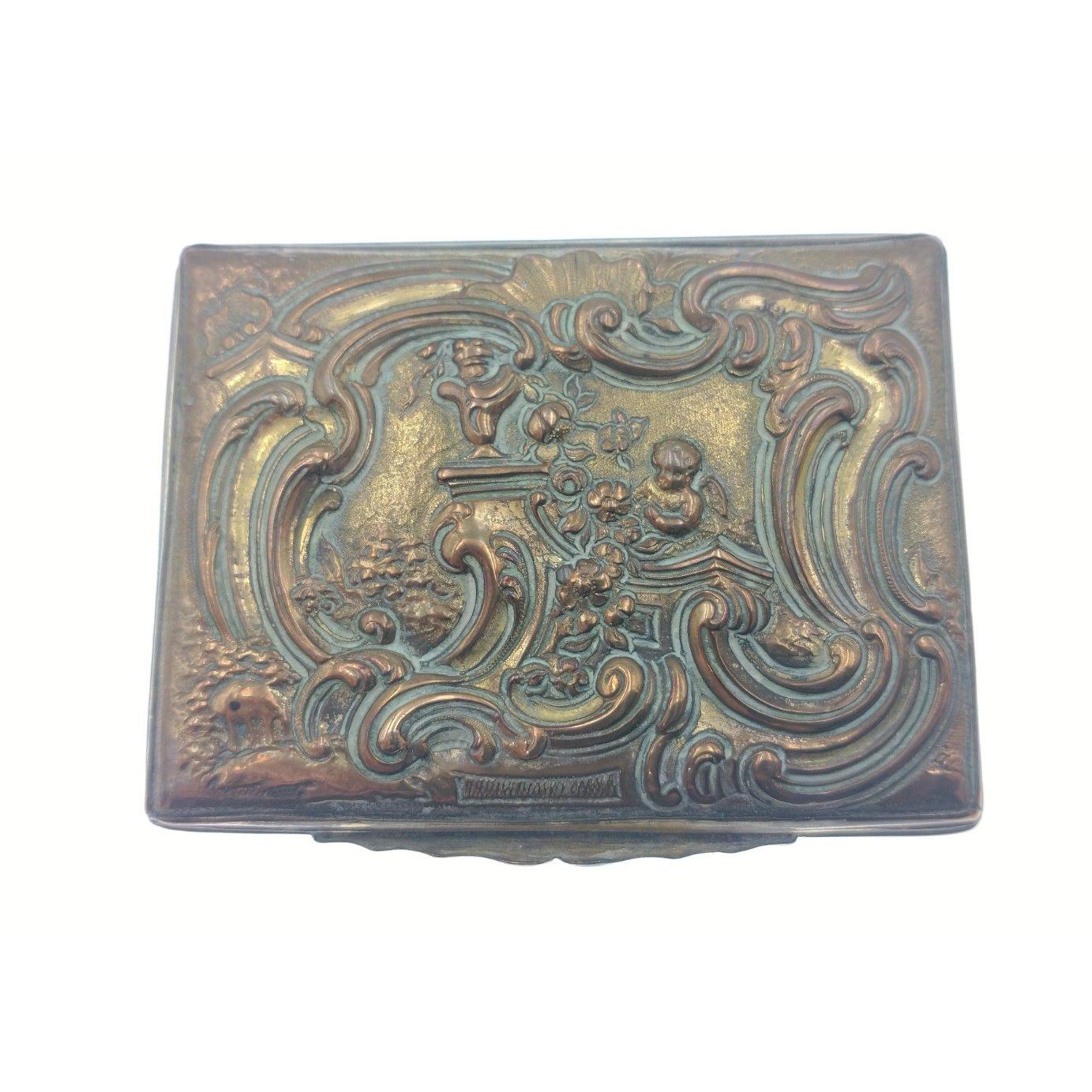 A rather nice brass plated on copper late 19th century TRINKET lidded and hinged pill box with repousse design all round to include a cherub within the design on the lid - dimensions 6.5cm length x 5cm wirth x 2cm depth