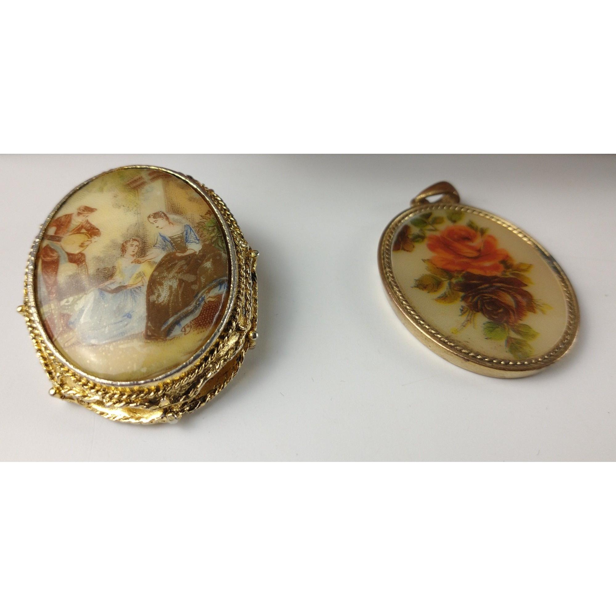 A brooch with two ladies and a troubador 4cm long, a pendant with a rose design 4cm long, plus a tan 2-layer cantilevered jewellery box with brown velvet lining, 23 x 17 x 10cm highApprox 3 pieces