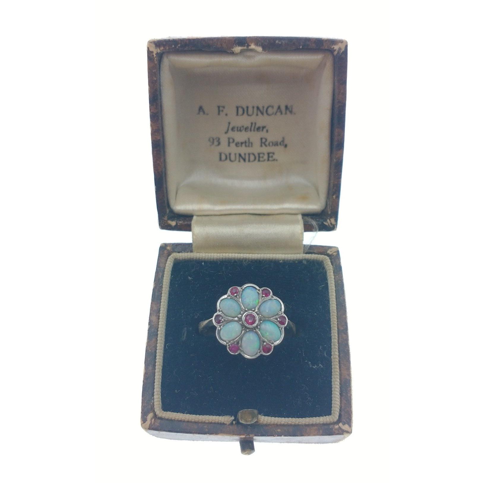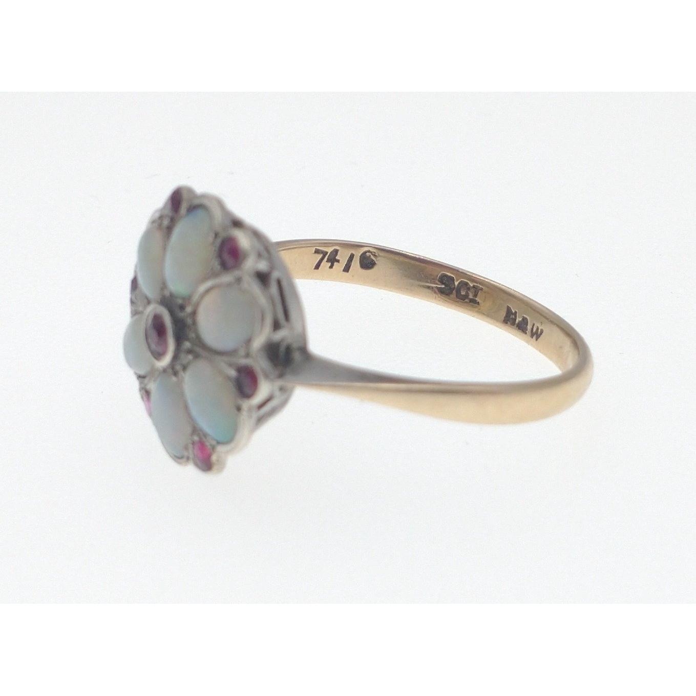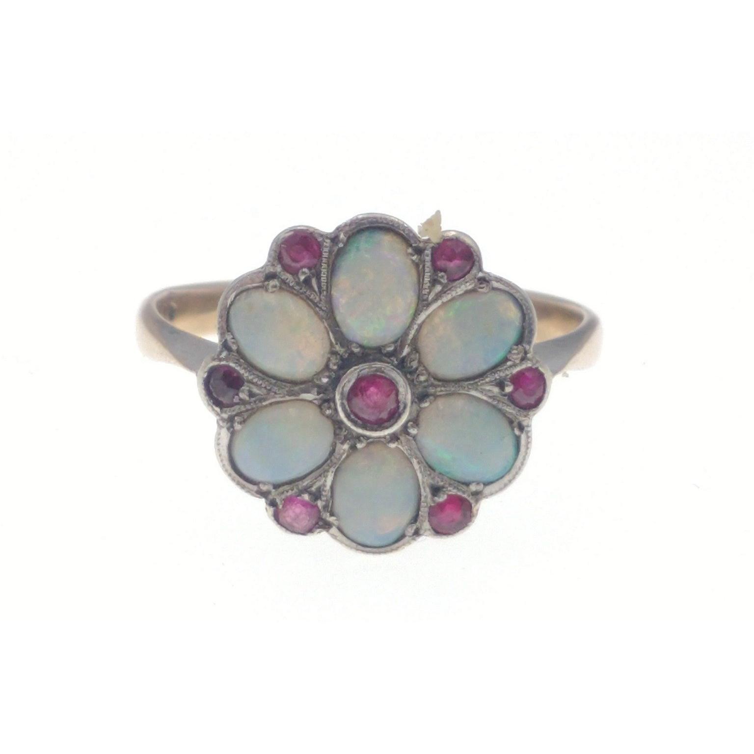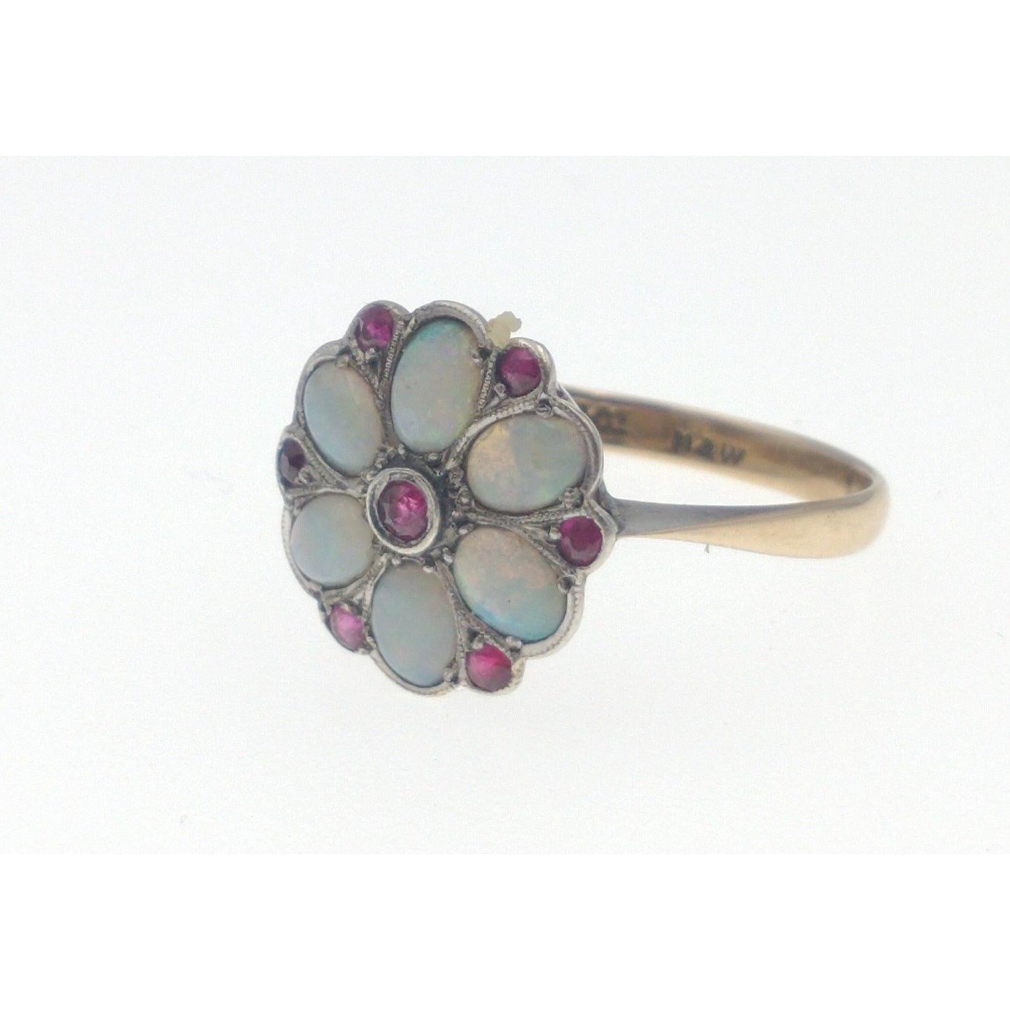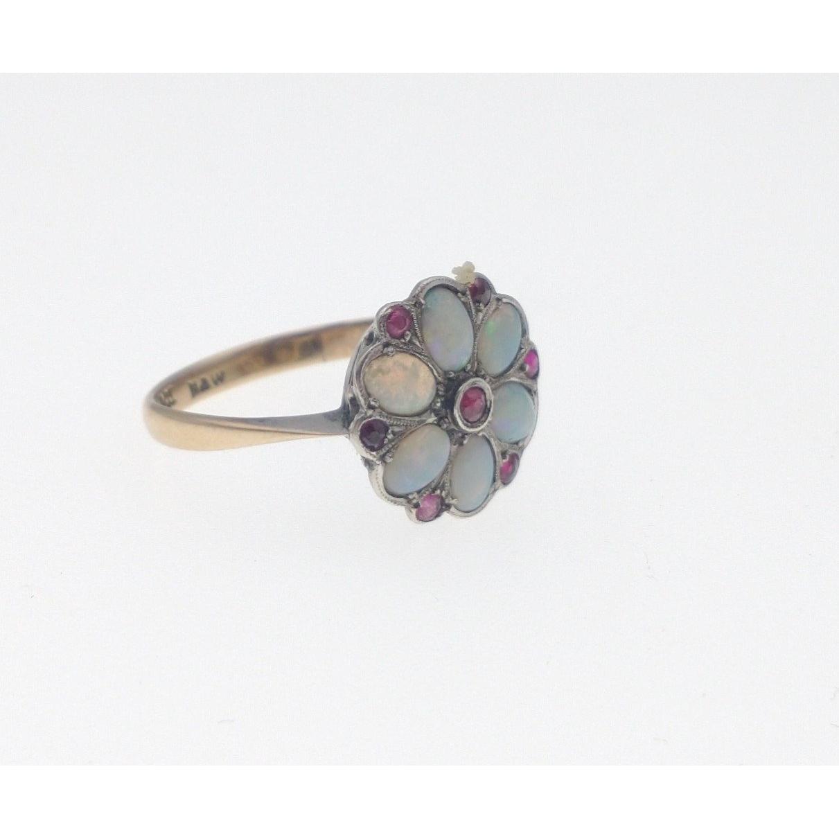A 9ct gold opal ring with 6 opals and 7 red stones in a flower-head pattern, size M/N gross weight 2g