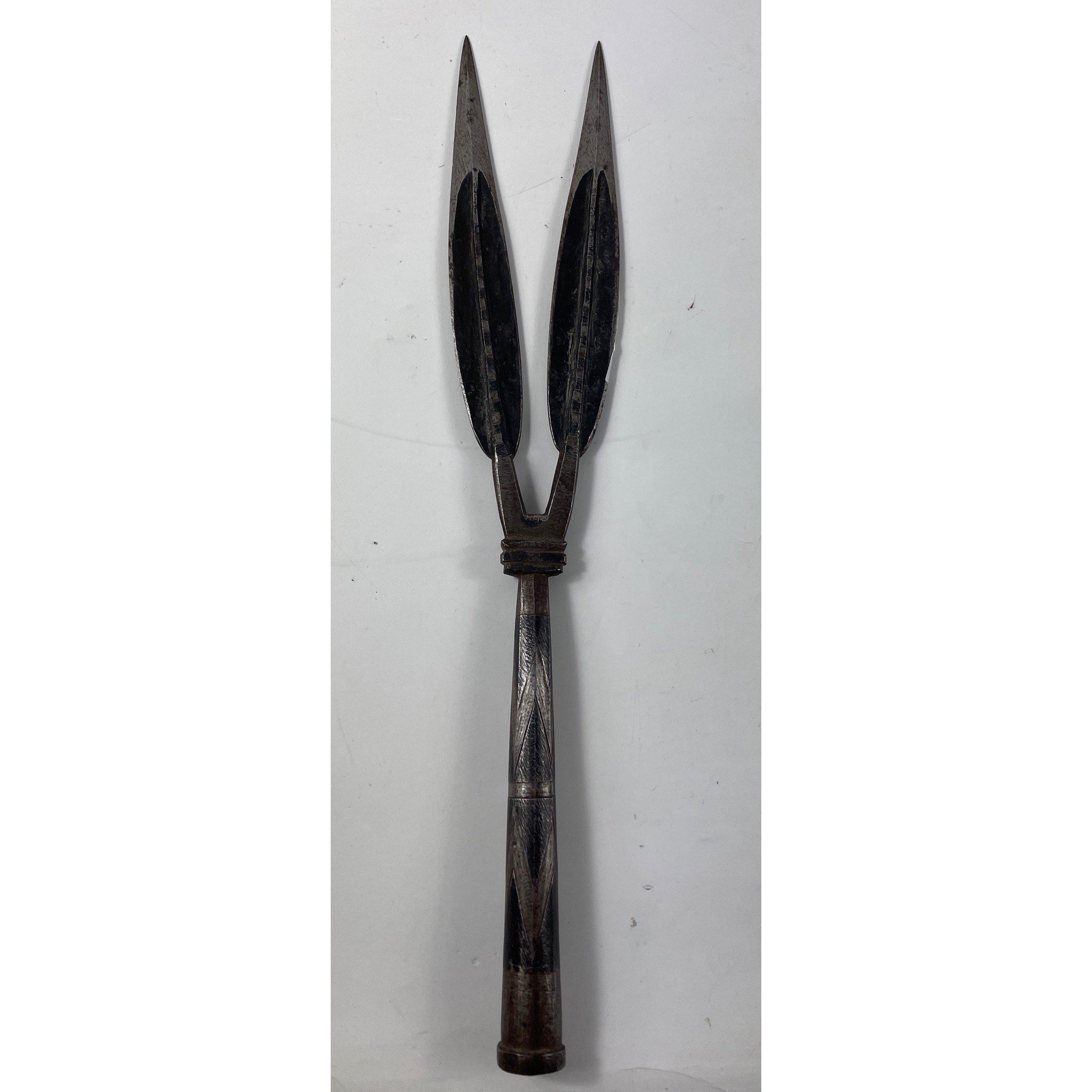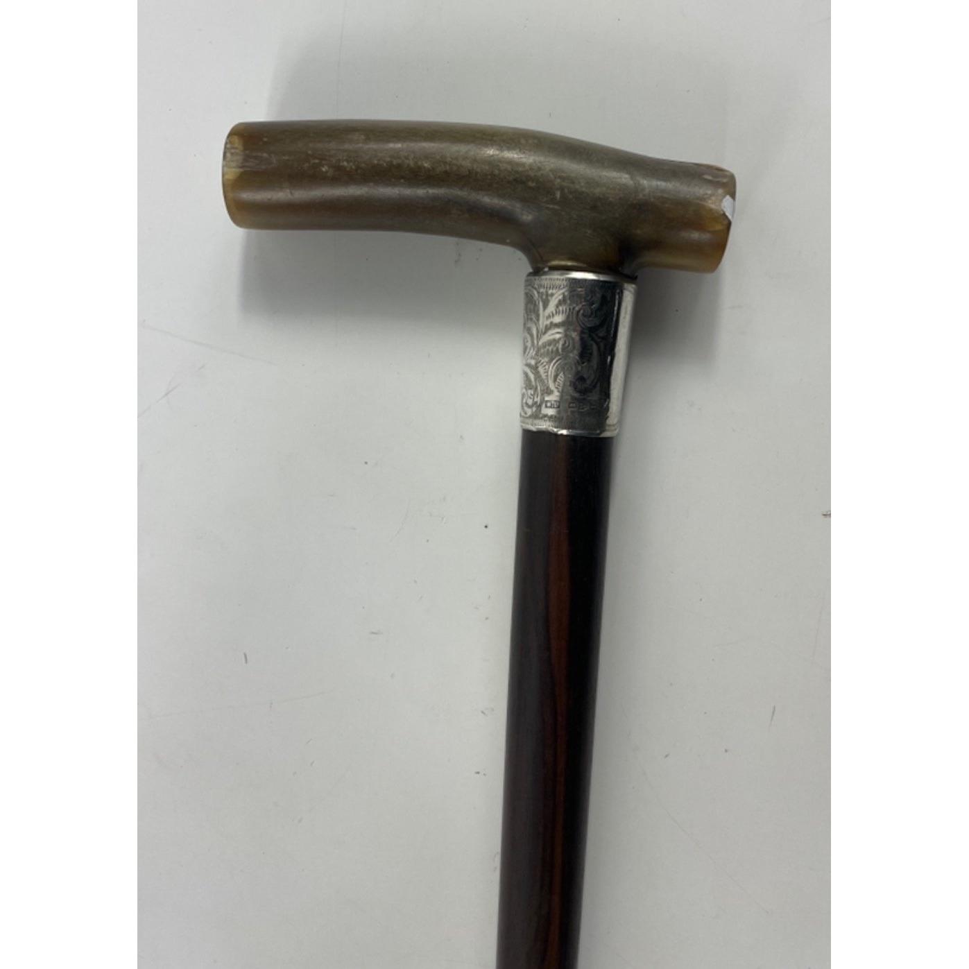 Two WALKING STICKS, both with silver collars hallmarked Chester, both 89cm long, the first dates to 1895, the second to 1892 , plus a lightweight stick with pyrography decoration memorialising theatres of war from the Great War and a throwing spear 123cm long with a wooden shaft accompanied by a twin-pronged head