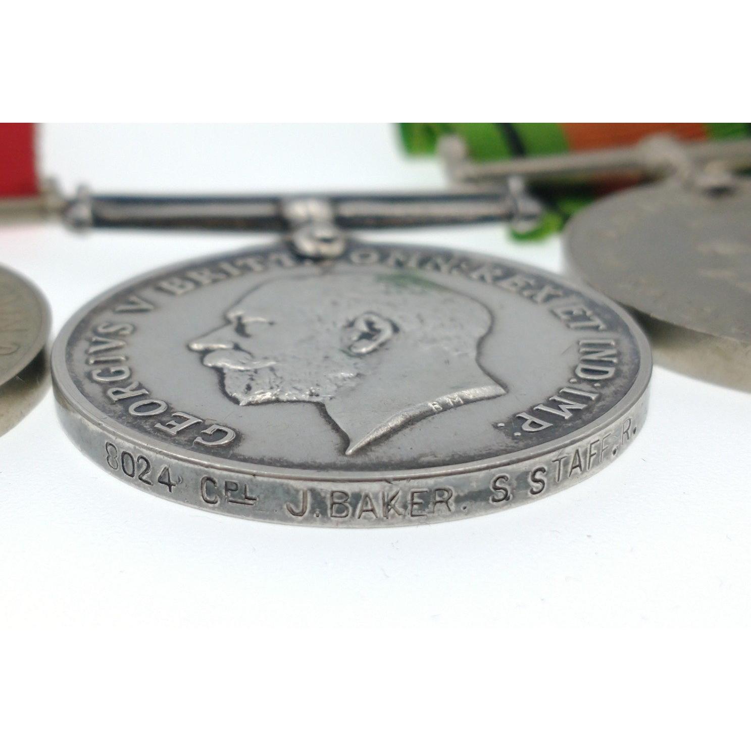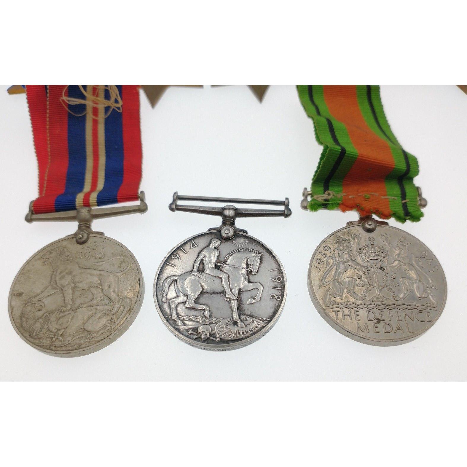 A collection of service medals to include 1914-18 awarded to Lance Sergeant John Baker of the South Staffordshire regiment, the 1939-45 DEFENCE MEDAL with ribbon, the 1939-45 SERVICE MEDAL with ribbon, the 1939-45 STAR with ribbon, the AFRICA STAR with ribbon, the PACIFIC STAR with ribbon, the ITALY STAR with ribbon, the ATLANTIC STAR with ribbon