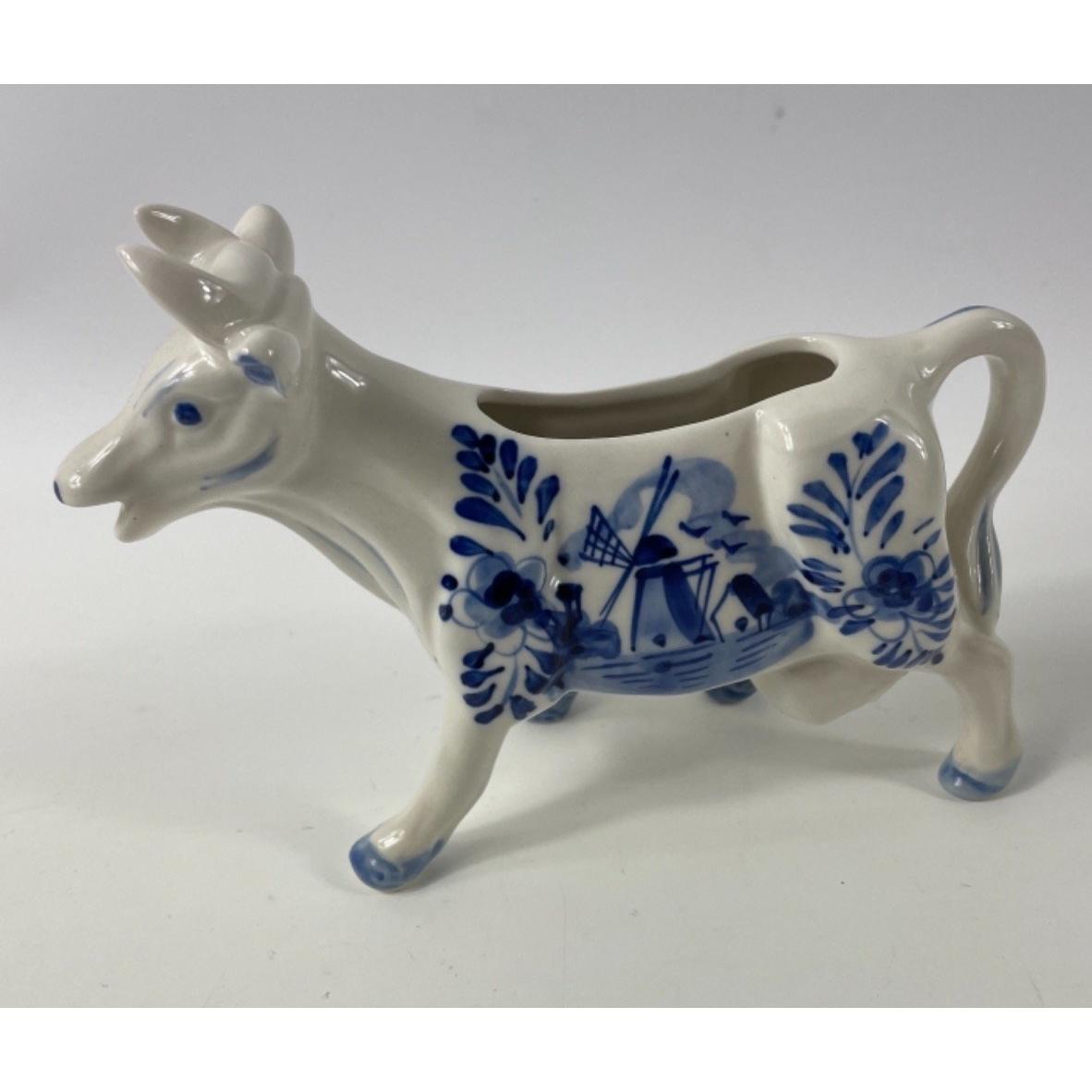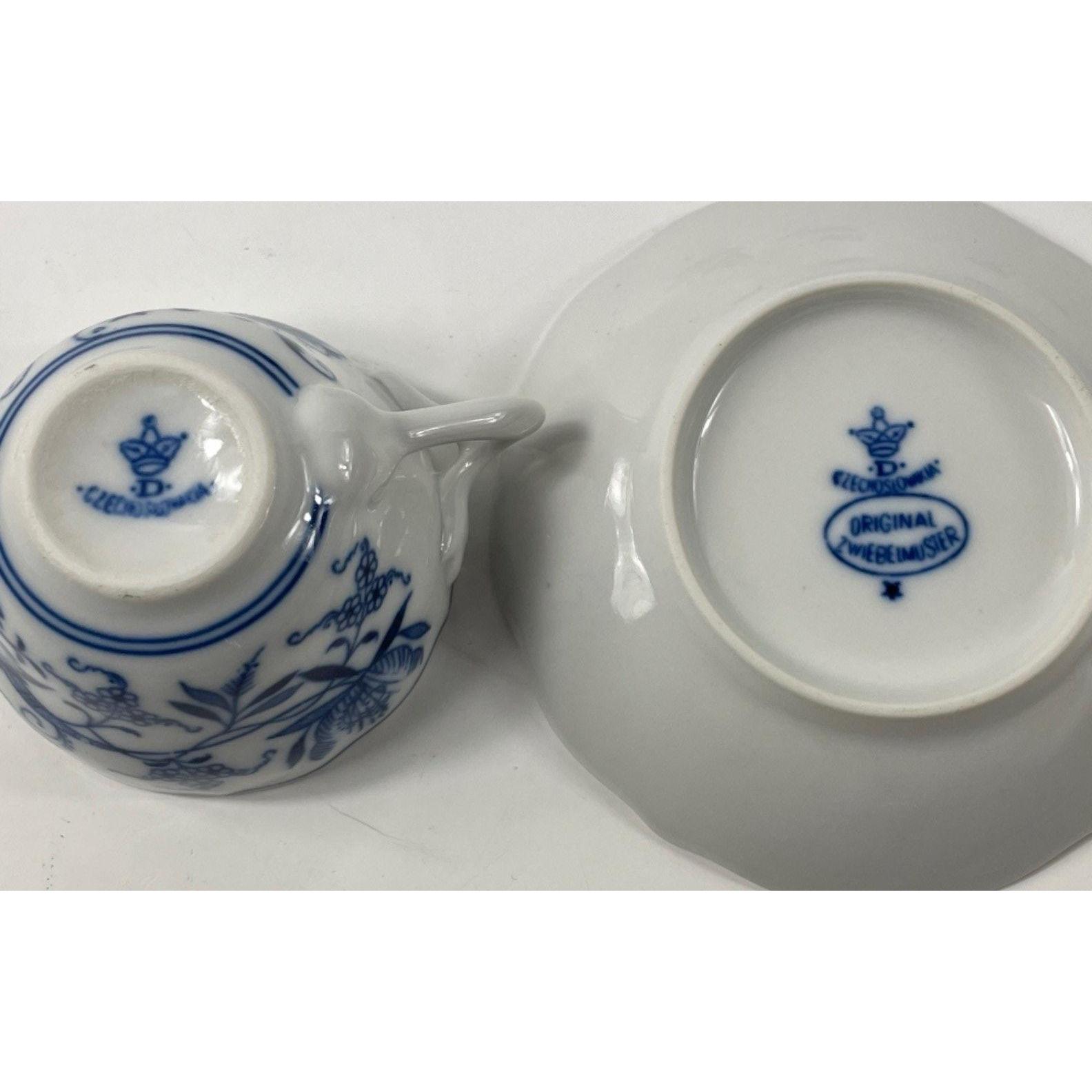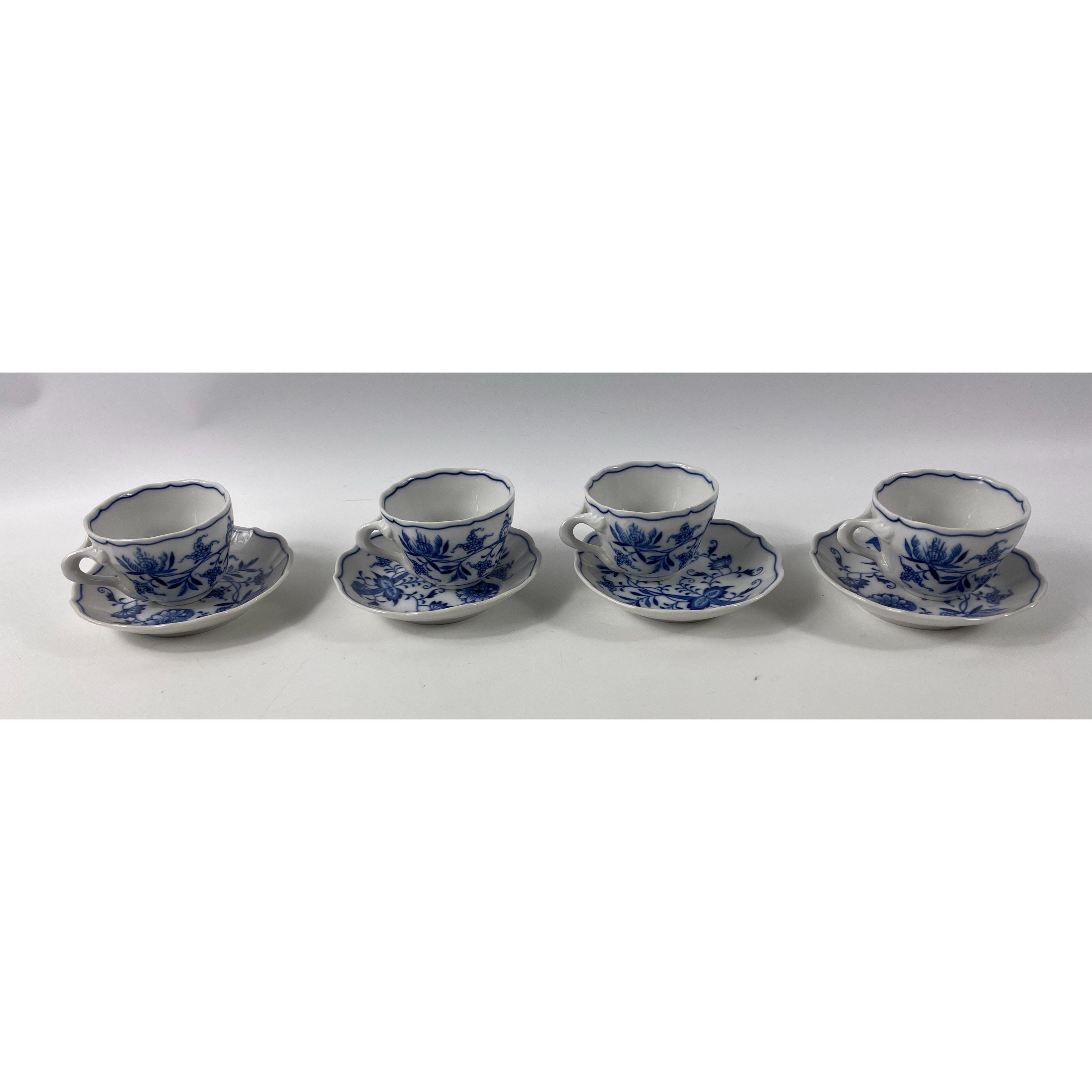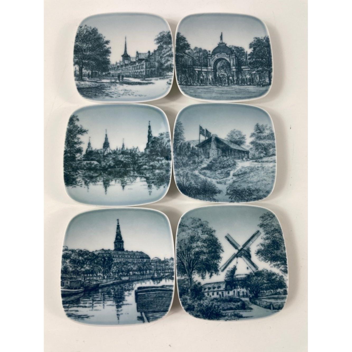 A boxed set of six vintage BING & GRONDAHL royal Copenhagen Porcelain Kjeld Bonfils Mini Plates nos. 1710/5708, 9709/708, 1712/5708, 1711/5708, 1707/5708, 9708/708 plus a set of Czechoslovakian Bohemian Zwiebelmustera 4 cups and saucers in blue and white, and a hand-painted blue and white Delft creamer