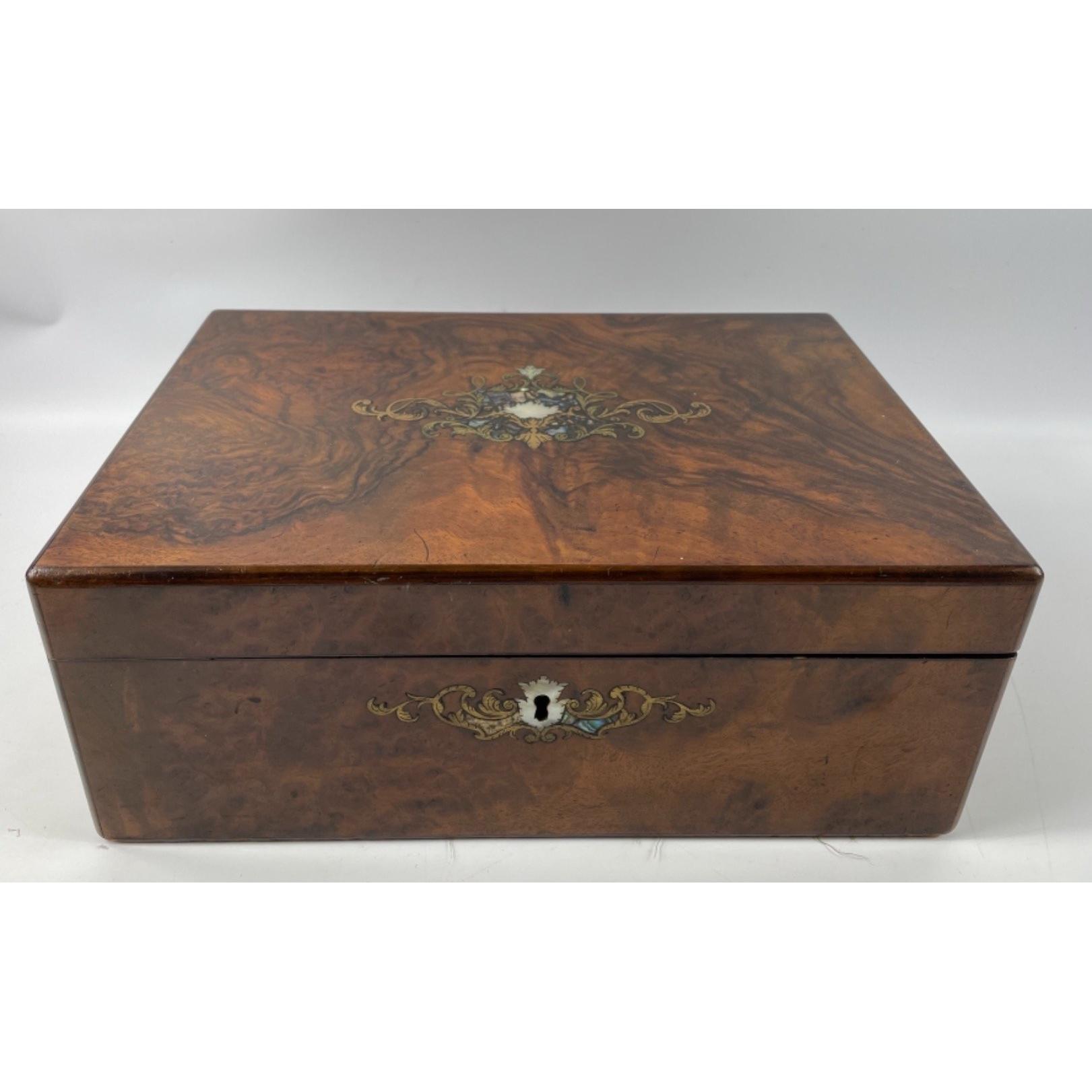 A nice antique ROSEWOOD lidded box with centred brass and mother of pearl inlay on the lid top - dimensions 35cm x 24cm x depth 13cm approx - currently used as a haberdashery box!