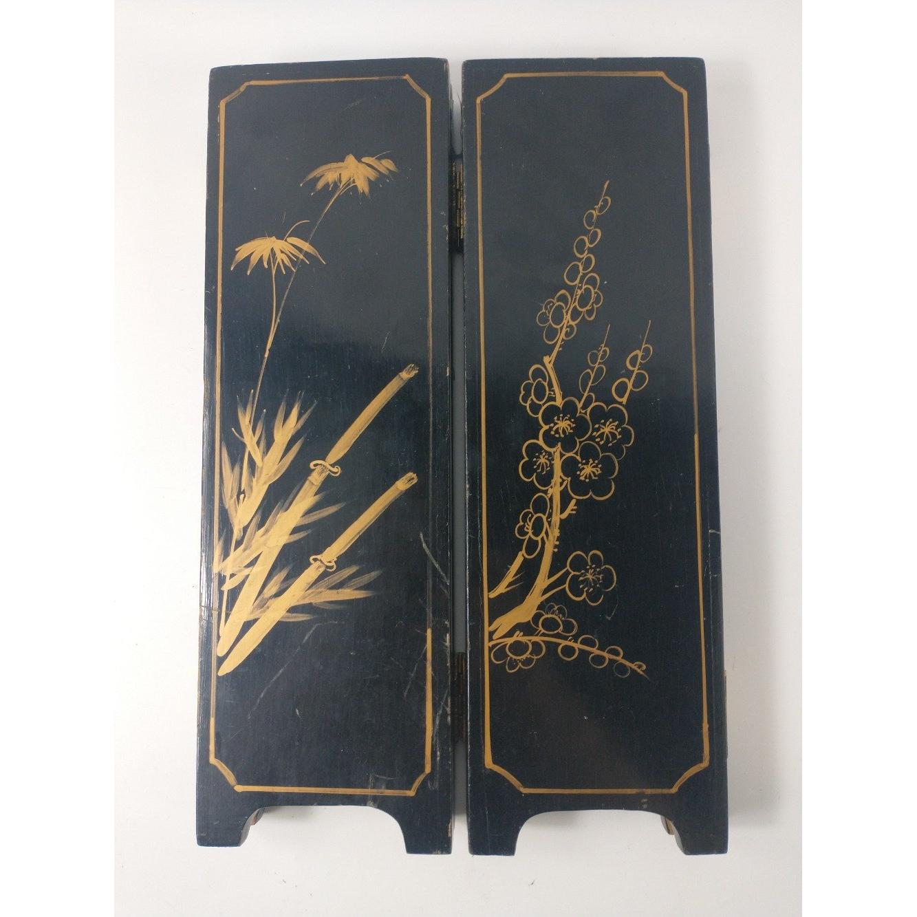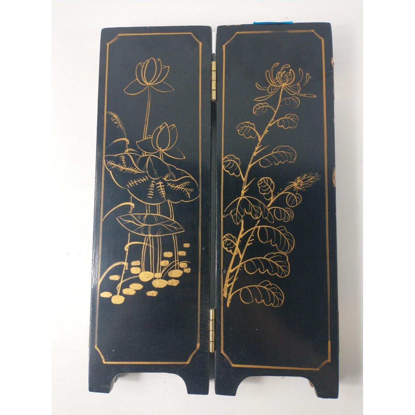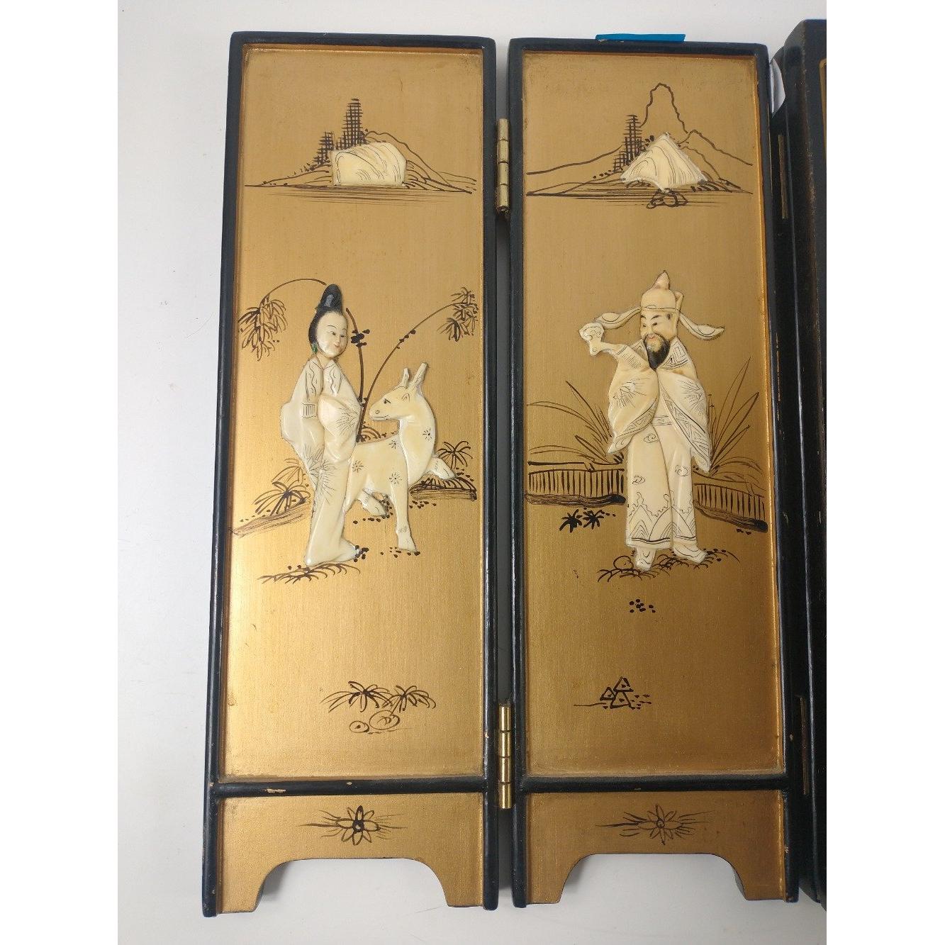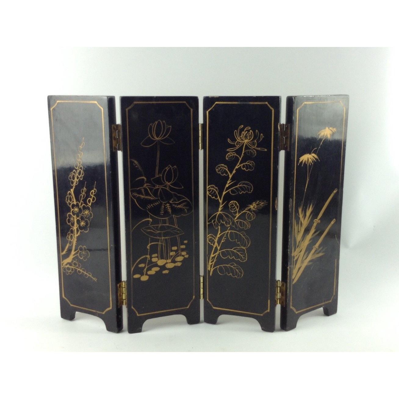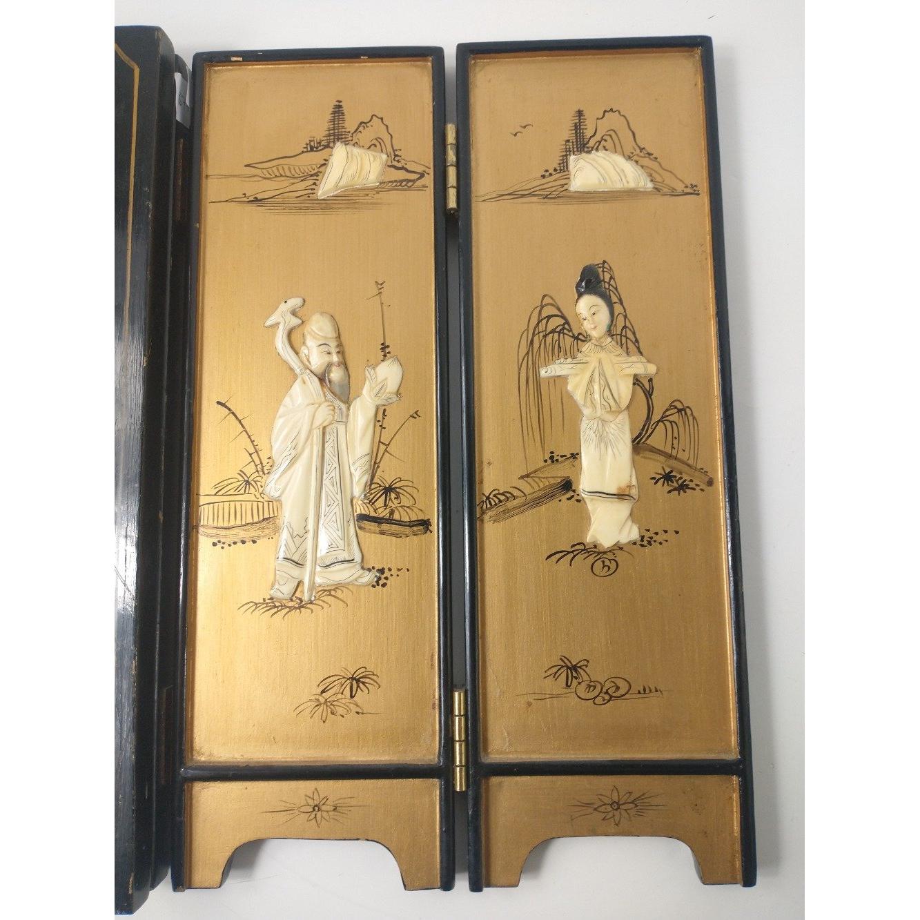 A small LACQUERED ORIENTAL hinged four panel ornamental decorative piece depicting traditional Oriental figures - dimensions 47cm long x 36cm height approxApprox 1 pieces