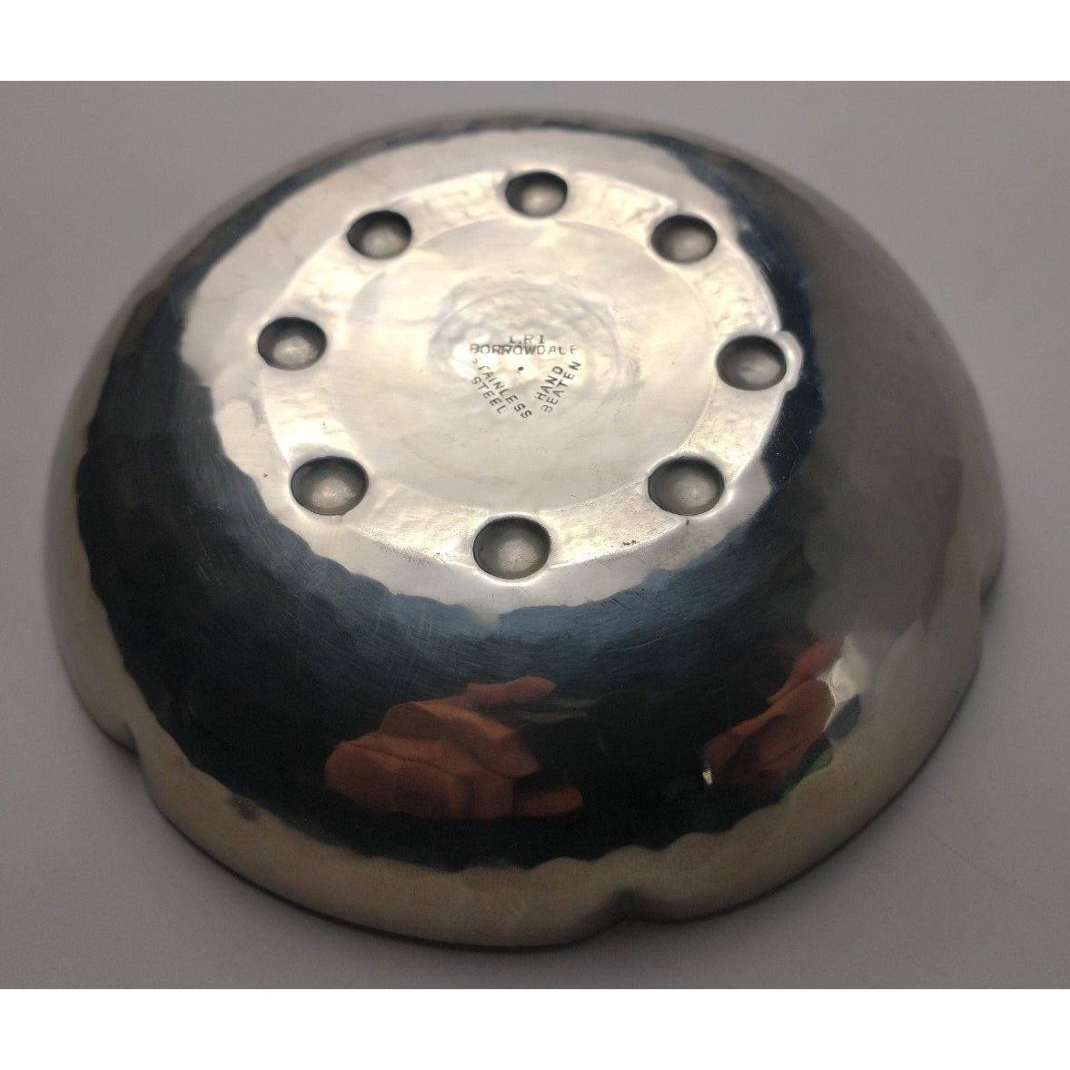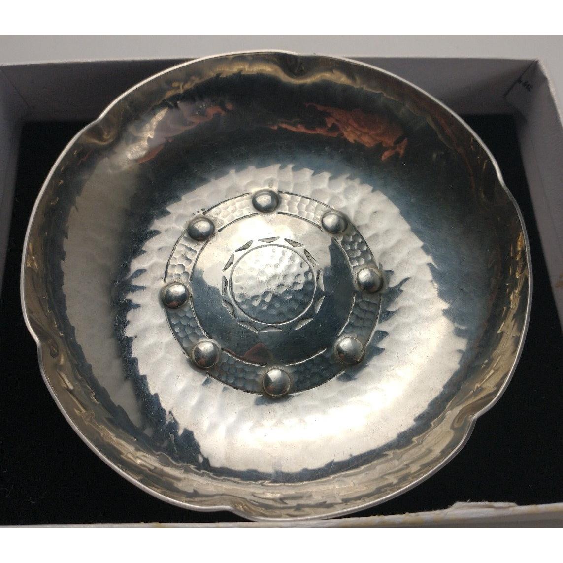 Arts and Crafts style pin dish by L.R.I BORROWDALE (stamp to base) hand beaten from stainless steel. W: 11cm approx H: 2cm approx Gross weight approx 77g