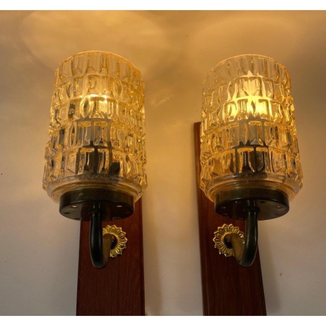 A pair of RETRO circa 1970's teak wall lights with pressed glass shades - would match your retro teak sideboard or teak dining table etc etc - dimensions 20cm height x 14cm(sticking out from the wall) with flex and plug extensions, but should be wired into the wall etc for maximum effect!