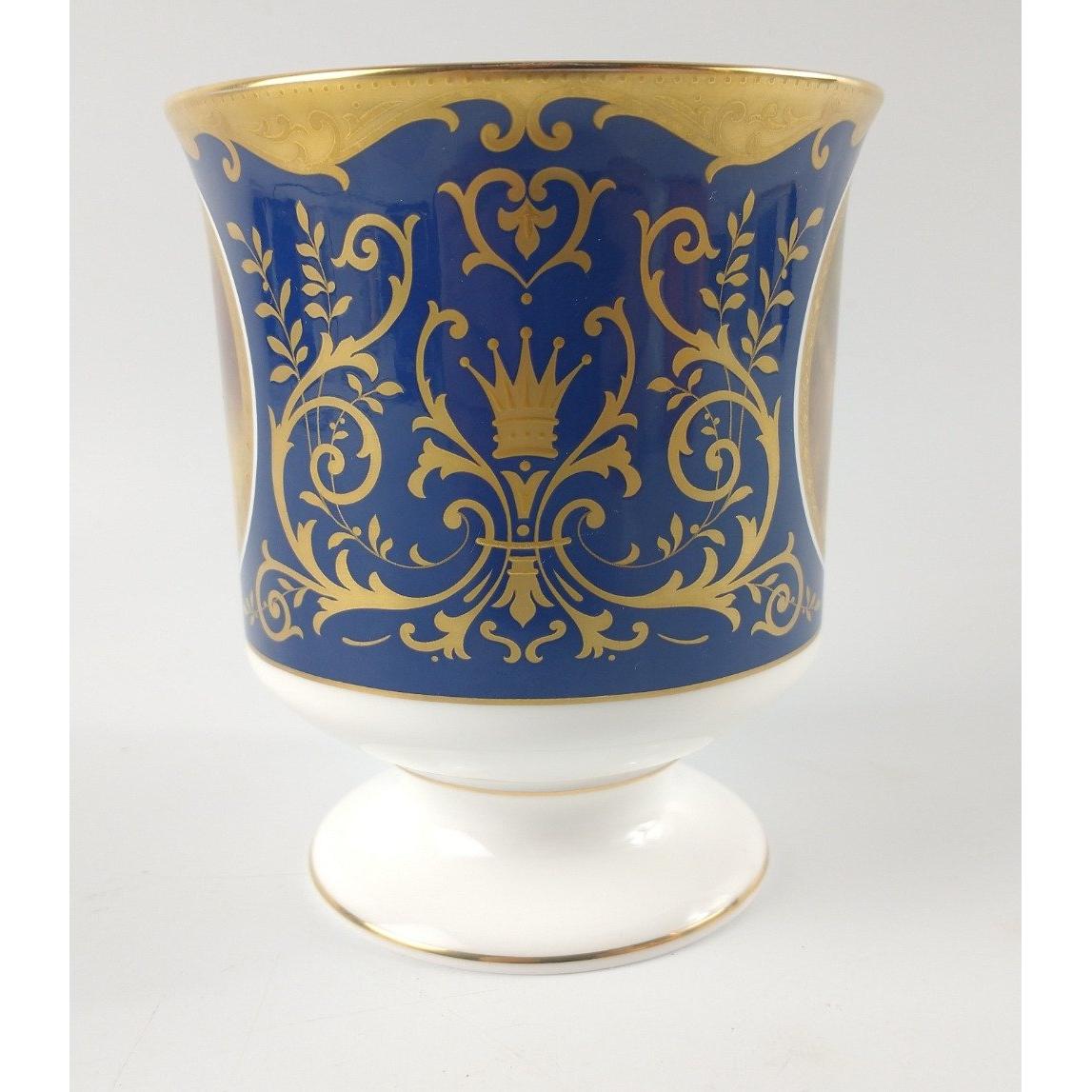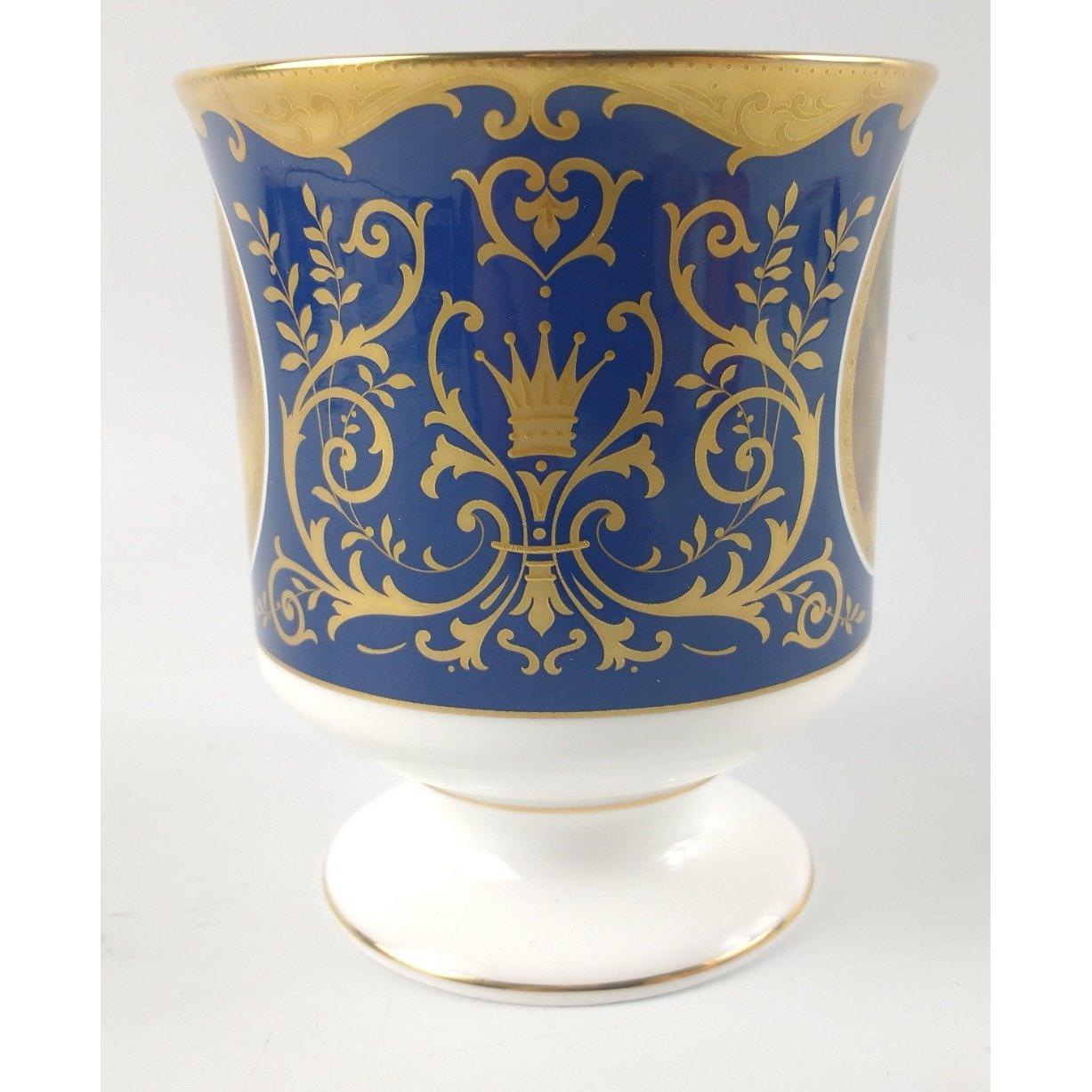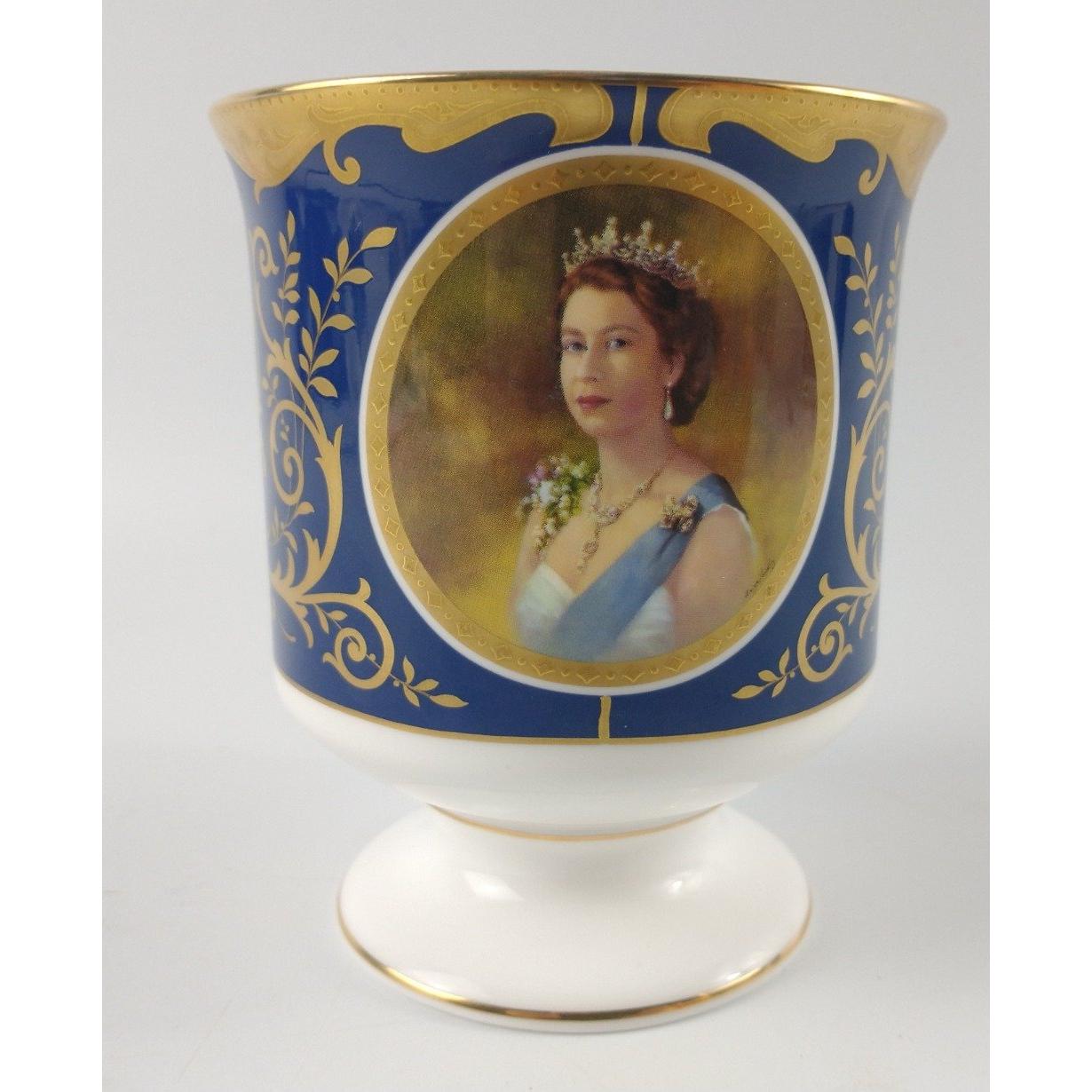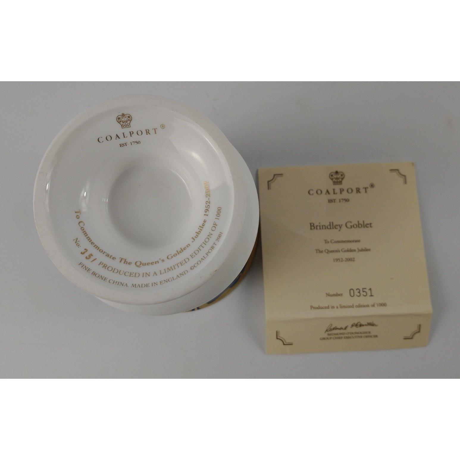 COALPORT limited edition (351/1000) Brindley Goblet to commemorate the Queens Golden Jubilee 1952-2002. Decorated with 2 portraits of Queen Elizabeth II on each side on a dark blue background with floral and crown giltwork in between. No: 351 produced in a limited edition of 1000, made from fine bone china in England copyright 2001. Comes with certificate of Authenticity