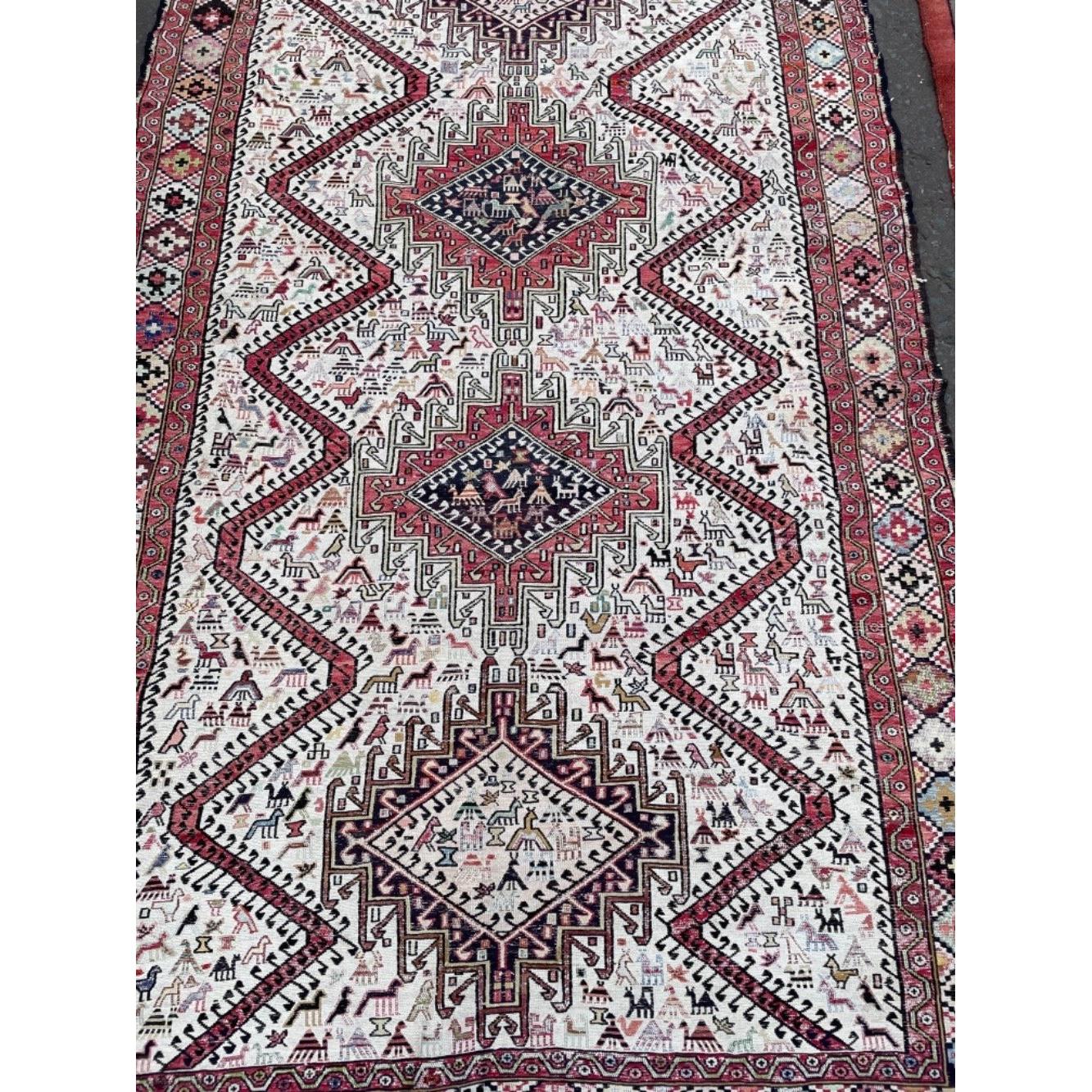 A vintage INDIAN handmade and hand knotted traditional design rug in a creaming/reddish background depicting wild animals and birds in a symmetrical design 6ft x 3.5ft approx