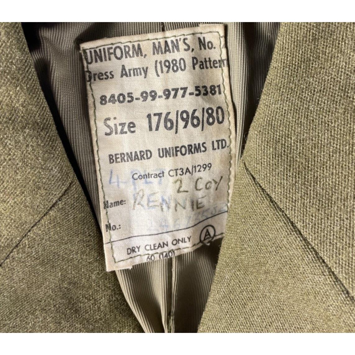 British Army uniform, a khaki green jacket with Bernard Uniforms Ltd label "2 COY RENNIE 24673582" having Gaunt of Birmingham staybrite buttons, Coldstream Guards epaulette insignia, double chevron rank insignia for the rank of Corporal, lower sleeve single chevron and medal ribbons for United Nations Cyprus medal and General Service medal