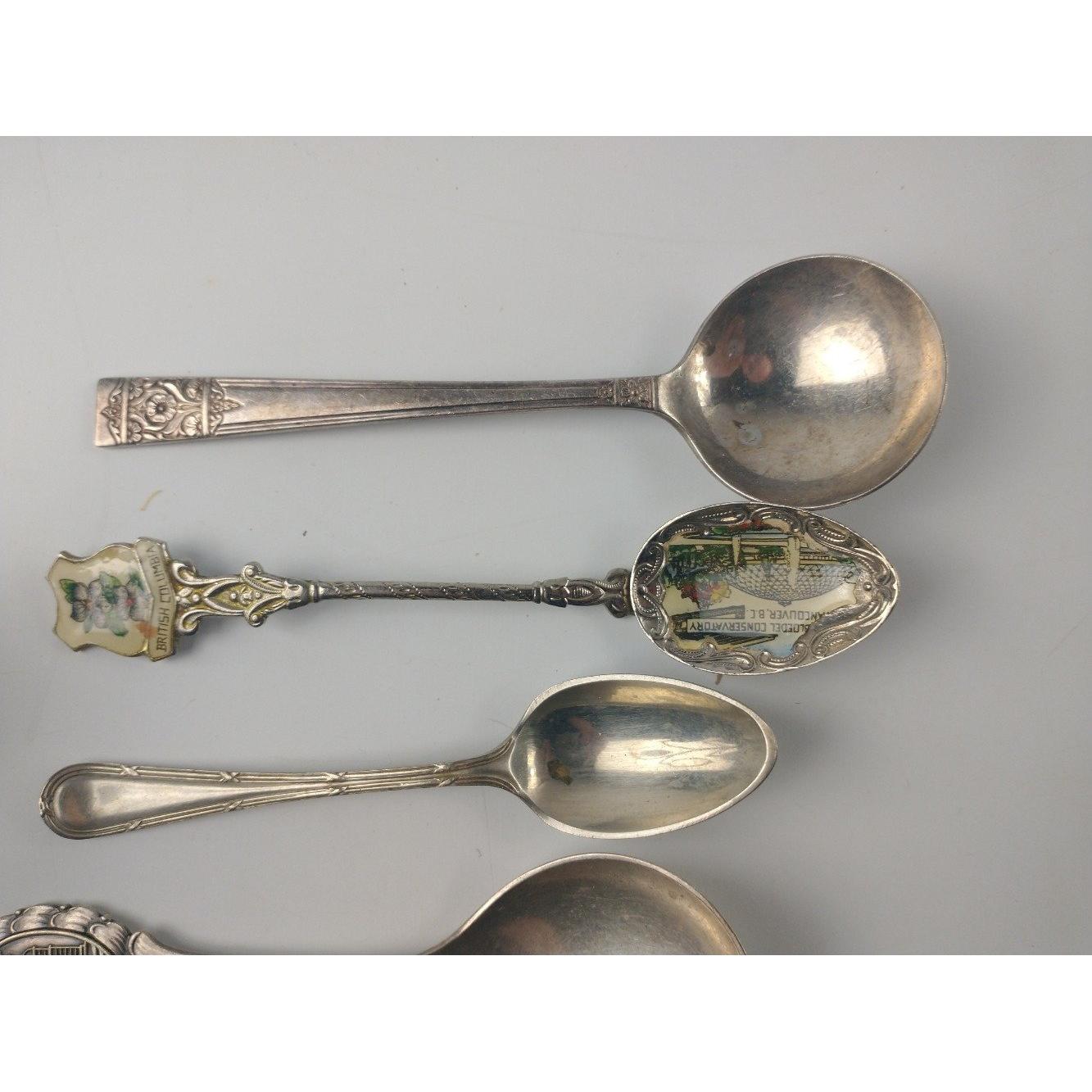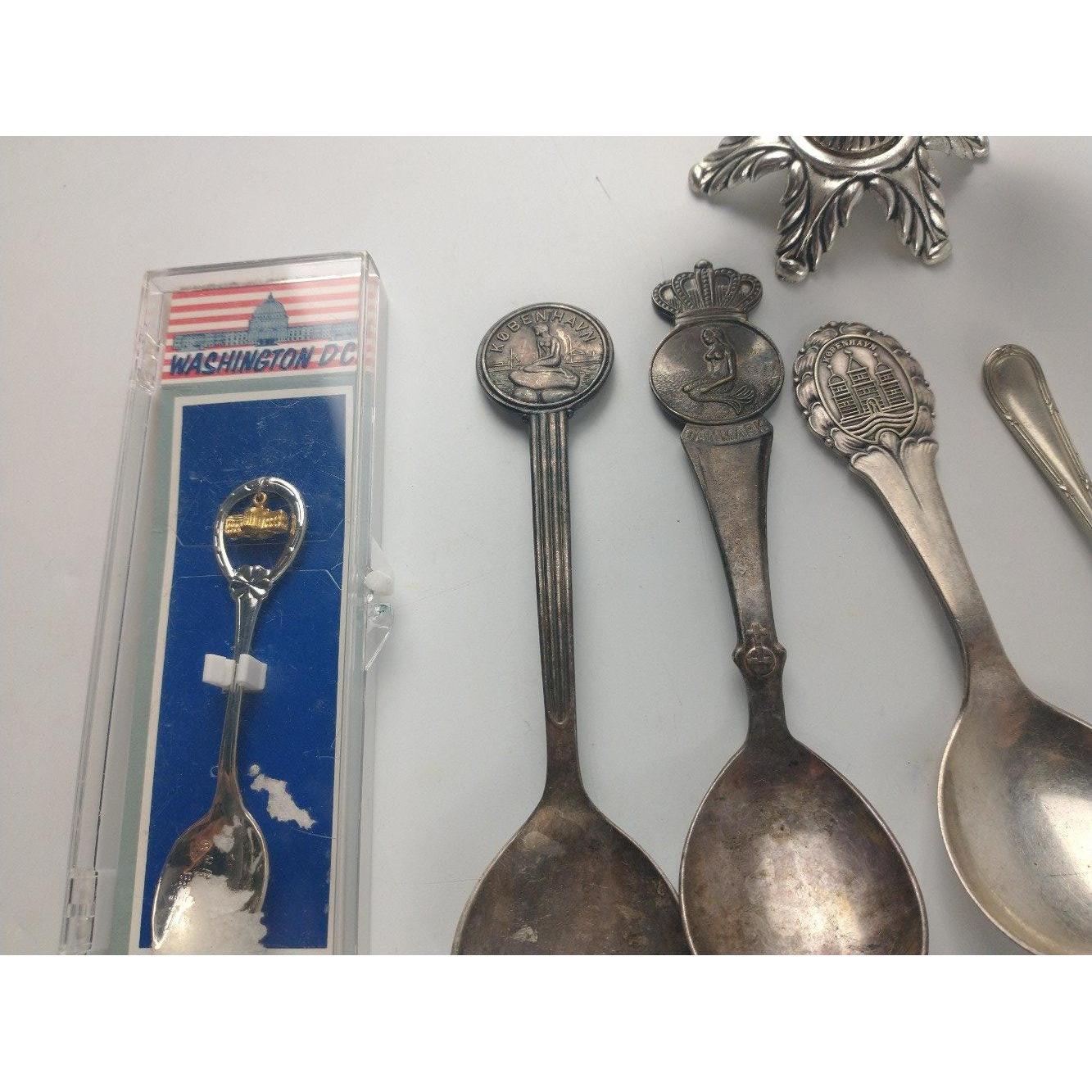 A small collection of white metalware to consist of collector's spoons from around the world including from Washington DC, British Columbia, Denmark etc and a small hanging photo frame for 5 mini-pictures