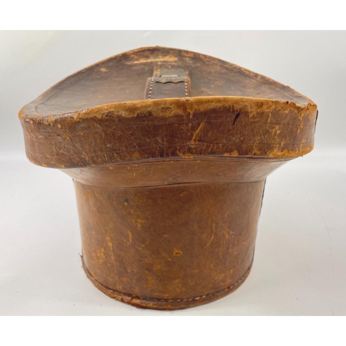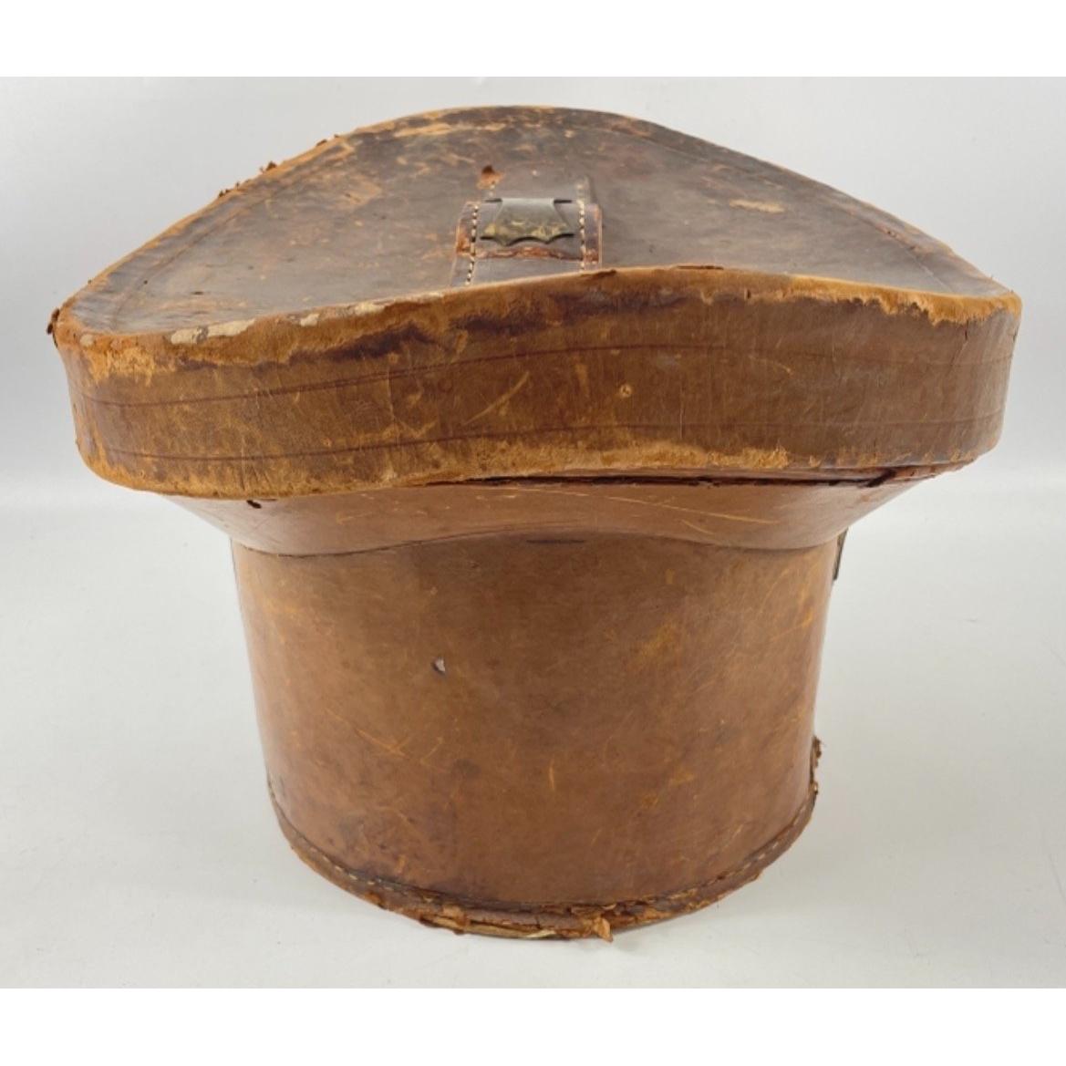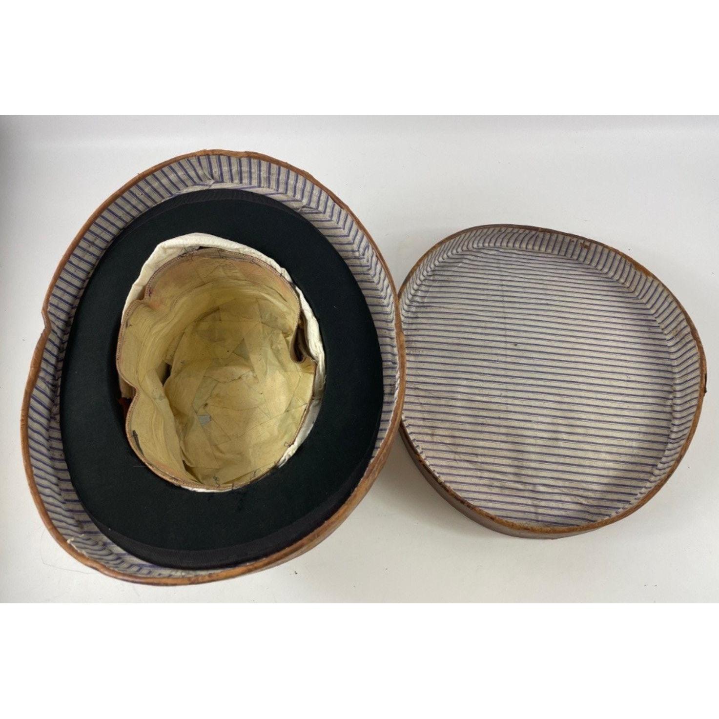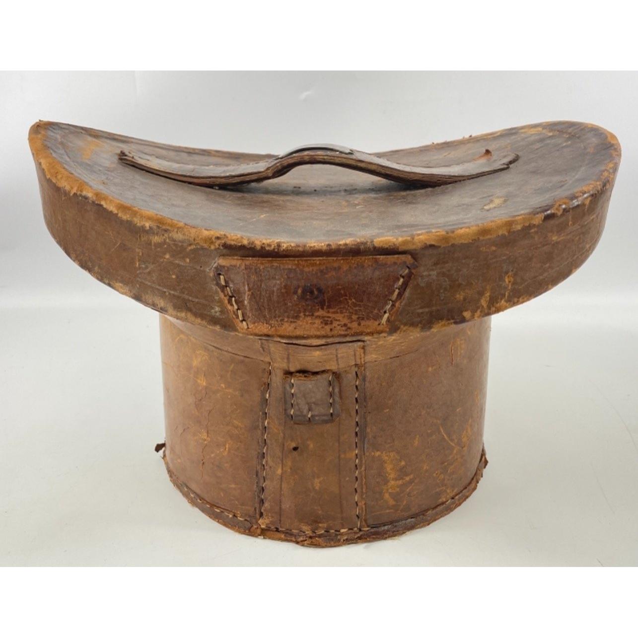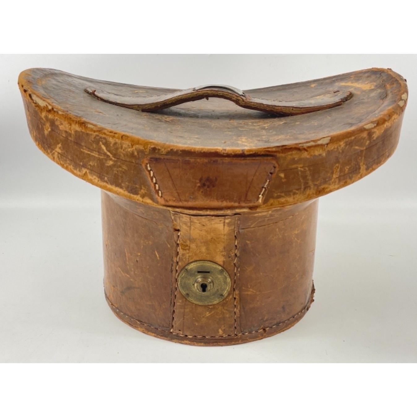 A VINTAGE TOP HAT WITH A FABULOUS VINTAGE LEATHER TOP HAT BOX (void dimensions 21cm diameter x 16cm inner depth - no maker's label present on either item.Approx 2 pieces
