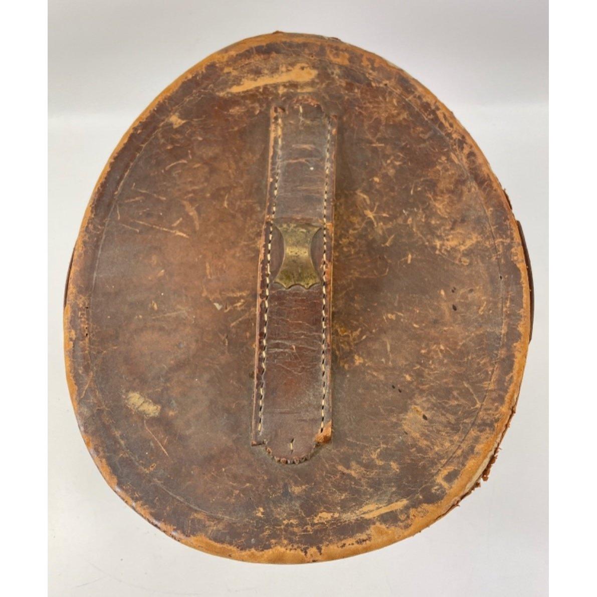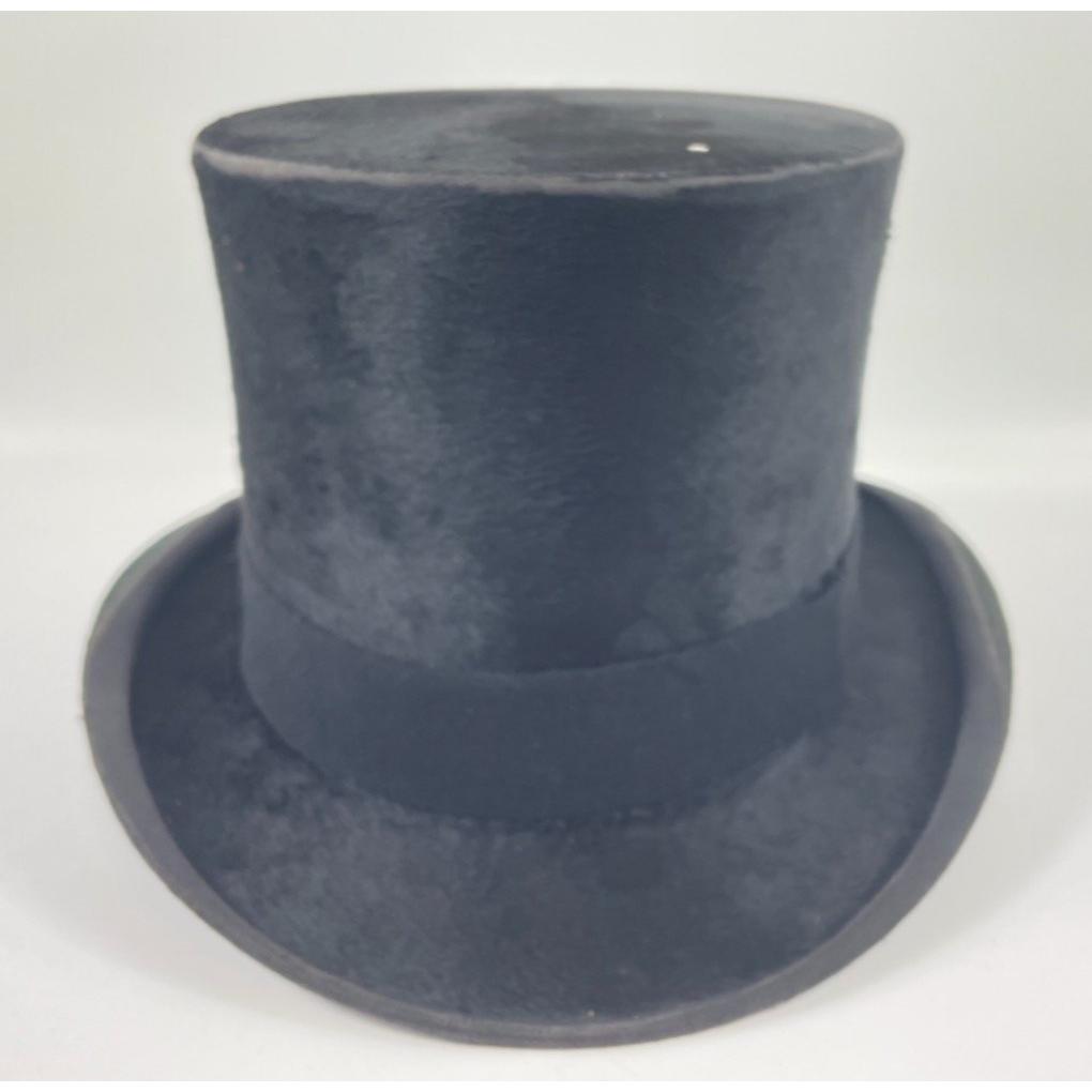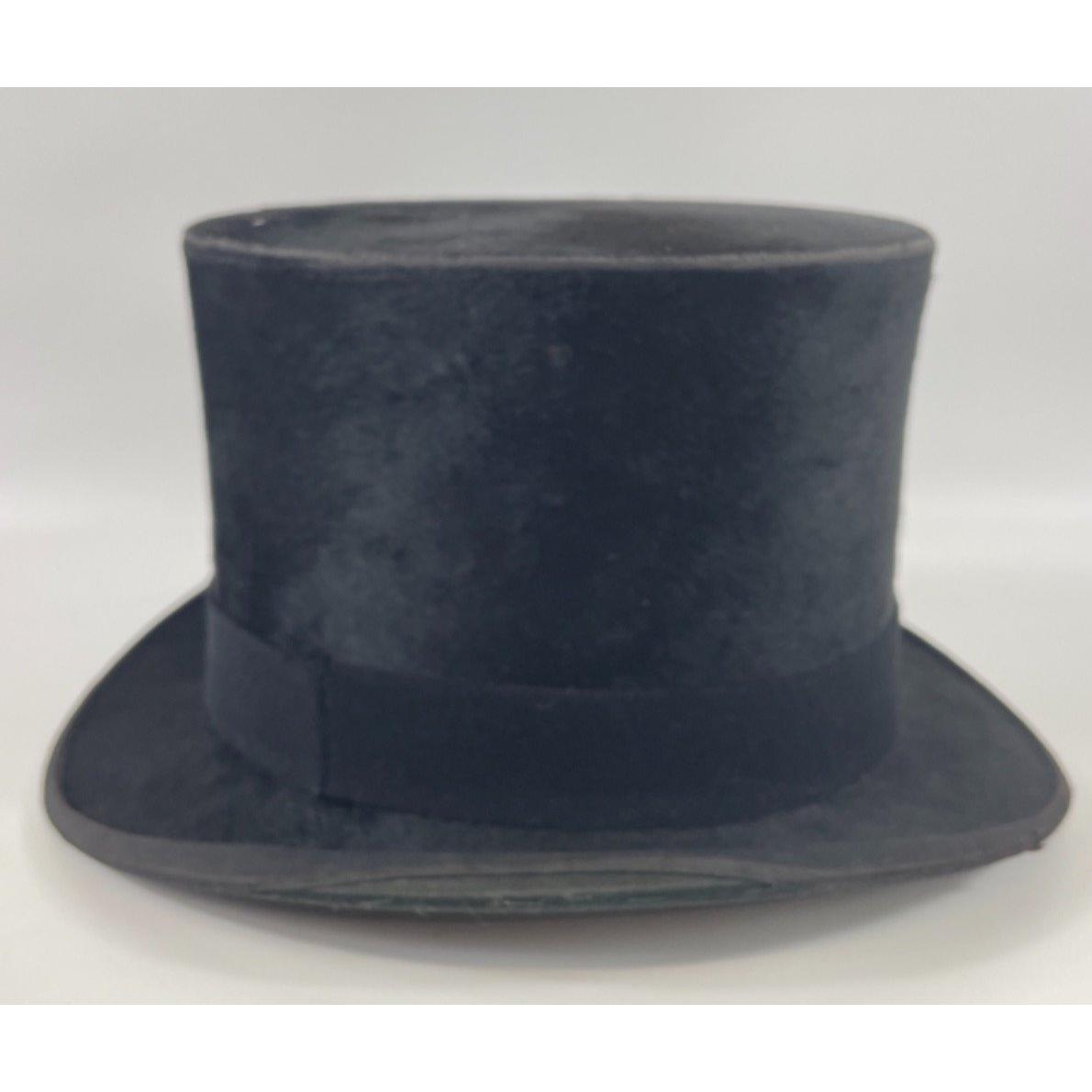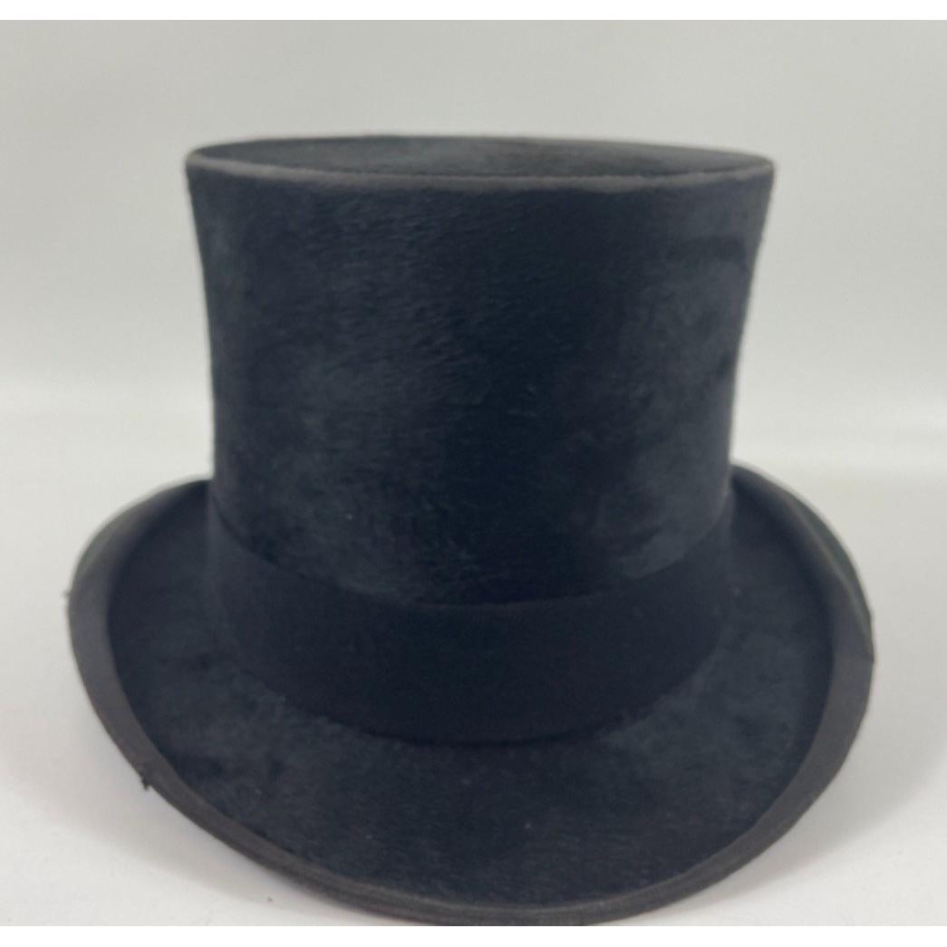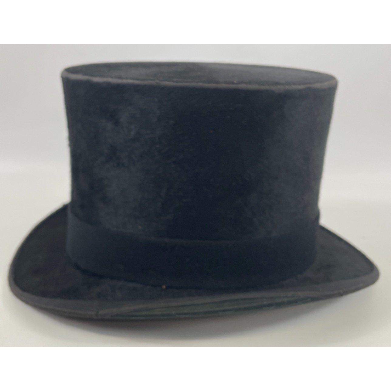 A VINTAGE TOP HAT WITH A FABULOUS VINTAGE LEATHER TOP HAT BOX (void dimensions 21cm diameter x 16cm inner depth - no maker's label present on either item.Approx 2 pieces