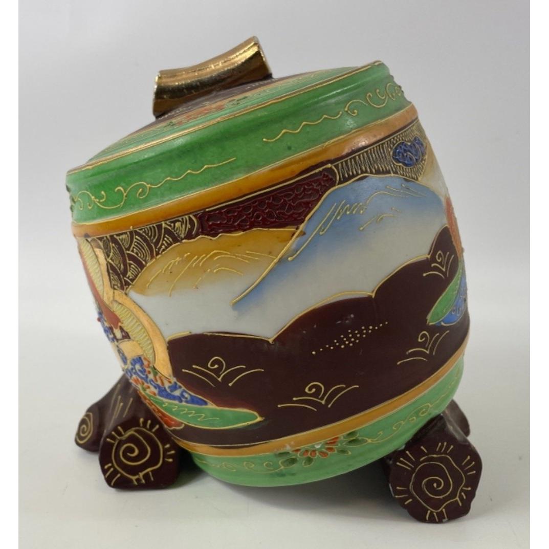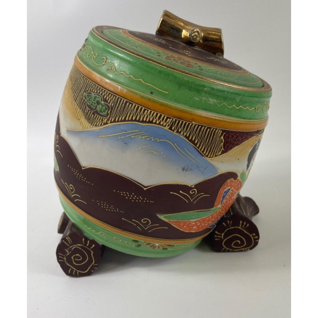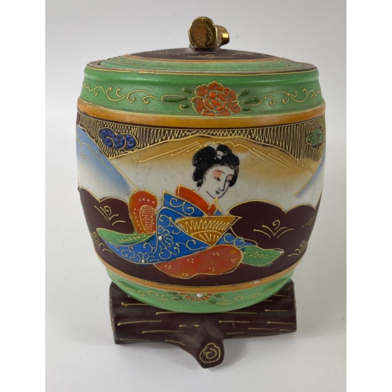A biscuit barrel with a difference - a Japanese lidded jar with a pastoral design of ladies with gilt and raised art work resting on two unequal logs making for easy access to the contents, lid has been repaired