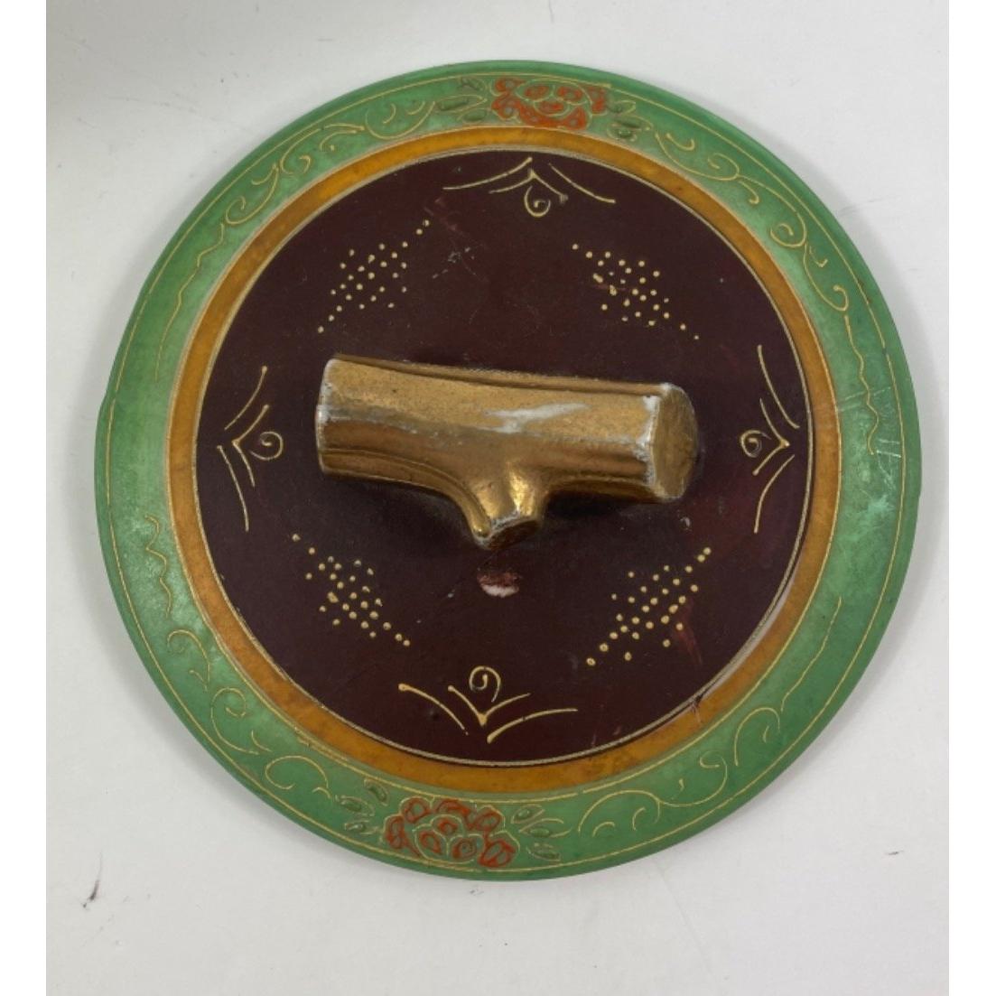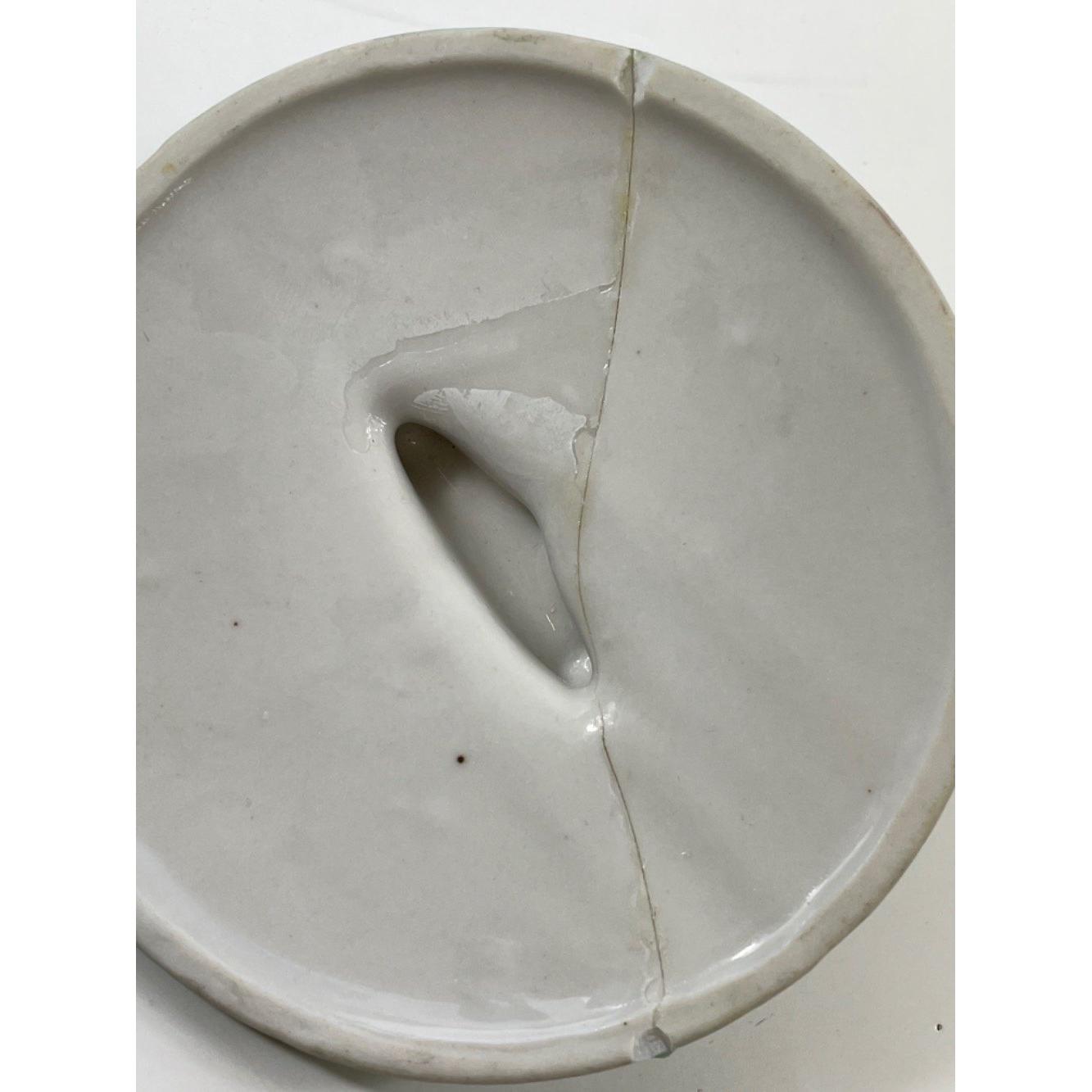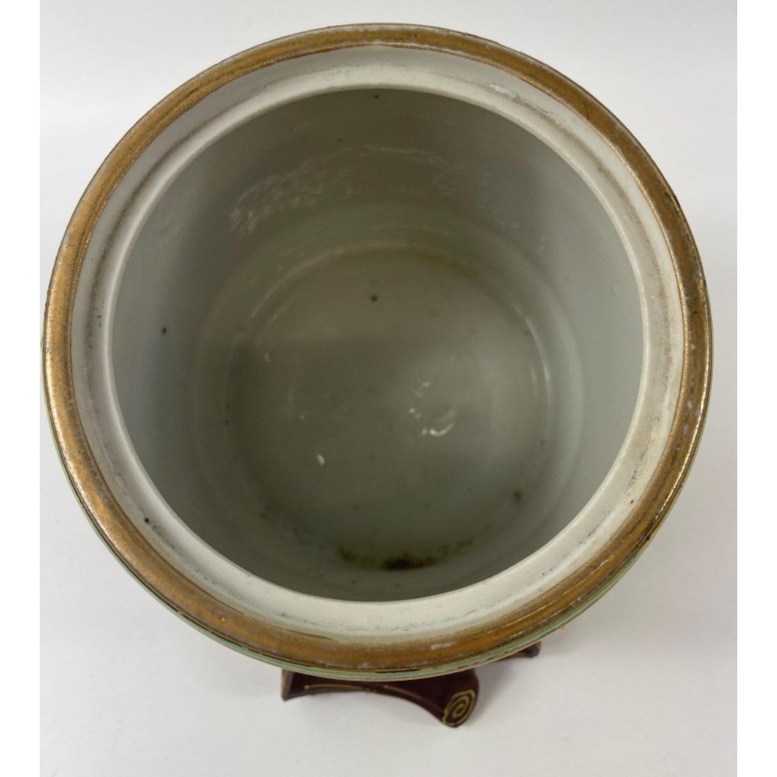 A biscuit barrel with a difference - a Japanese lidded jar with a pastoral design of ladies with gilt and raised art work resting on two unequal logs making for easy access to the contents, lid has been repaired