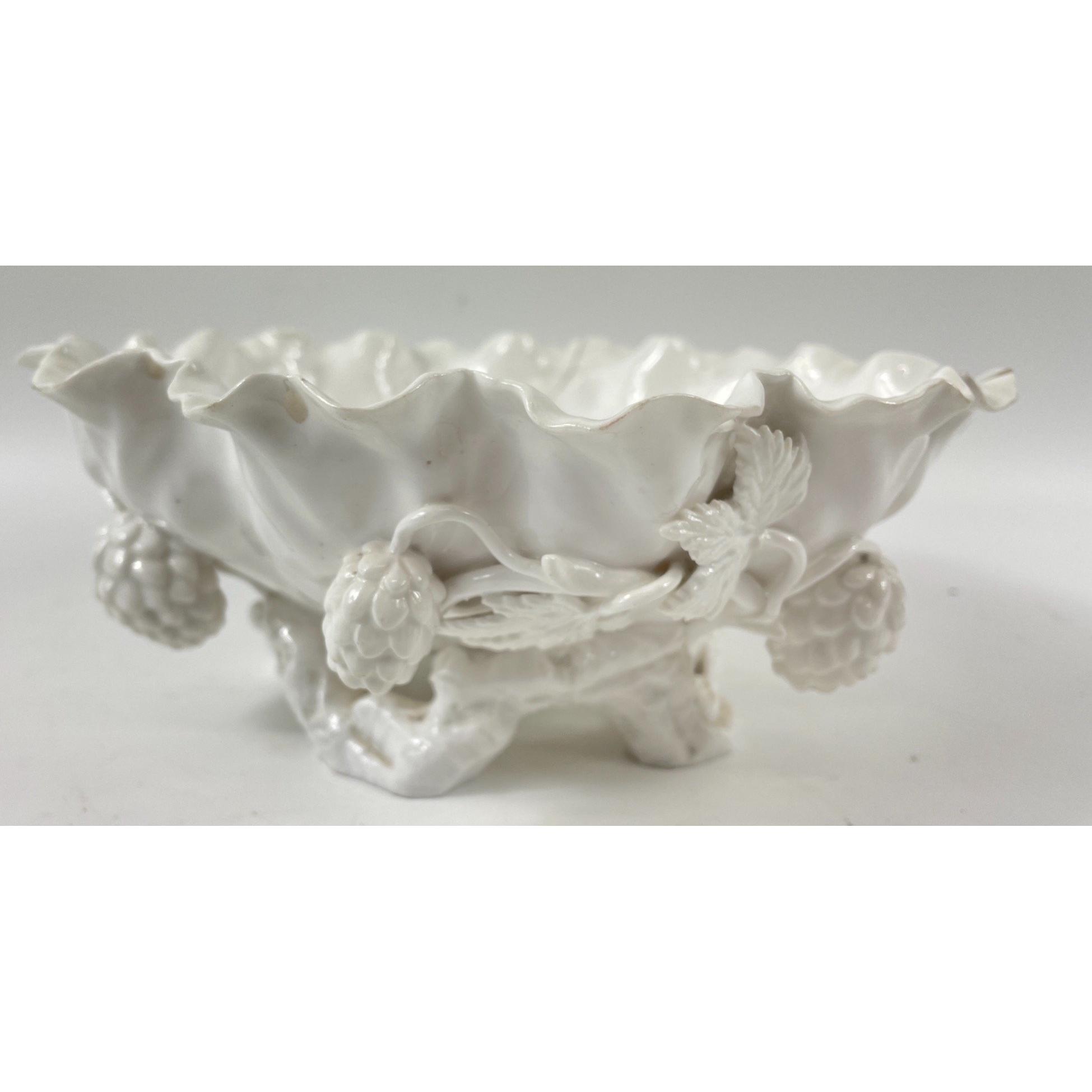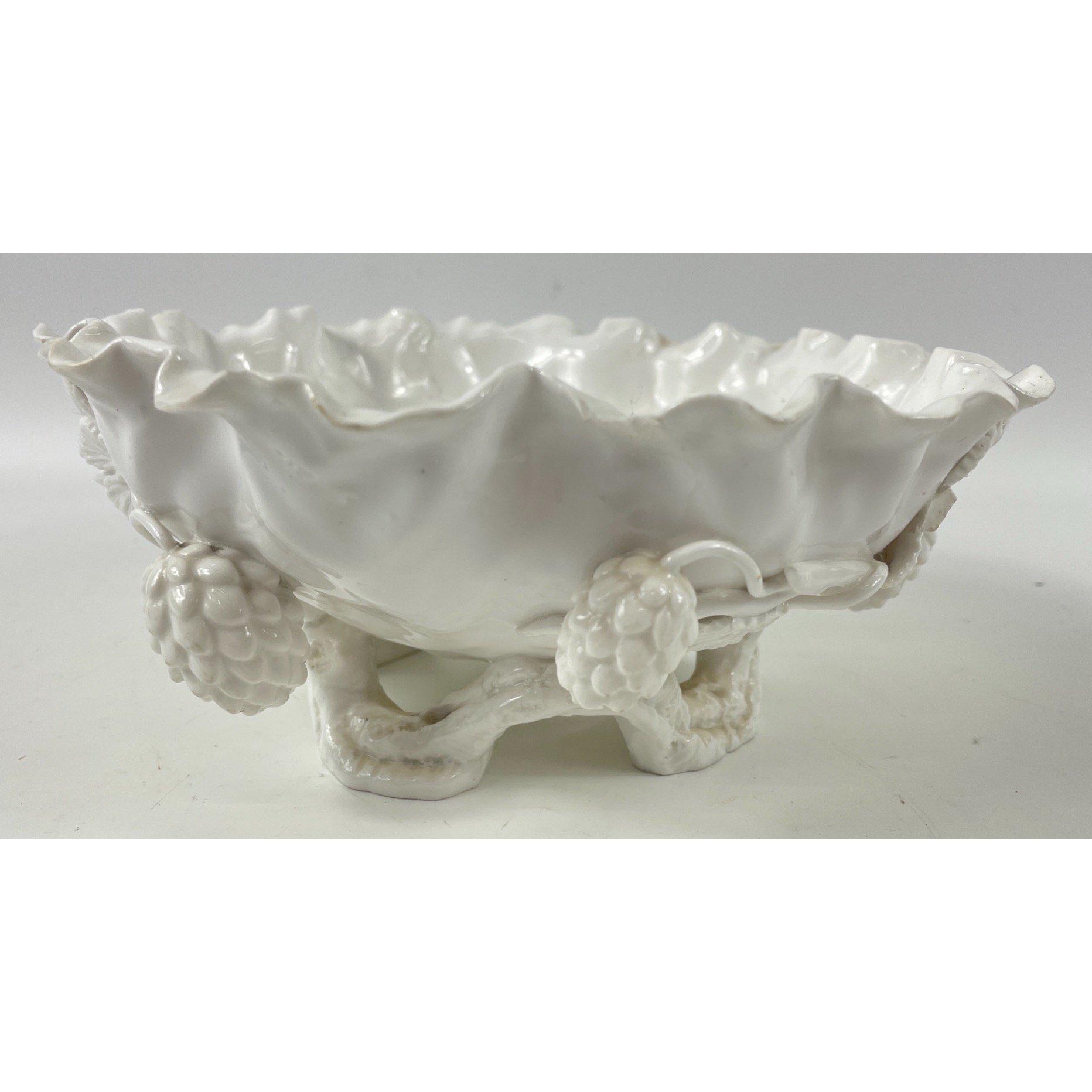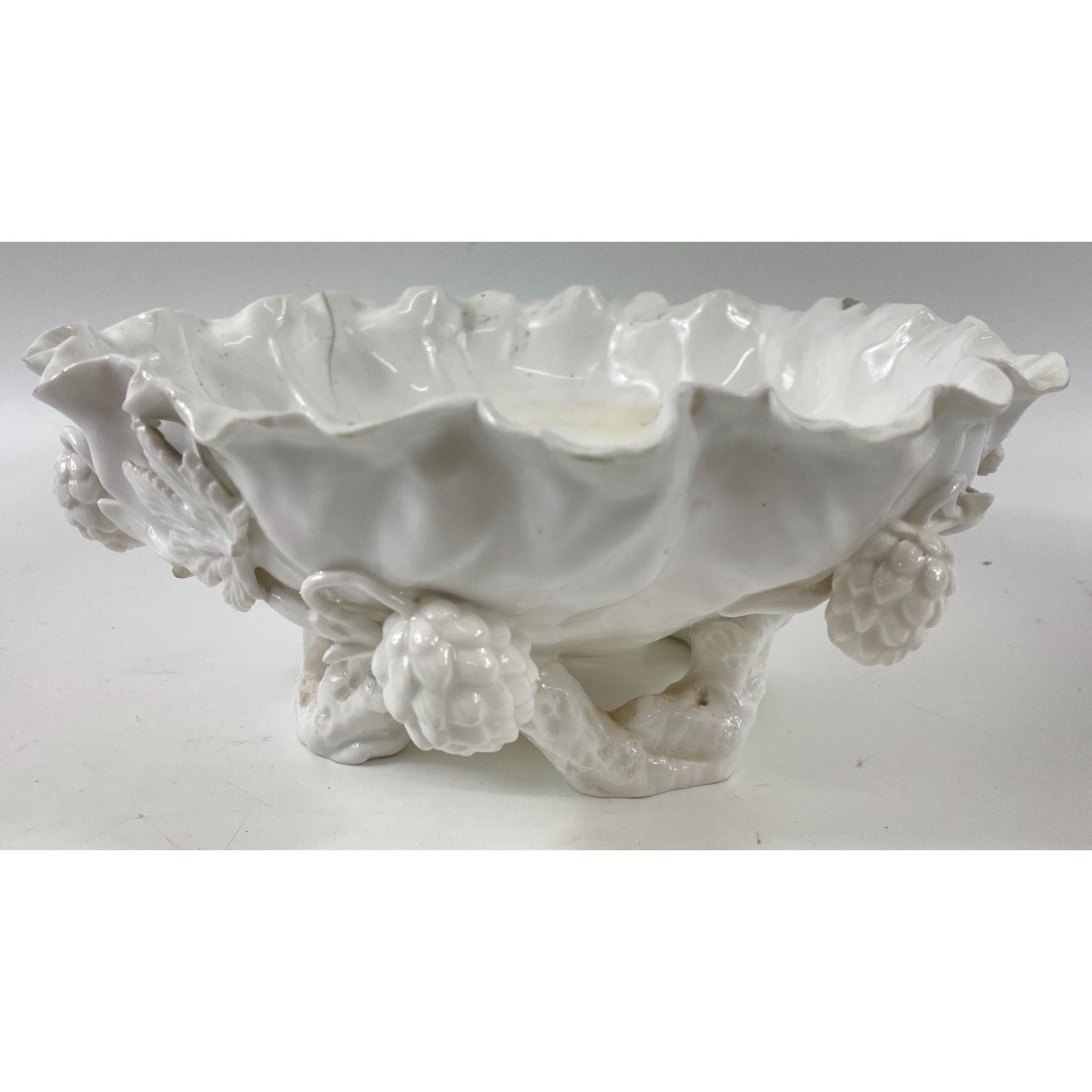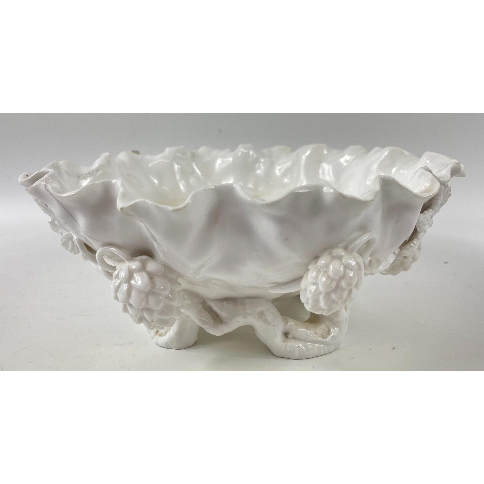 Two examples of blanc de Chine china ware including a T Goode & Co bowl on 4 feet with a design of berries and leaves (approx 20cm dia with a couple of surface cracks to the interior) and conch shell-style vase standing 22cm high