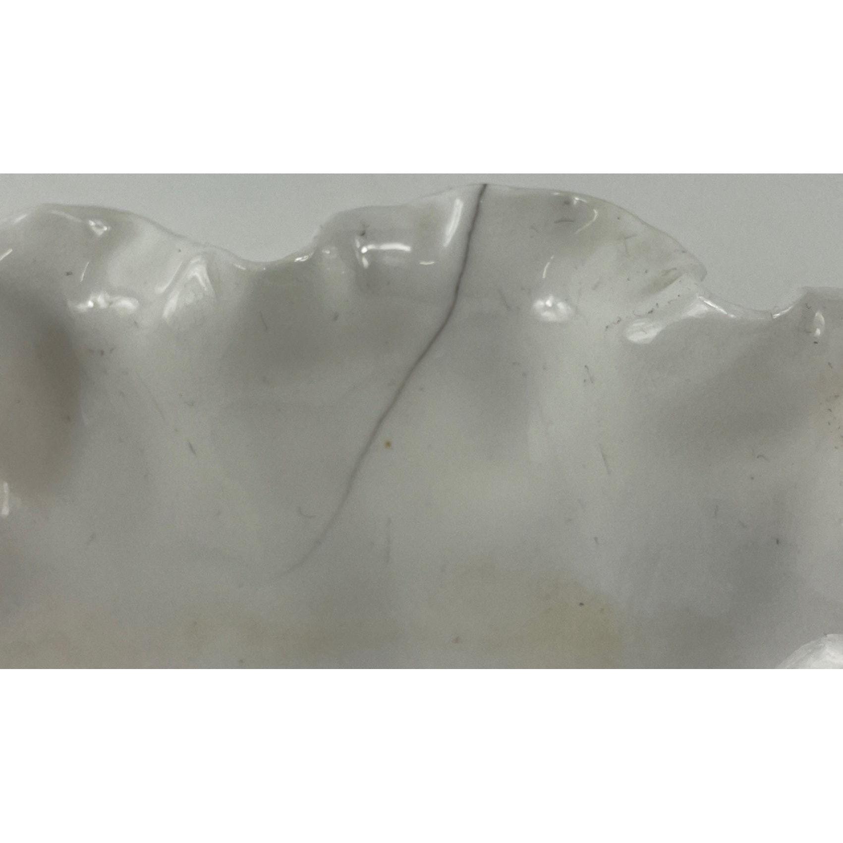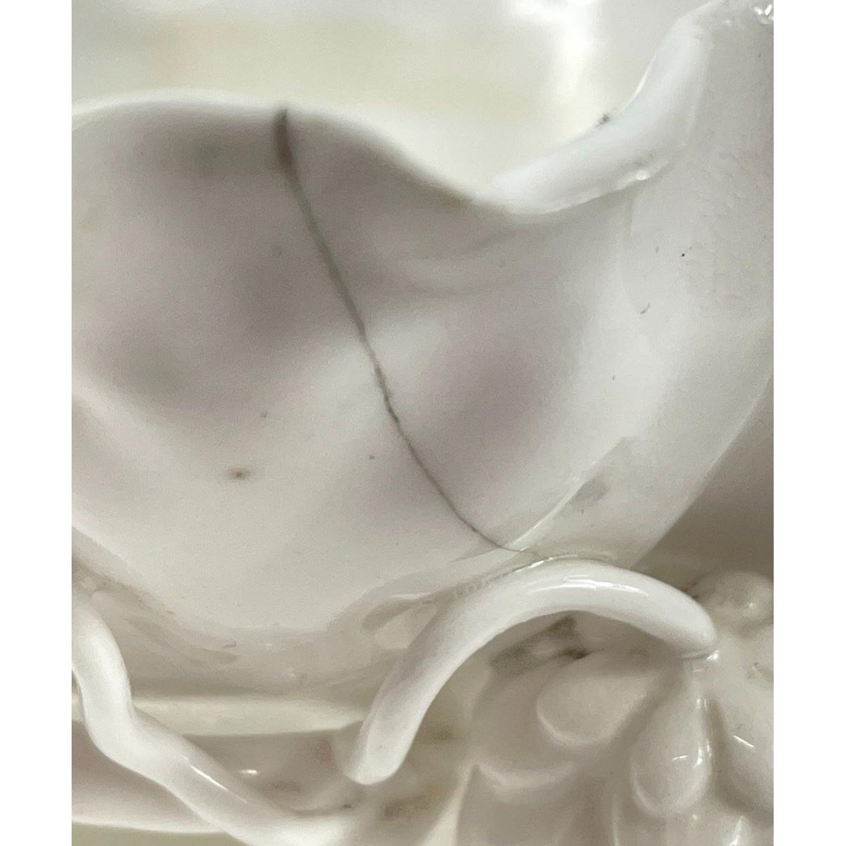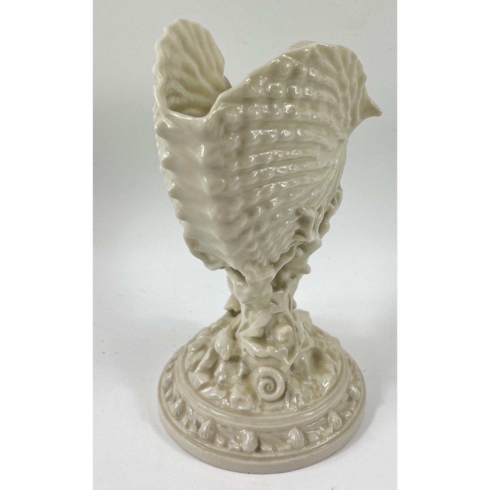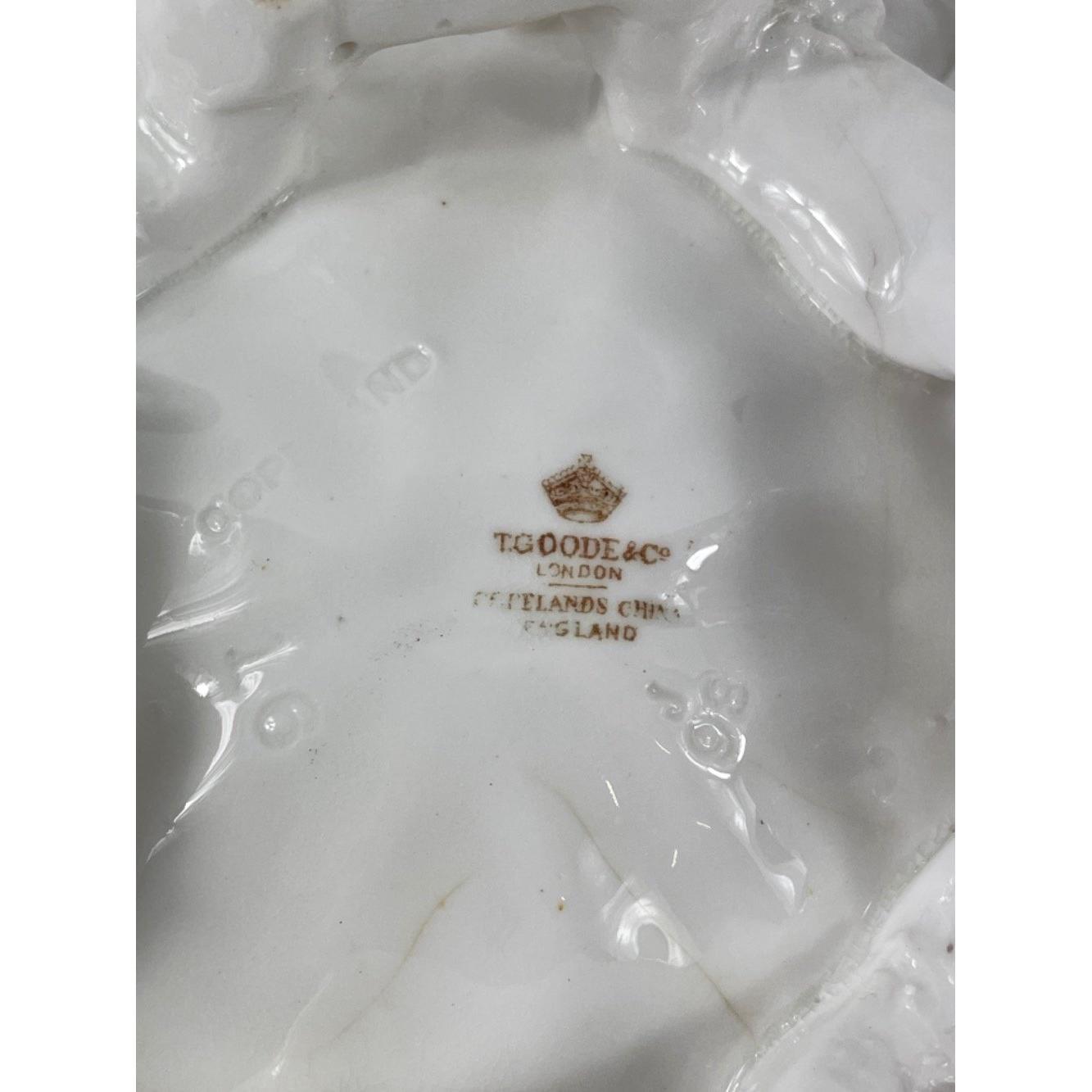 Two examples of blanc de Chine china ware including a T Goode & Co bowl on 4 feet with a design of berries and leaves (approx 20cm dia with a couple of surface cracks to the interior) and conch shell-style vase standing 22cm high