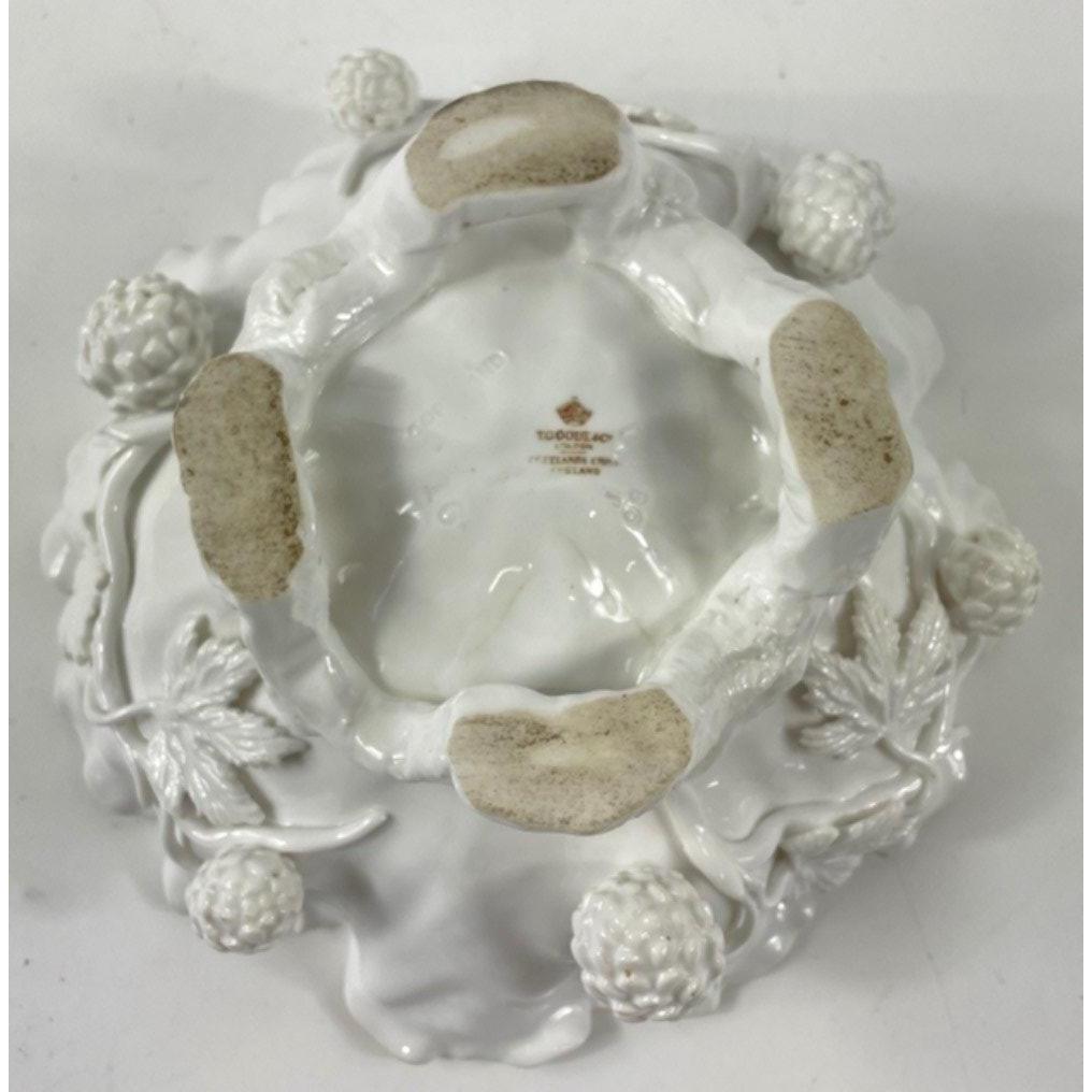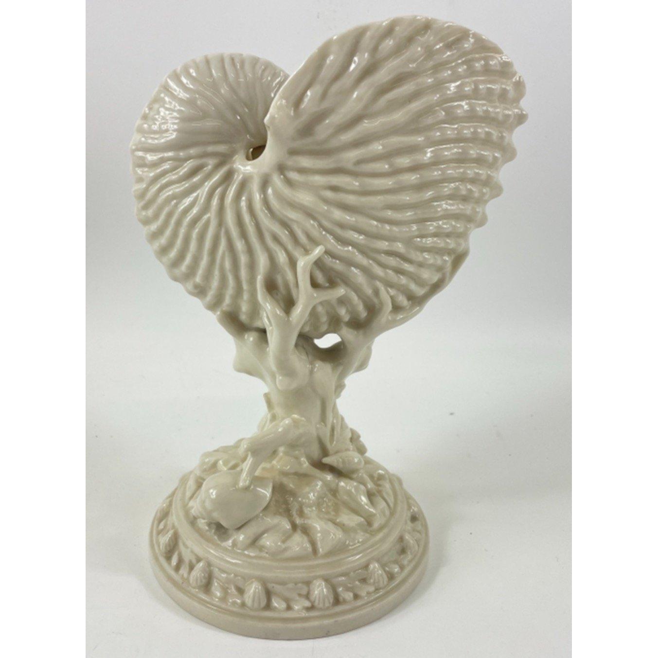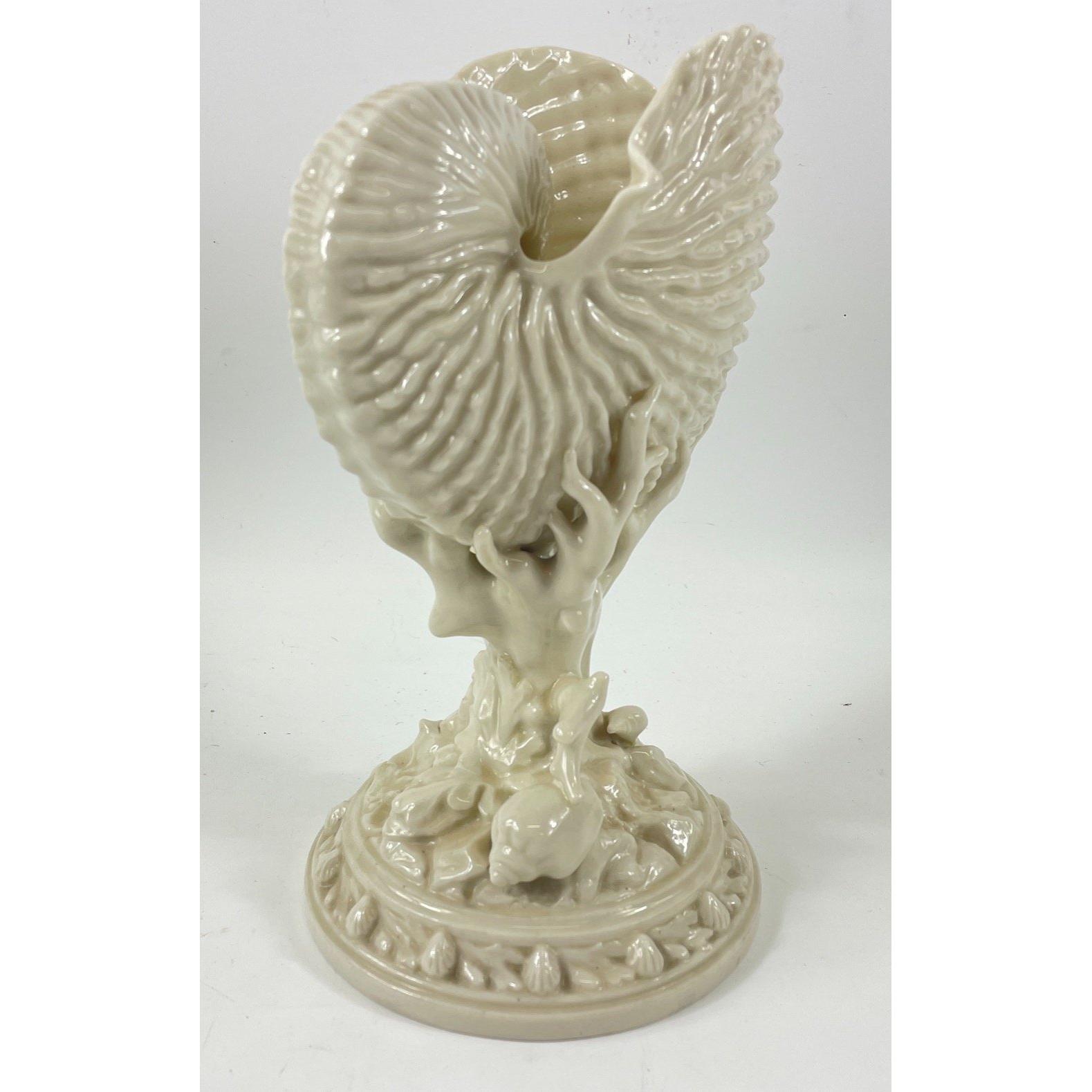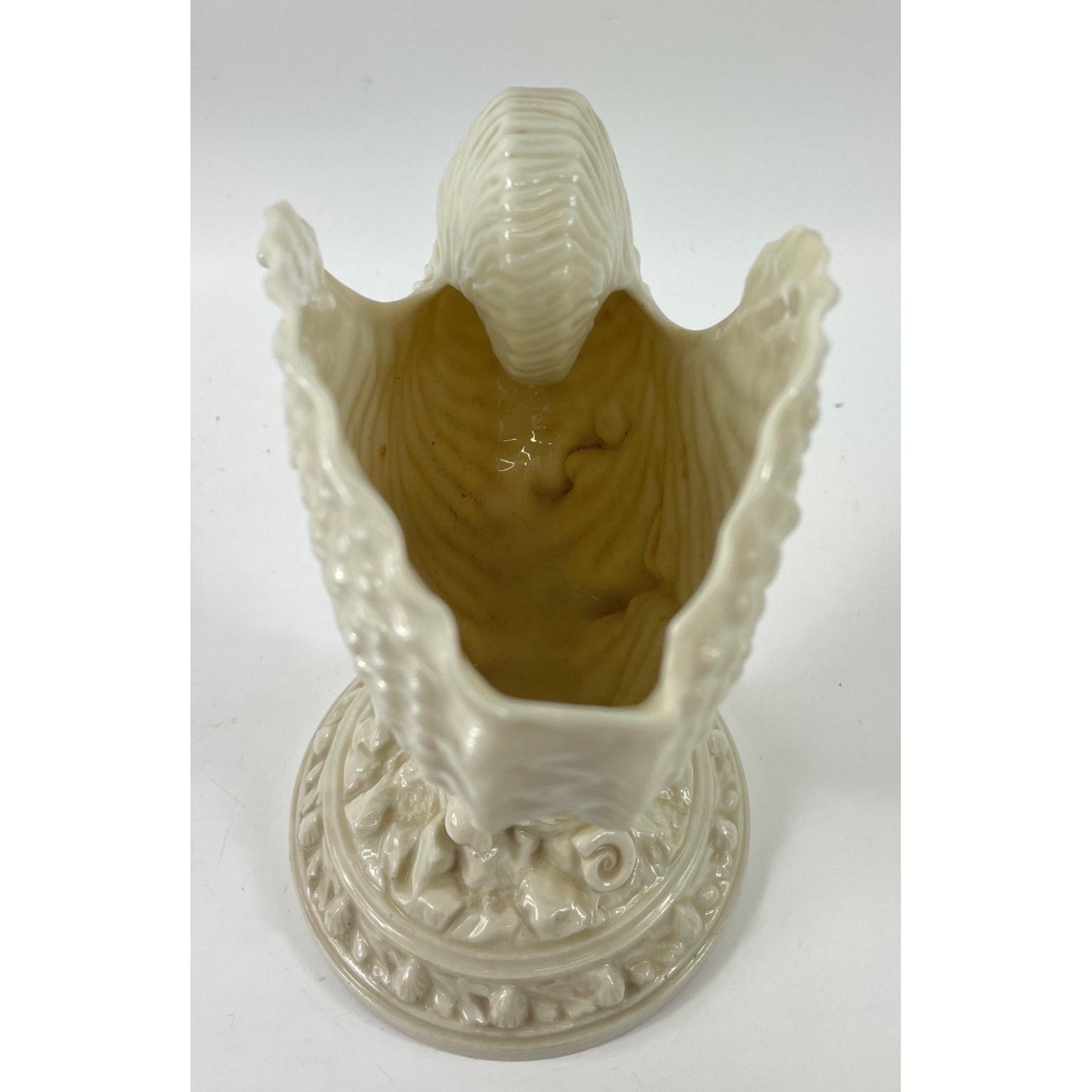 Two examples of blanc de Chine china ware including a T Goode & Co bowl on 4 feet with a design of berries and leaves (approx 20cm dia with a couple of surface cracks to the interior) and conch shell-style vase standing 22cm high