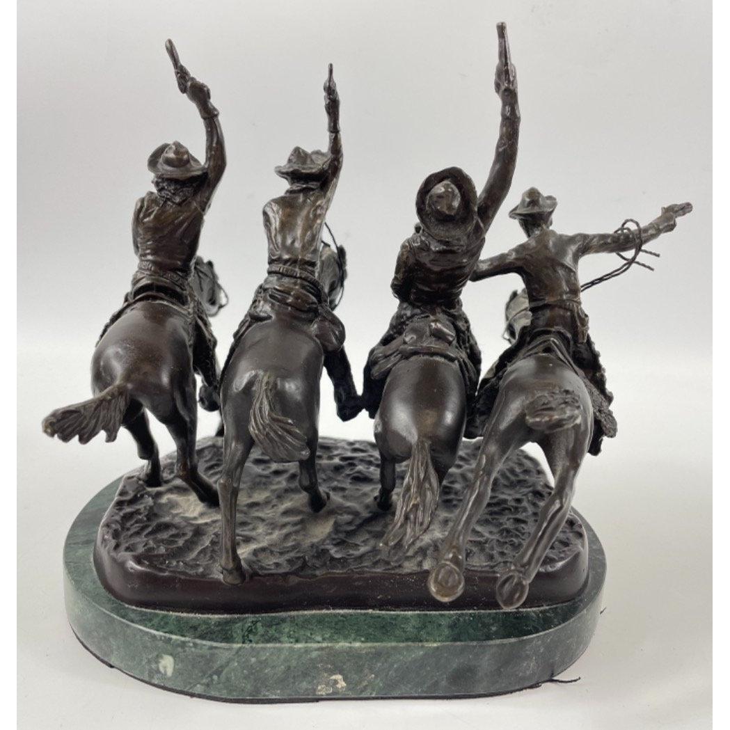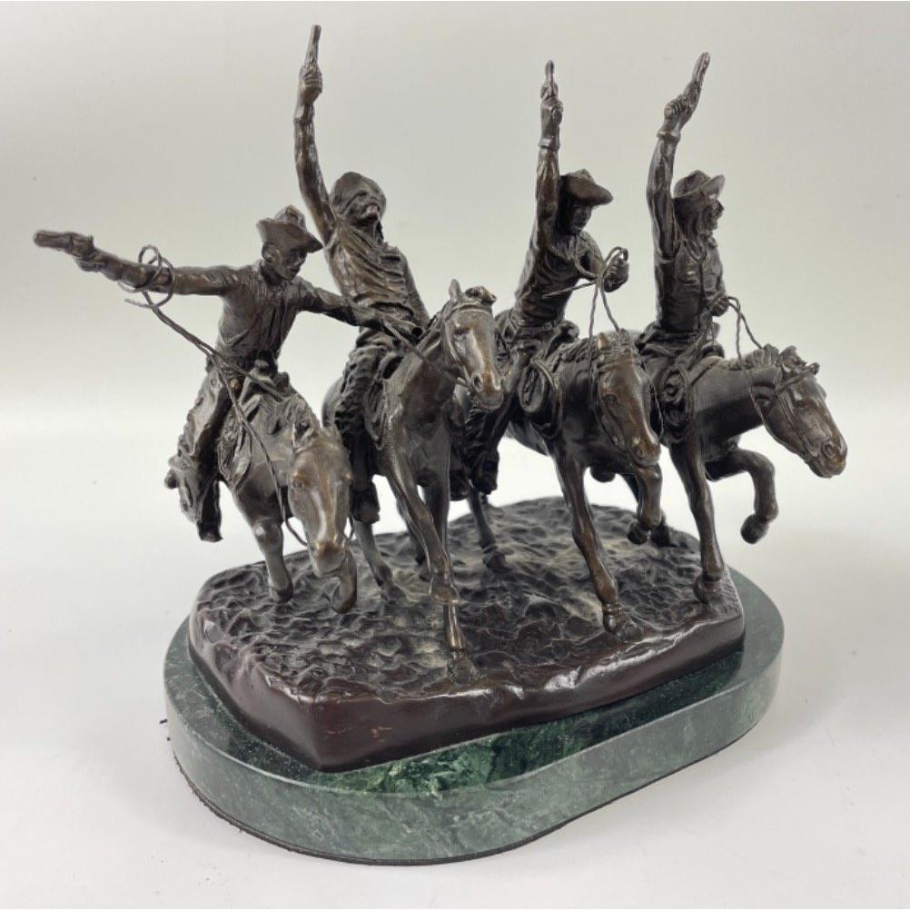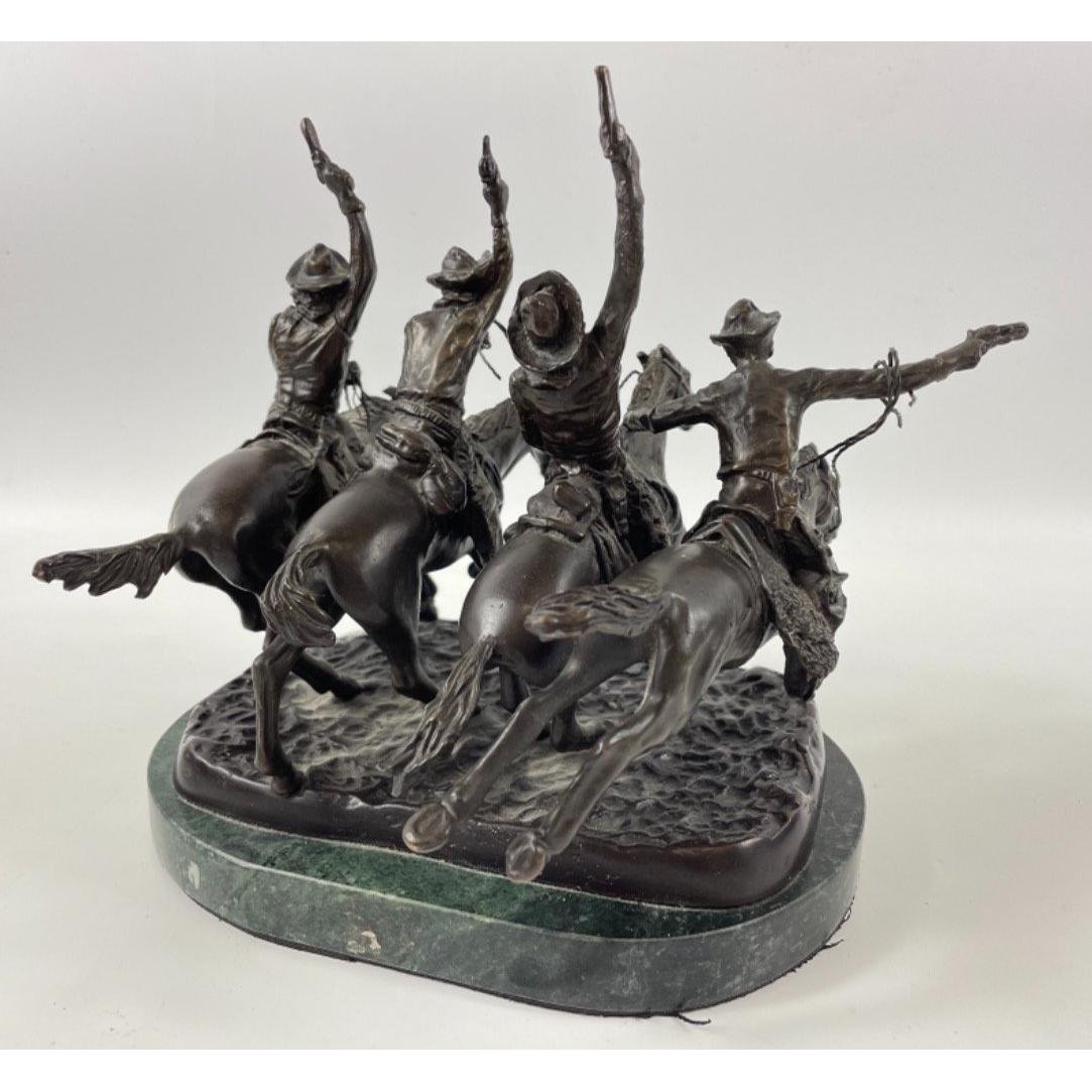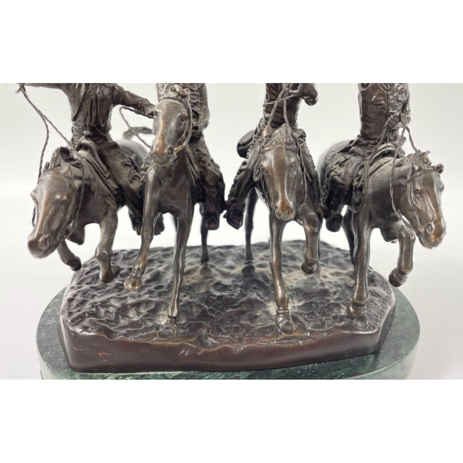 SUPER COLLECTABLE Coming through the Rye - A group of four bronze mounted cowboys on a marble plinth stamped 'copyright by Frederic Remington', standing approx 20cmApprox 1 pieces