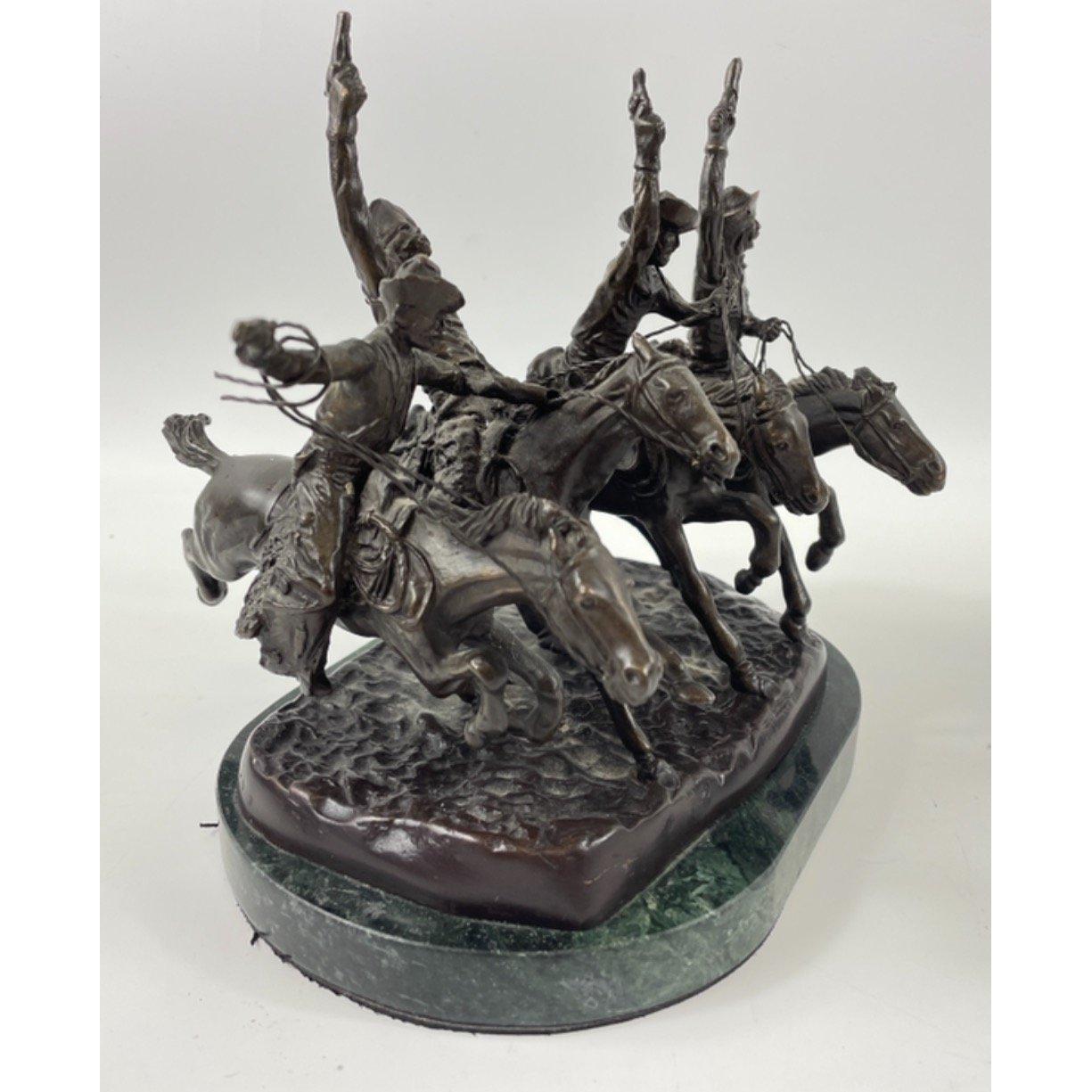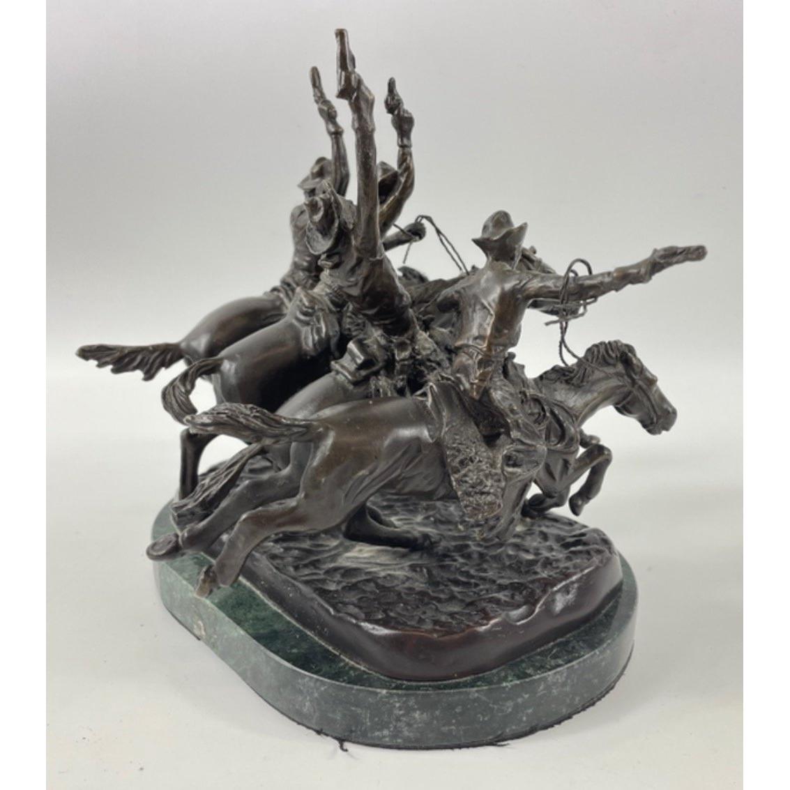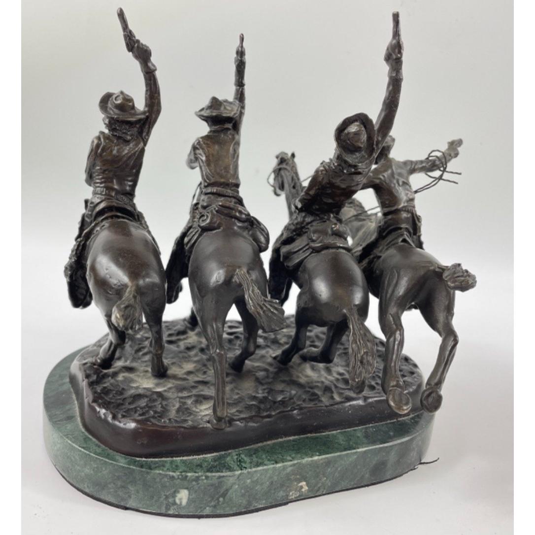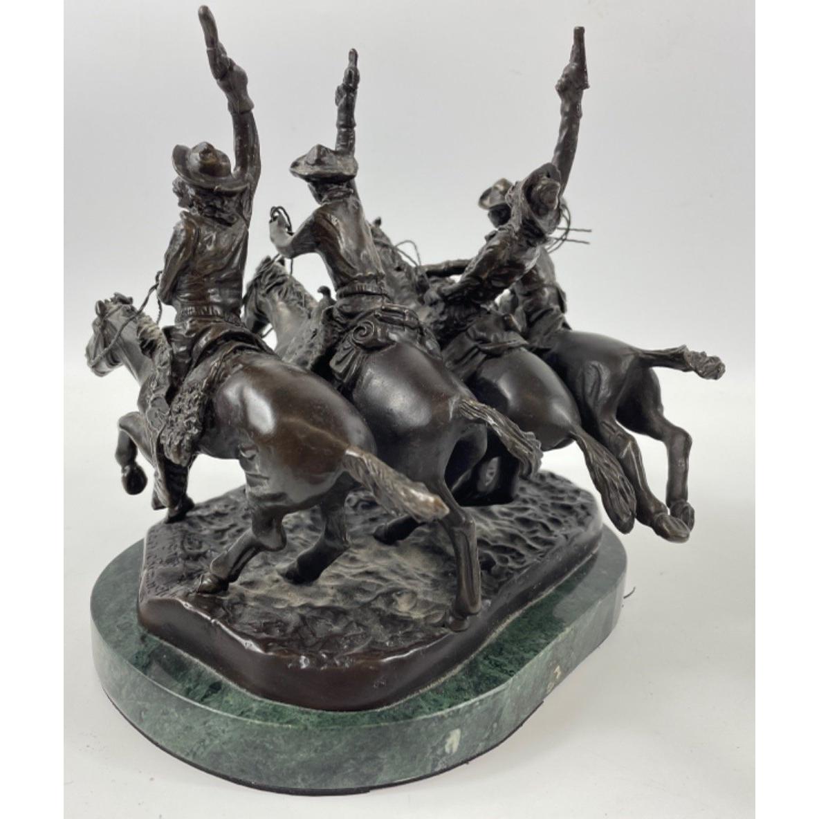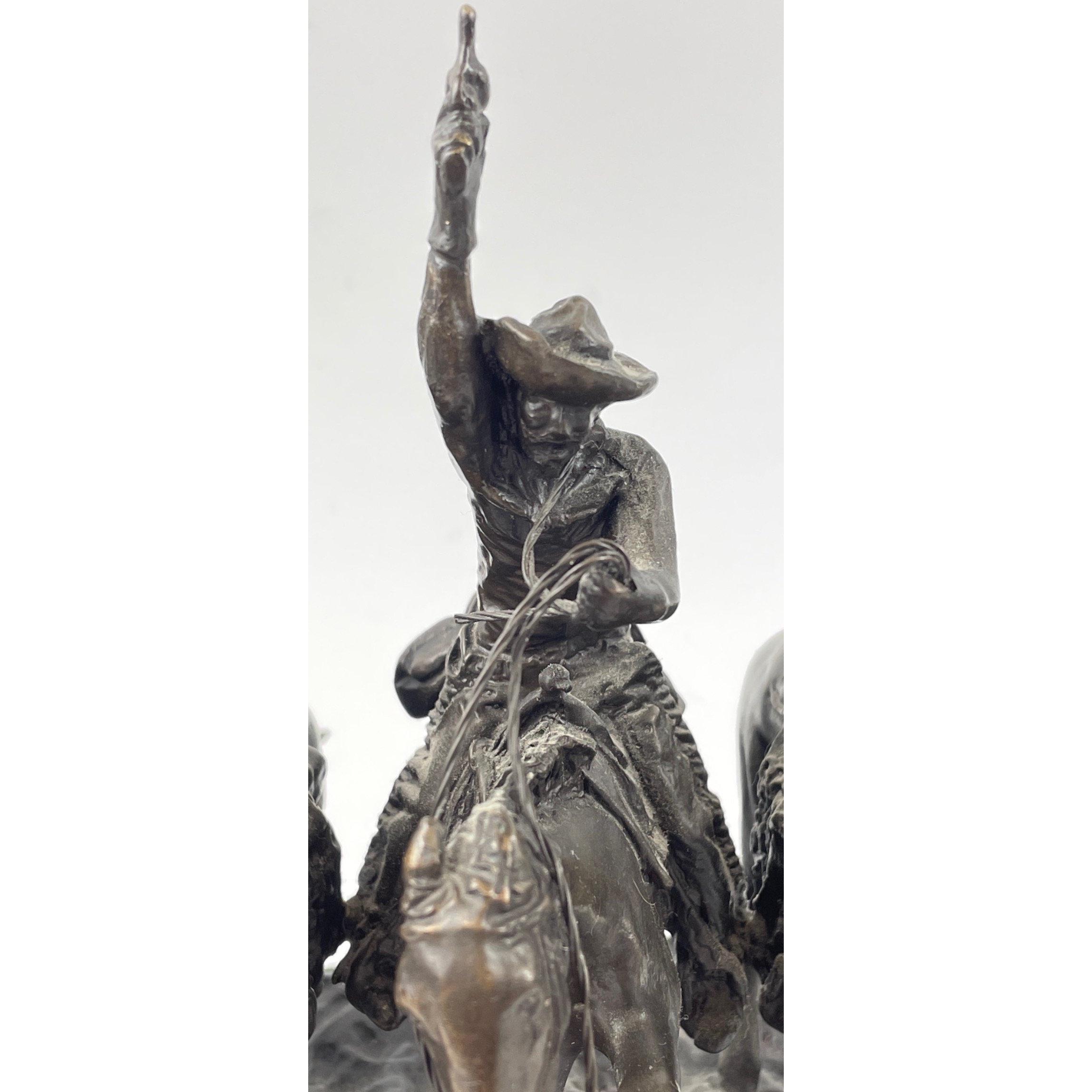 SUPER COLLECTABLE Coming through the Rye - A group of four bronze mounted cowboys on a marble plinth stamped 'copyright by Frederic Remington', standing approx 20cmApprox 1 pieces