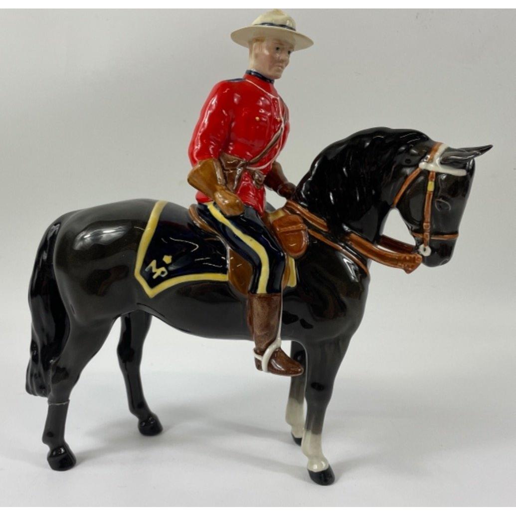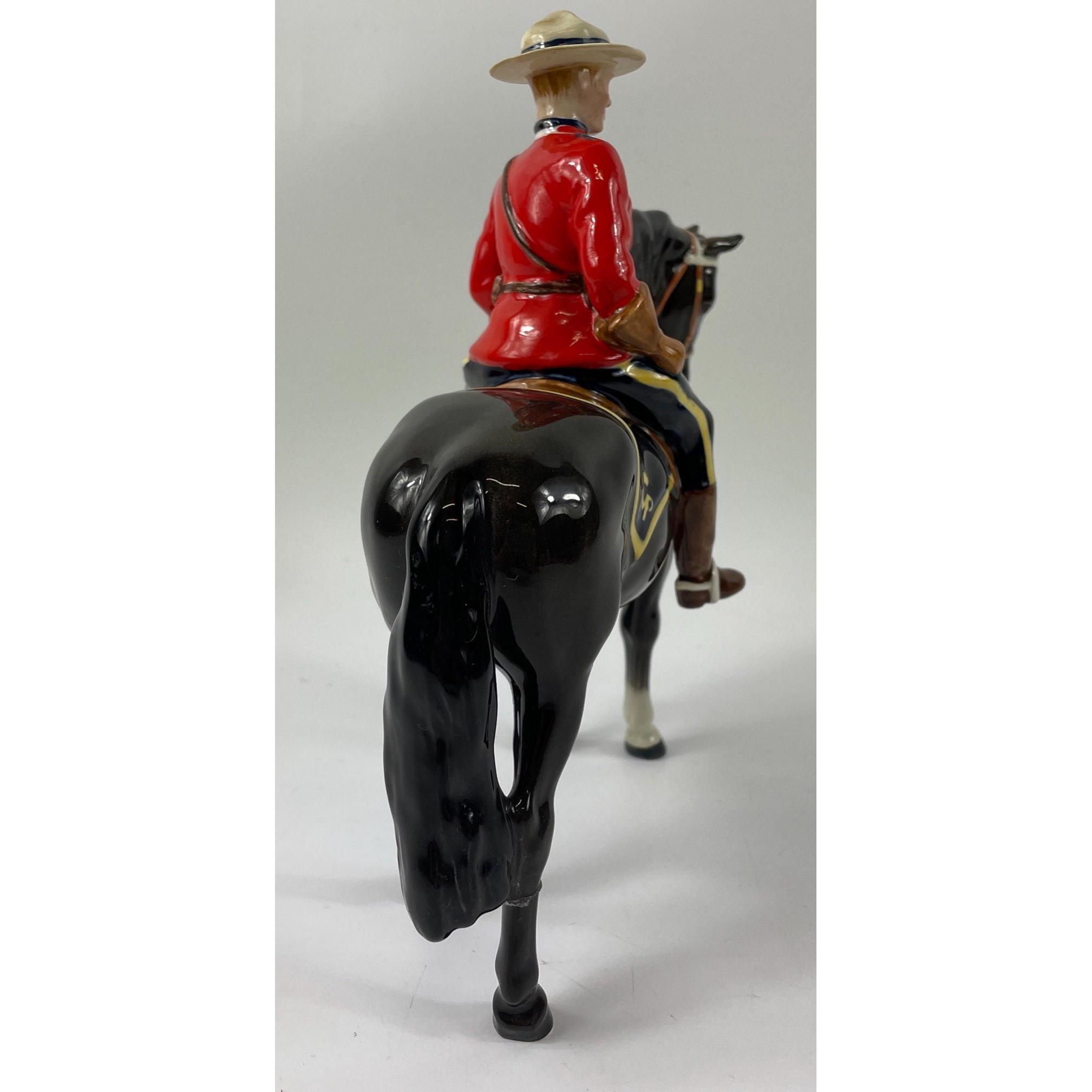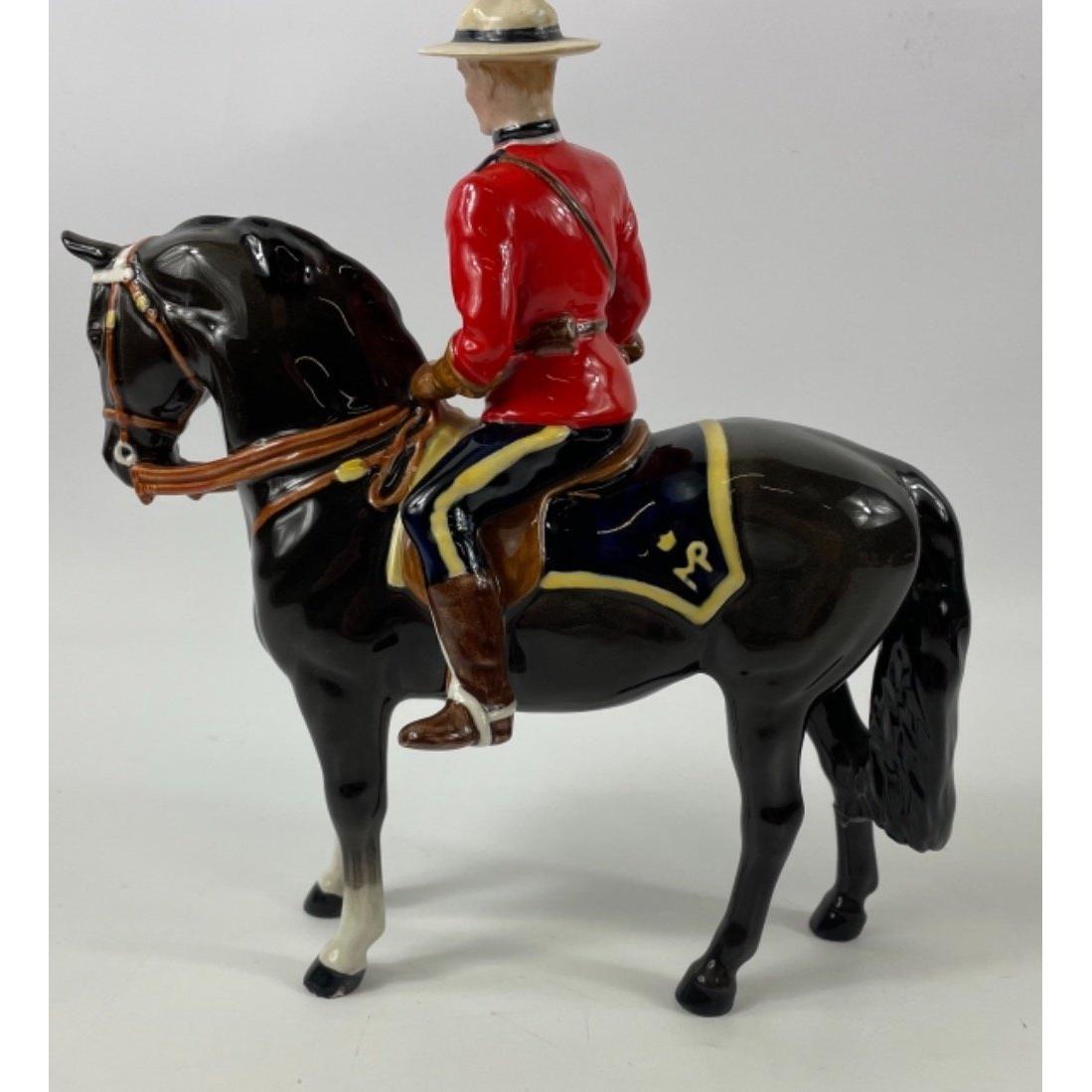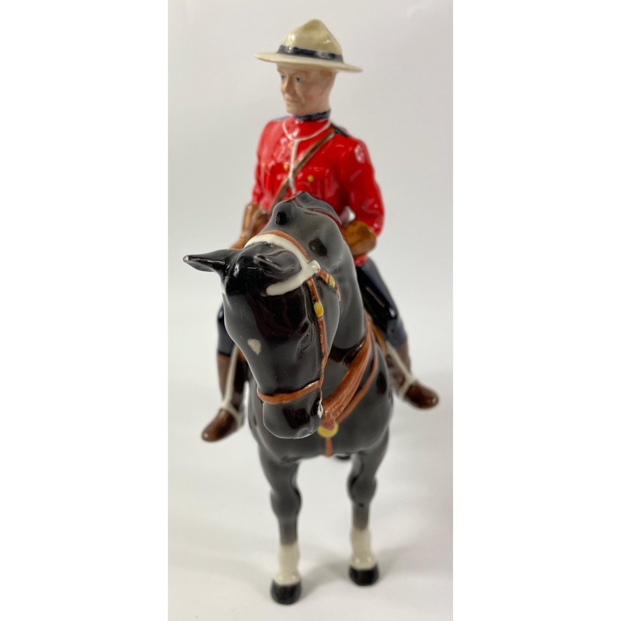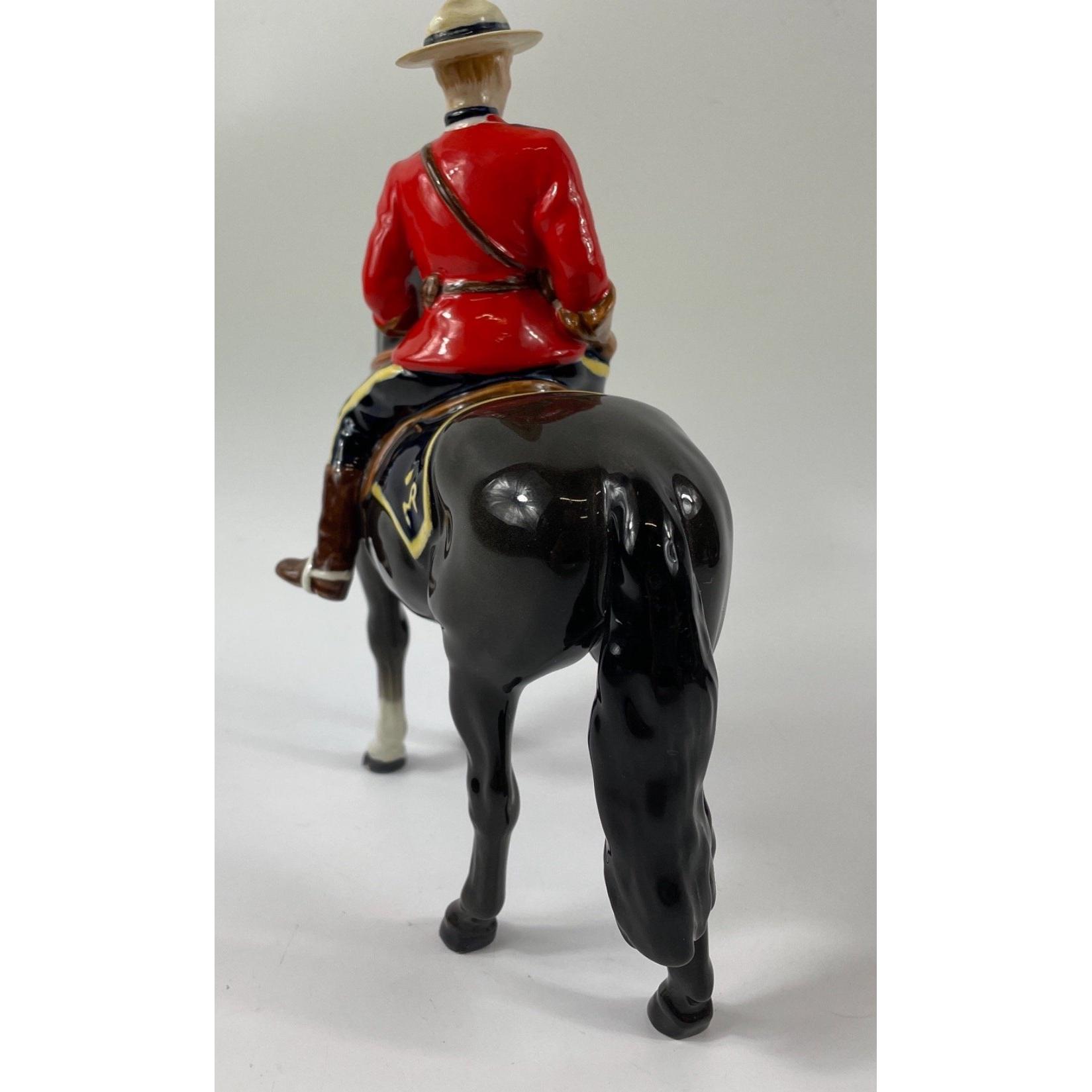 Two equine figures to include a ROYAL DOULTON 23cm high horse on a wooden plinth and a MOUNTIE on a black horse standing 22cm high, no maker's mark (damage repaired to rear horse's leg),