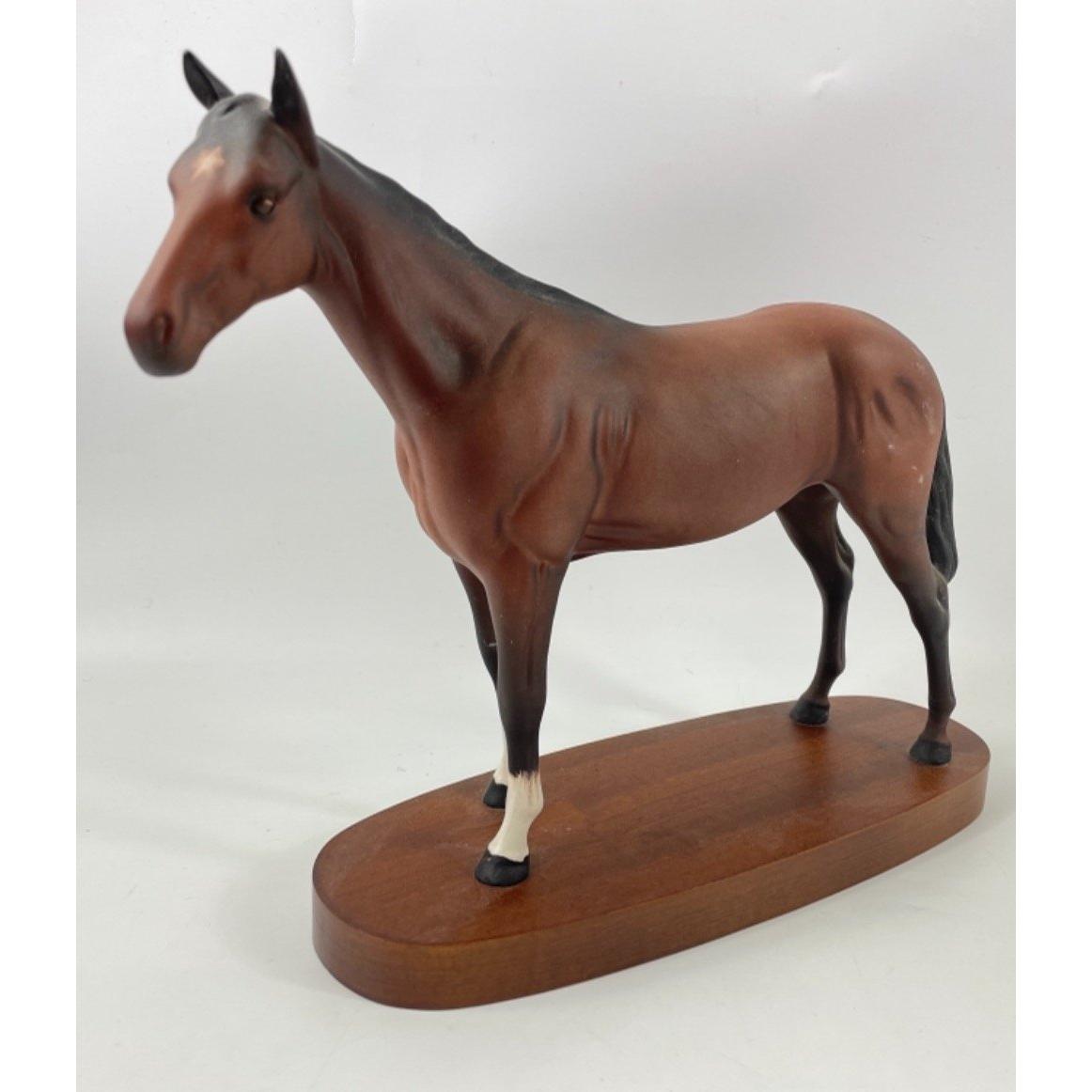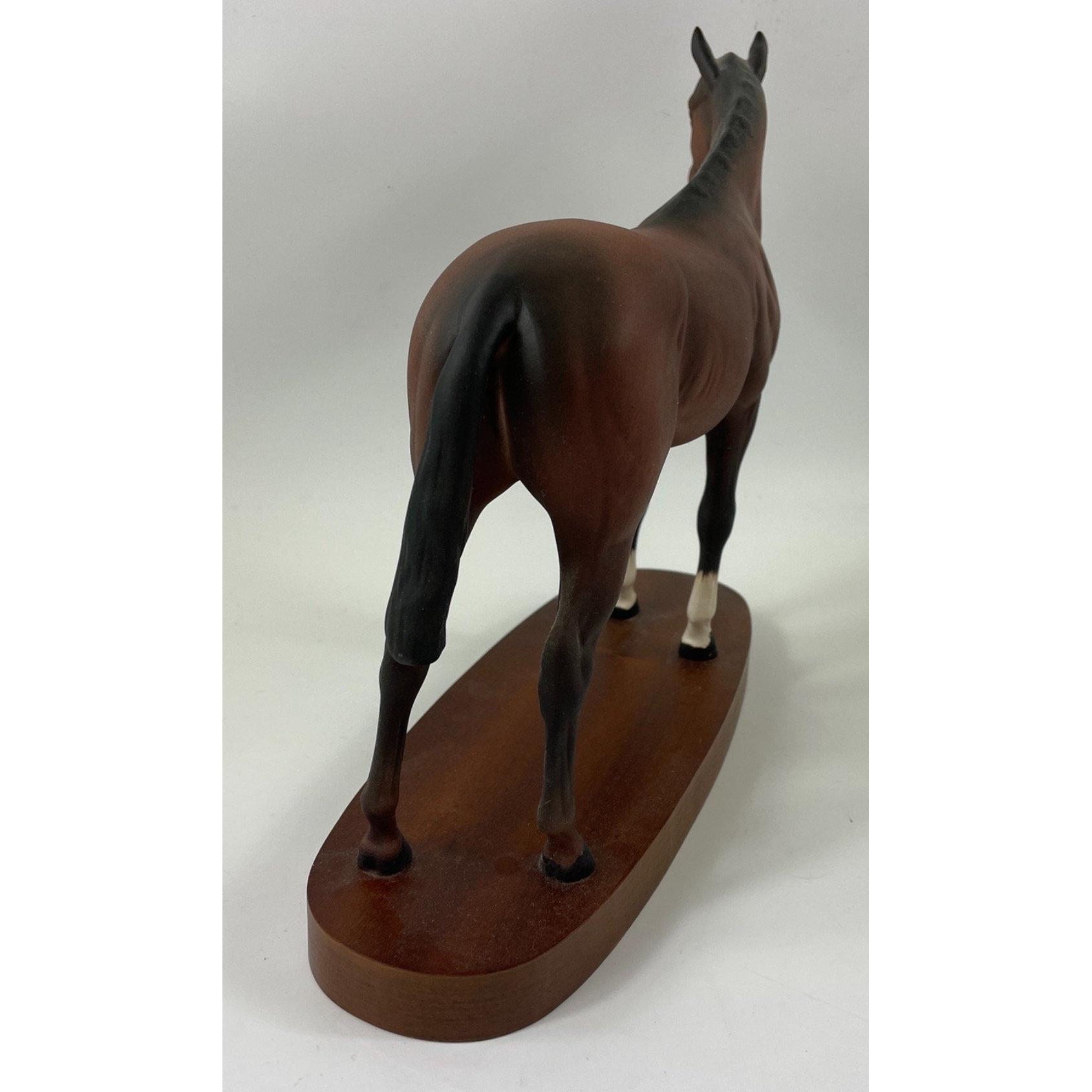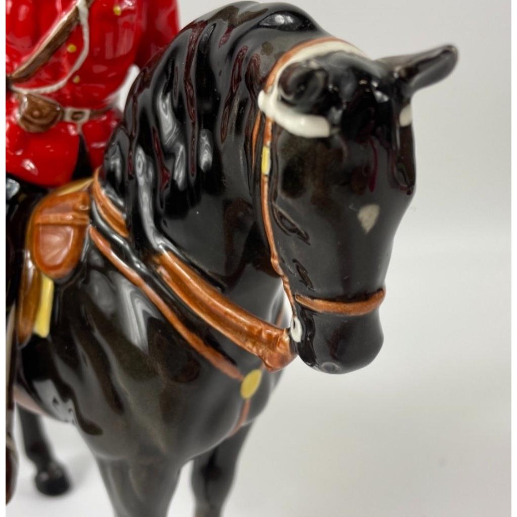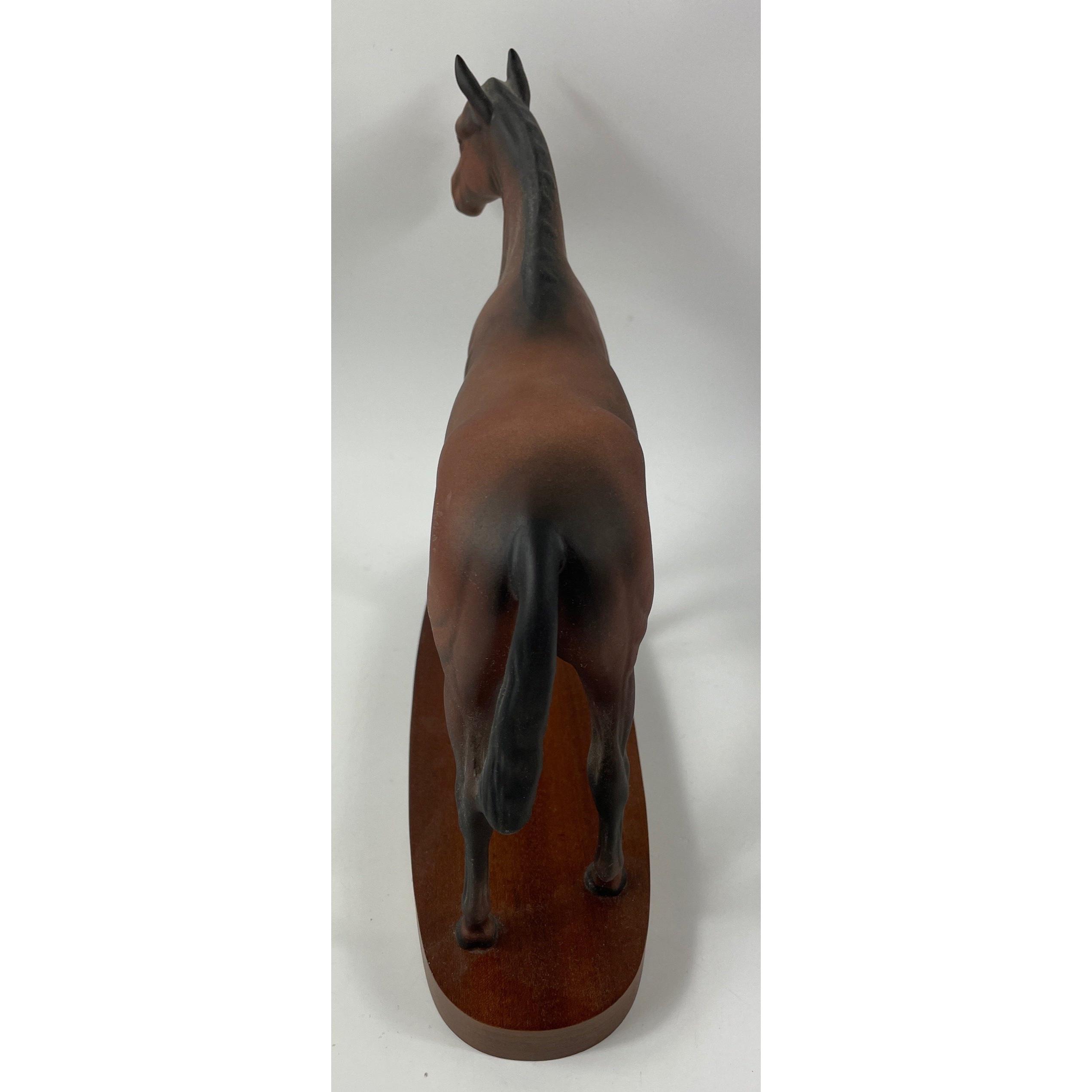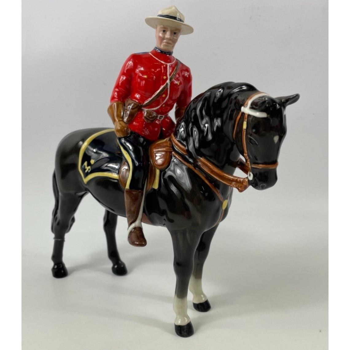 Two equine figures to include a ROYAL DOULTON 23cm high horse on a wooden plinth and a MOUNTIE on a black horse standing 22cm high, no maker's mark (damage repaired to rear horse's leg),
