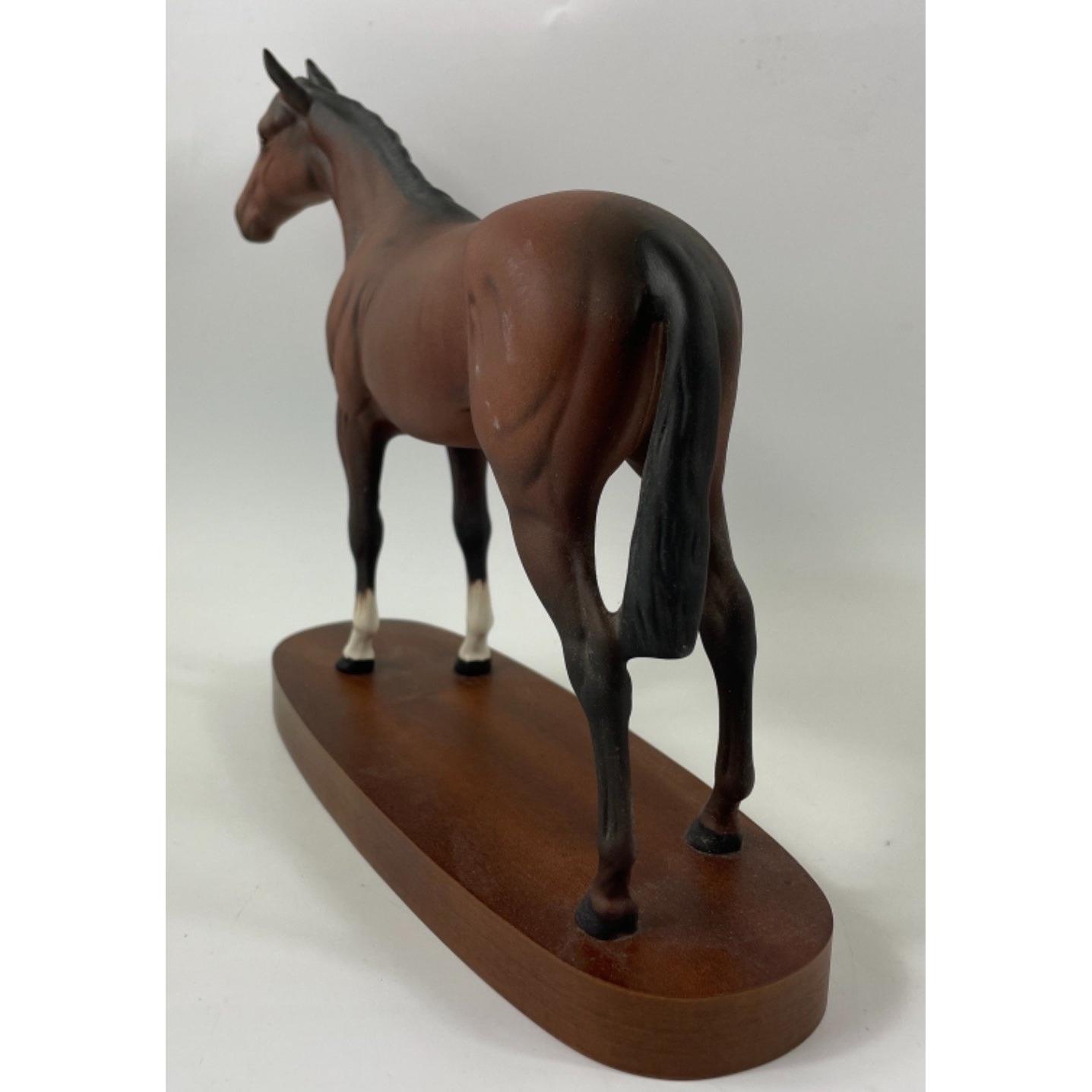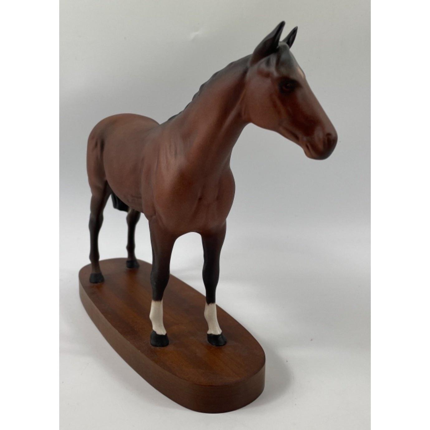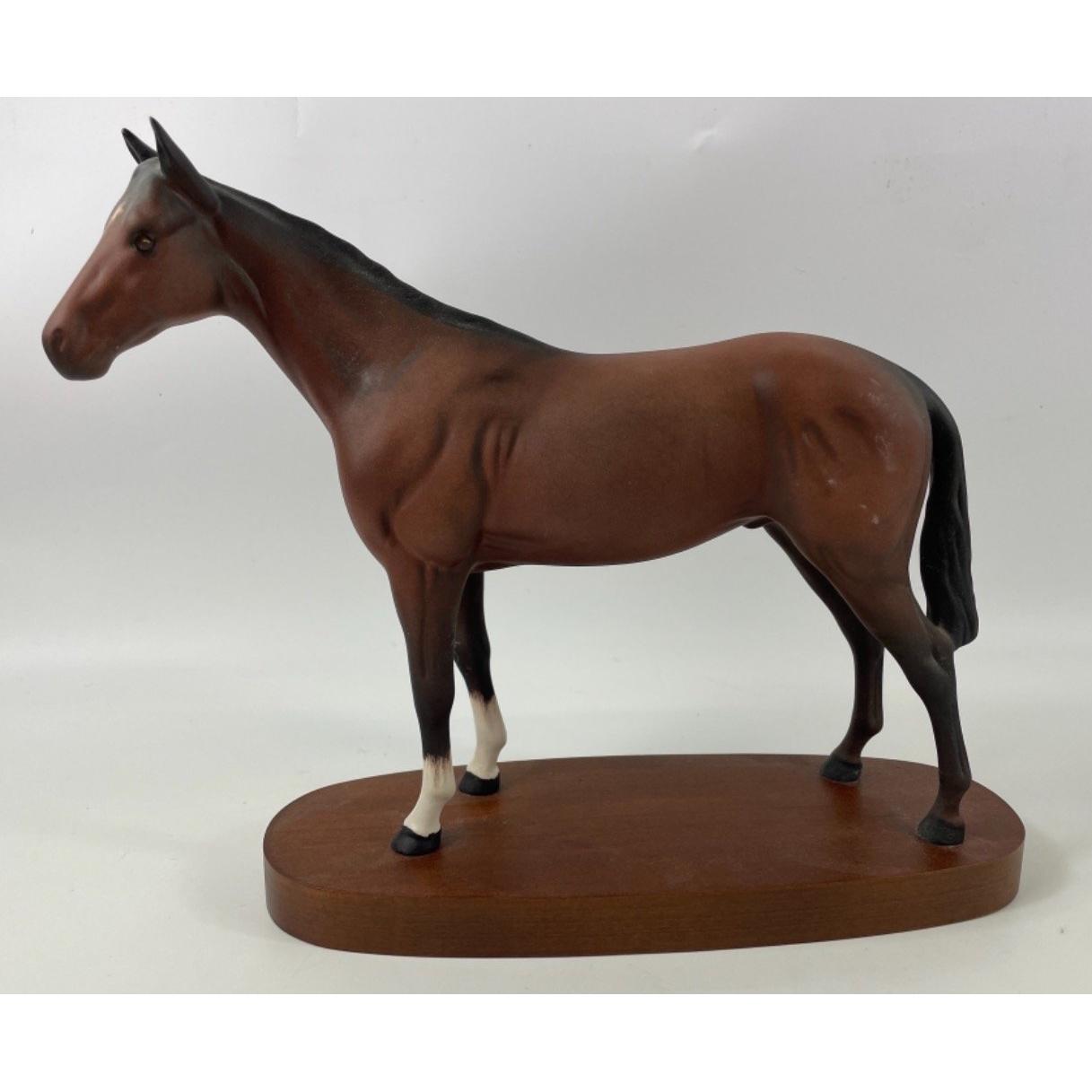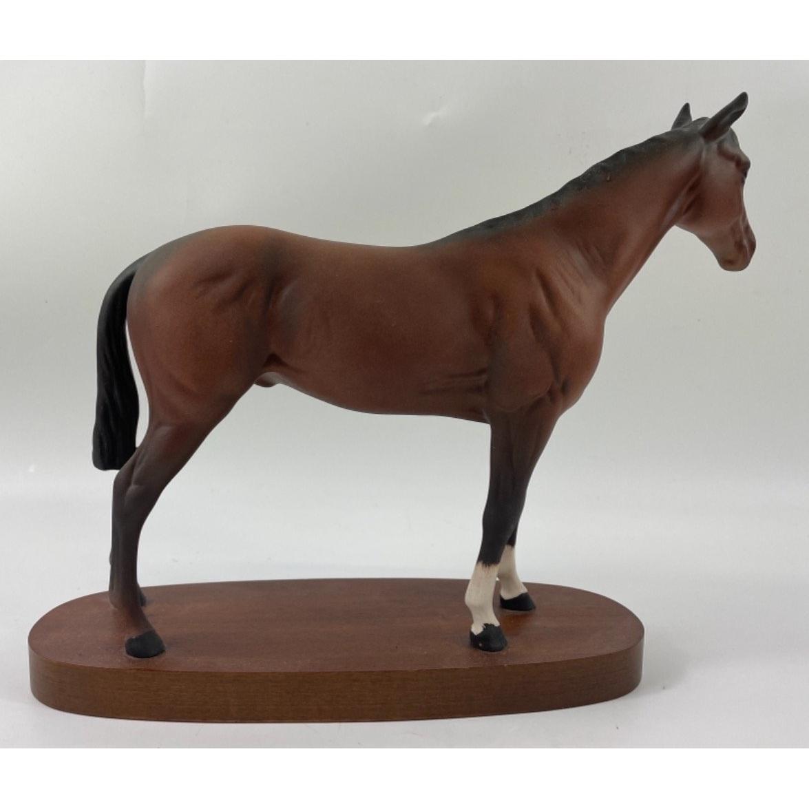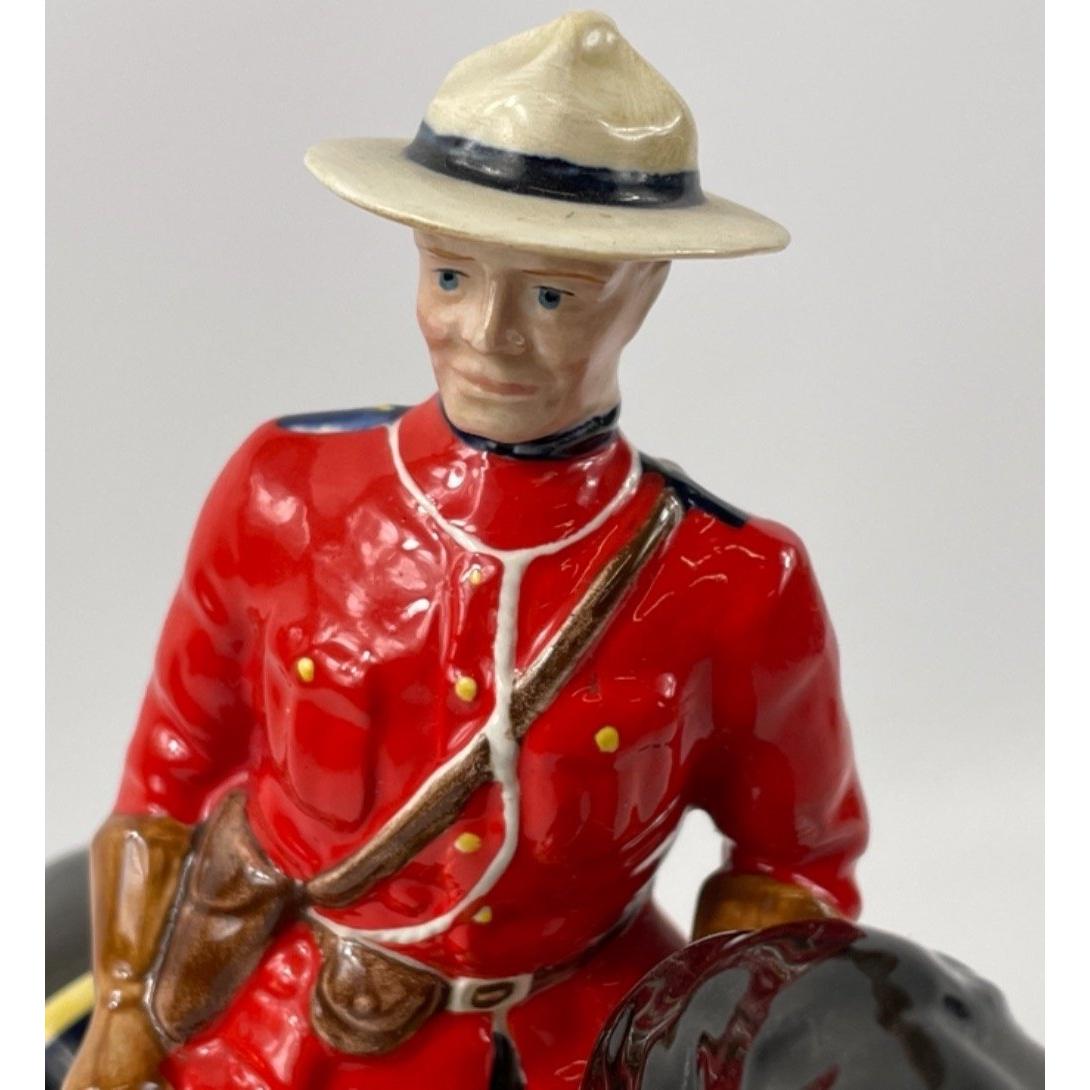 Two equine figures to include a ROYAL DOULTON 23cm high horse on a wooden plinth and a MOUNTIE on a black horse standing 22cm high, no maker's mark (damage repaired to rear horse's leg),