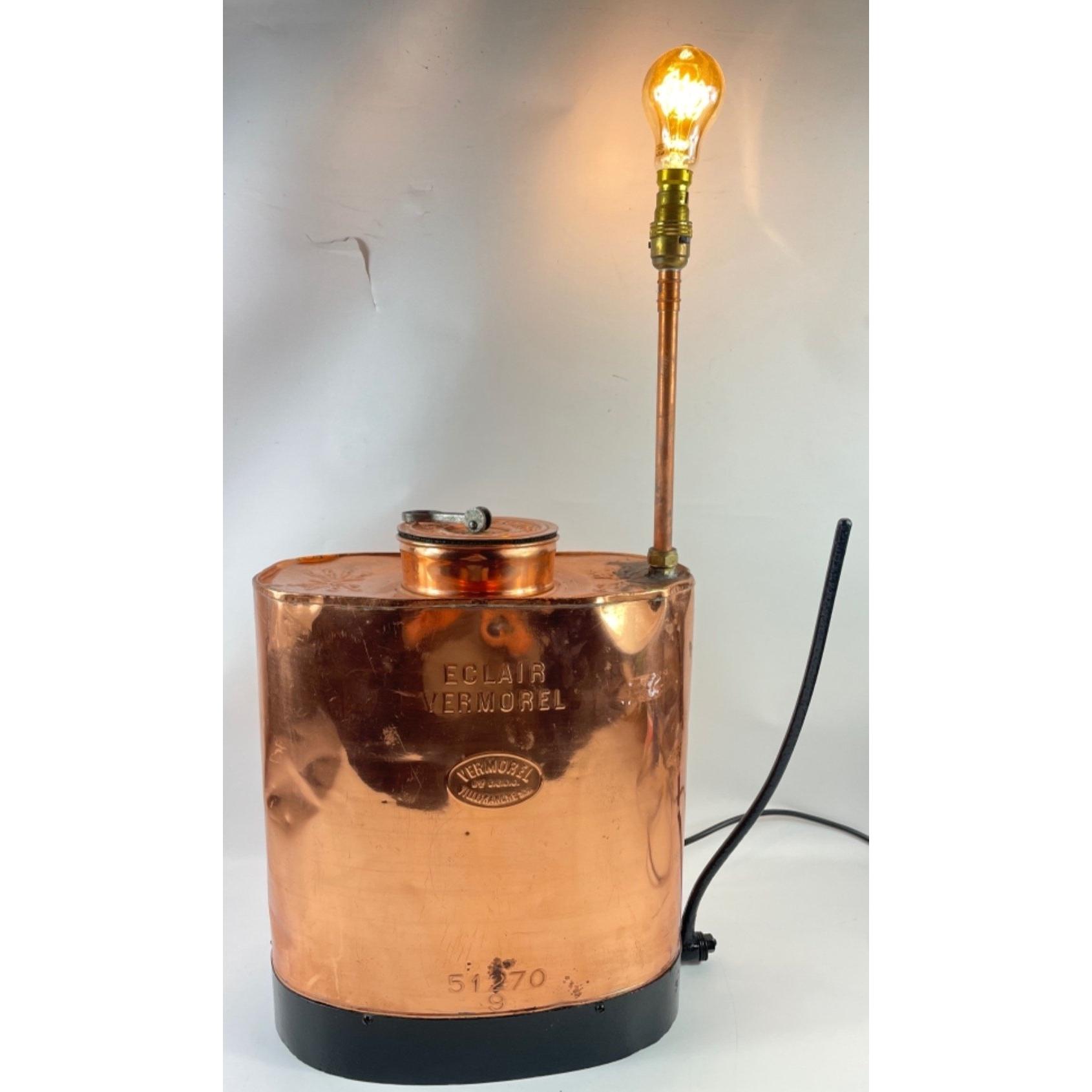 A VINTAGE COPPER pump action sprayer converted to a Steam Punk Lamp - dimensions 80cm height(from base to lightbulb) width at widest point 23cmApprox 1 pieces