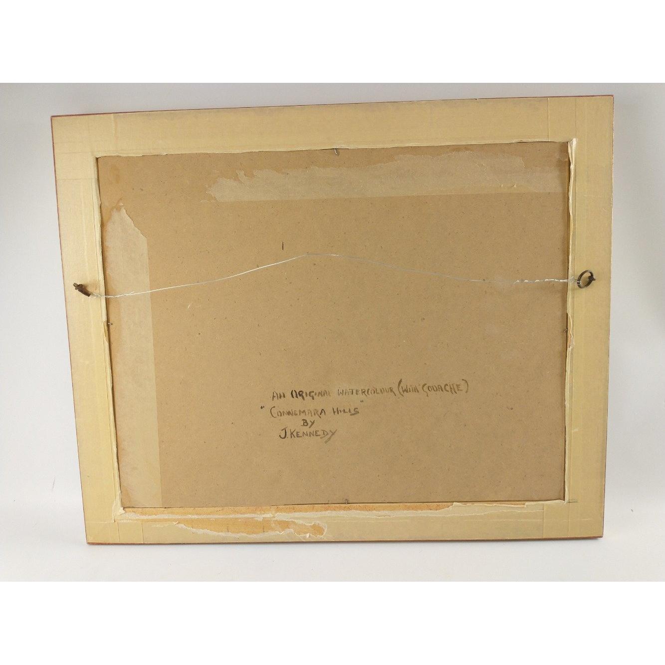 A 20th century Irish original watercolour with gouache framed behind glass of the Connemara Hills by J. Kennedy, frame size 60x48cm approx, visible work 31x18cm approxApprox 1 pieces