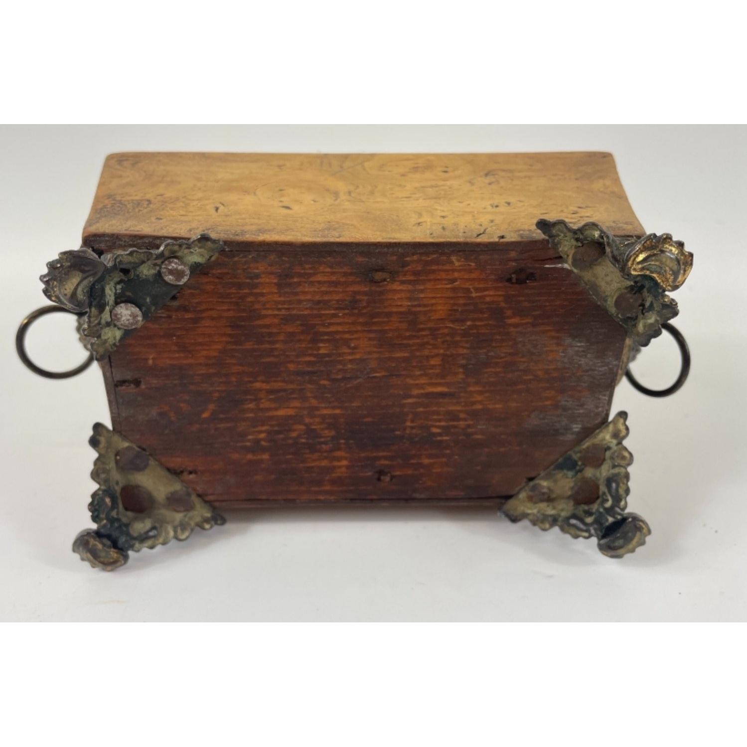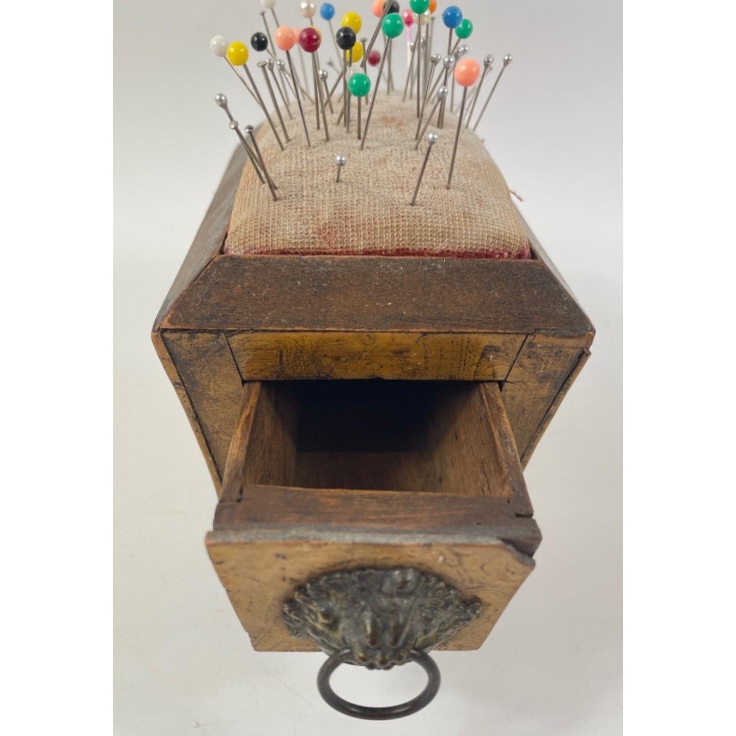 QUALITY! A small early 20th century walnut veneer style pin box cushion with a feature LION RING PULL HANDLE concealed drawer mounted on four brass paw feet - dimensions 13cm long x 8cm depth x 10cm height approx