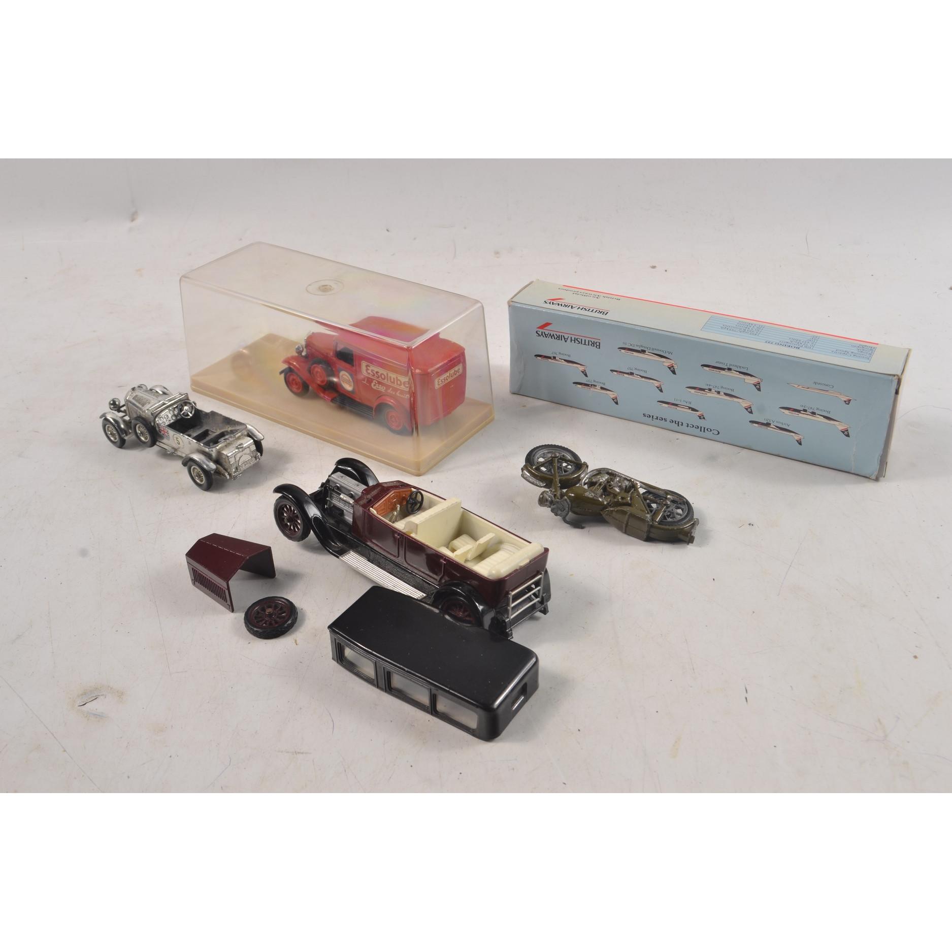 A selection of transport models. One BOEING 737 in British Airways livery with box, still in original wrapping. Fuselage measures 17cm. One model car with removable parts (12cm.). One LICOR (French make) Essolube van (10cm.). One motorcycle (8cm.) and 1 'Models of yesteryear' 1929 4.5 litre Bentley (9cm.) (missing its innards).`.